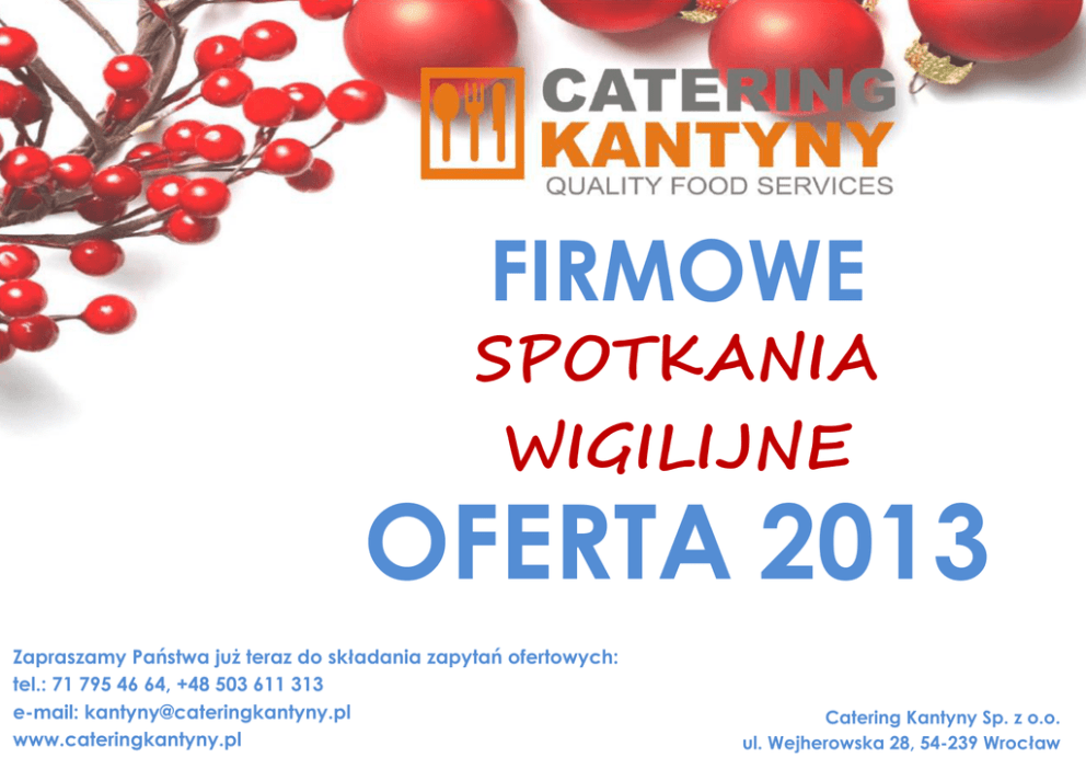 FIRMOWE SPOTKANIA WIGILIJNE OFERTA 2013 Zapraszamy Państwa już teraz do składania zapytań ofertowych: tel.: 71 795 46 64, +48 503 611 313 e-mail: [email protected] www.cateringkantyny.pl Catering Kantyny Sp. z o.o. ul. Wejherowska 28, 54-239 Wrocław Zapraszamy do organizacji niezwykłej imprezy świątecznej dla pracowników, klientów, przyjaciół firmy… Specjalnie dla Państwa przygotowaliśmy ofertę organizacji spotkania wigilijnego z Cateringiem Kantyny. Polecamy kilka przykładowych propozycji menu w świątecznym wydaniu, miłą i profesjonalną obsługę a przede wszystkim nasze doświadczenie w organizacji eventów firmowych. Z przyjemnością przygotujemy indywidualną ofertę świąteczną dostosowaną do Państwa potrzeb. Serdecznie zapraszamy do uzyskania szczegółowych informacji: telefon: 71 795 46 64, +48 503 611 313 e-mail: [email protected] PRZYKŁADOWE PROPOZYCJE DLA GRUPY 100 OSÓB PROPOZYCJA II – 55 zł netto za osobę Bufet gorący – 220 porcji Zupa grzybowa z łazankami, 200ml - 100 porcji Kapusta z grochem i grzybami, 200g - 30 porcji Pierogi z kapustą i grzybami, 250g – 30 porcji Karp smażony 100g - 60 porcji Bufet gorący – 200 porcji Bufet zimny – 600 porcji Barszcz czerwony czysty, 200ml - 100 porcji Mini galaretki z ryby 60g - 50 porcji Pierogi z kapustą i grzybami, 250g - 100 porcji Śledzie po królewsku 70/170g – 50 porcji Bufet zimny – 400 porcji Sałatka ziemniaczana z aromatycznymi śledziami 100g - 50 porcji Tradycyjna sałatka jarzynowa 100g – 75 porcji Sałatka z tuńczyka z czerwoną fasolą 100g - 50 porcji Sałatka brokułowa 100g – 75 porcji Tradycyjna sałatka jarzynowa100g - 50 porcji Wigilijne Śledzie w oleju 70/100g - 100 porcji Karp po staropolsku 100/150g 100 porcji Pieczarki z aromatycznym farszem – 50 porcji Rożki francuskie serowo – szpinakowe - 50 sztuk Rożki francuskie serowo – szpinakowe - 50 sztuk Kruche babeczki z musem łososiowym – 50 sztuk Rożki francuskie z pikantnym farszem - 50 sztuk Vol-au-vent z farszem paprykowym 50 sztuk Dodatki: Jajka faszerowane kremem ziołowym 50 sztuk Pieczywo, 50g – 100 porcji Jajka faszerowane kremem pieczarkowym 50 sztuk Wybór świątecznych słodkości - 100 porcji Dodatki: Makowiec, 100 g Pieczywo, 50g – 100 porcji Piernik, 100 g Wybór świątecznych słodkości - 100 porcji Keks, 100 g Kutia, 100 g Napoje: Sernik, 100 g Tradycyjny kompot z suszonych owoców, 200 ml – 100 porcji Makowiec z bakaliami, 100 g Opłatek gratis Napoje: Tradycyjny kompot z suszonych owoców, 200 ml - 100 porcji Kawa, śmietanka, cukier, 200 ml – 100 porcji Herbata, cytryna, cukier, 200 ml – 100 porcji Opłatek gratis PROPOZYCJA I – 39 zł netto za osobę W ramach podanych cen netto zapewniamy: - sprzęt cateringowy niezbędny do zrealizowania zlecenia - zastawę porcelanową - świąteczny wystrój bufetów - obsługę kelnerską PRZYKŁADOWE PROPOZYCJE DLA GRUPY 500 OSÓB PROPOZYCJA II – 51 zł netto za osobę PROPOZYCJA I – 36 zł netto za osobę W ramach podanych cen netto zapewniamy: - sprzęt cateringowy niezbędny do zrealizowania zlecenia - zastawę porcelanową - świąteczny wystrój bufetów - obsługę kelnerską Bufet gorący – 1000 porcji Barszcz czerwony z uszkami, 200ml - 500 porcji Gołąbki z kaszą gryczaną i grzybami, 200g - 250 porcji Pierogi z kapustą i grzybami, 250g - 250 porcji Bufet zimny – 1500 porcji Tradycyjna sałatka jarzynowa 100g - 250 porcji Sałatka pikantna z pieczarkami – 250 porcji Wigilijne śledzie wyserwowane na dwa sposoby: Śledzie w śmietanie 70/100g - 250 porcji Śledzie po wiejsku 70/100g - 250 porcji Rożki francuskie serowo – szpinakowe - 250 sztuk Vol-au-vent z farszem tuńczykowym - 250 sztuk Dodatki: Pieczywo, 50g – 500 porcji Wybór świątecznych słodkości - 500 porcji Makowiec domowy, 100 g Piernik, 100 g Szarlotka, 100 g Napoje: Tradycyjny kompot z suszonych owoców 200 ml - 500 porcji Opłatek gratis Bufet gorący – 1100 porcji Zupa rybna z kluseczkami, 200ml - 500 porcji Pierogi z kapustą i grzybami, 250g - 200 porcji Łazanki z kapustą 200g – 100 porcji Karp smażony 100g - 300 porcji Bufet zimny – 2500 porcji Tiftele rybne w galarecie 60g – 200 porcji Ryba po grecku 100/150g - 200 porcji Sałatka śledziowa 100g - 250 porcji Sałatka z tuńczykiem 100g - 250 porcji Tradycyjna sałatka jarzynowa 100g - 250 porcji Pasztet rybny 50g - 400 porcji Vol-au-vent z farszem chrzanowym - 250 sztuk Rożki francuskie z farszem warzywnym - 250 sztuk Jajka faszerowane kremem ziołowym - 250 sztuk Tartinki dekoracyjne z serem pleśniowym - 200 sztuk Dodatki: Pieczywo, 50g – 500 porcji Wybór świątecznych słodkości - 500 porcji Makowiec z bakaliami, 100 g Kutia, 100 g Świąteczne pierniczki, 100 g Napoje: Tradycyjny kompot z suszonych owoców, 200 ml - 500 porcji Kawa, śmietanka, cukier, 200 ml – 500 porcji Herbata, cytryna, cukier, 200 ml – 500 porcji Opłatek gratis PRZYKŁADOWE PROPOZYCJE DLA GRUPY 1000 OSÓB Oczywiście chętnie podejmujemy się realizacji dla większych grup gości (2000, 3000… osób). PROPOZYCJA II – 47 zł netto za osobę PROPOZYCJA I – 33 zł netto za osobę W ramach podanych cen netto zapewniamy: - sprzęt cateringowy niezbędny do zrealizowania zlecenia - zastawę porcelanową - świąteczny wystrój bufetów - obsługę kelnerską Bufet gorący – 2000 porcji Barszcz czerwony czysty, 200ml - 1000 porcji Pierogi z kapustą i grzybami, 250g - 1000 porcji Bufet zimny – 3000 porcji Tradycyjna sałatka jarzynowa 100g - 1000 porcji Wigilijne śledzie wyserwowane na dwa sposoby: Śledzie w śmietanie 70/100g - 500 porcji Śledzie w oleju 70/100g - 500 porcji Rożki francuskie serowo – szpinakowe - 500 sztuk Rożki francuskie z farszem warzywnym - 500 sztuk Dodatki: Pieczywo, 50g – 1000 porcji Wybór świątecznych słodkości - 1000 porcji Makowiec domowy, 100 g Szarlotka, 100 g Keks, 100 g Napoje: Tradycyjny kompot z suszonych owoców, 200 ml - 1000 