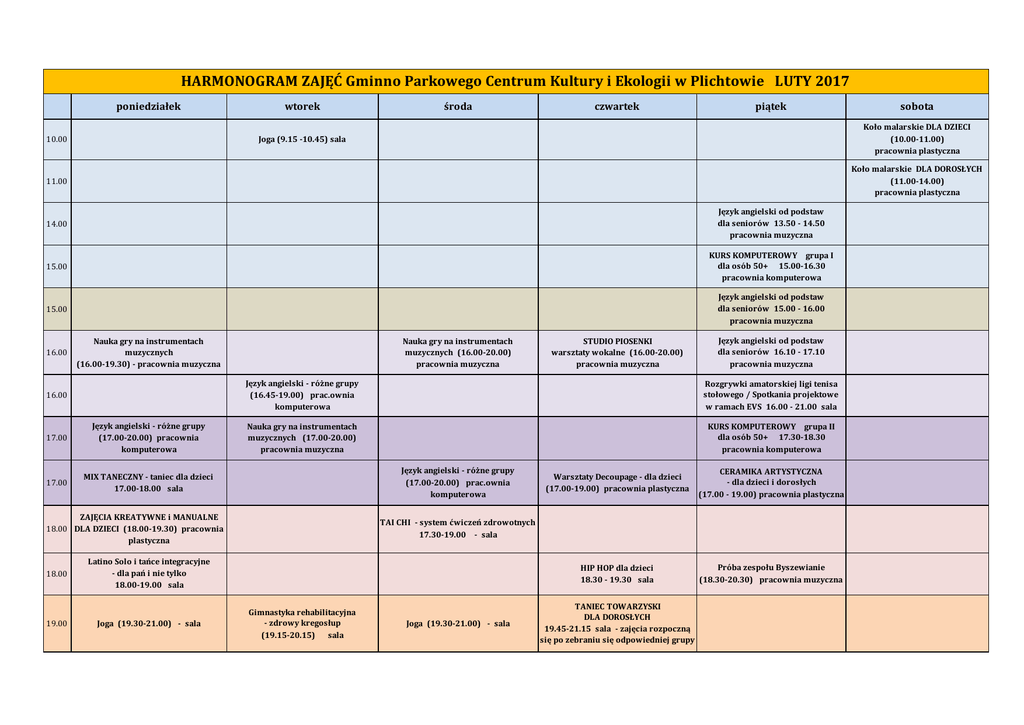 HARMONOGRAM ZAJĘĆ Gminno Parkowego Centrum Kultury i Ekologii w Plichtowie LUTY 2017 poniedziałek 10.00 wtorek środa czwartek piątek Koło malarskie DLA DZIECI (10.00-11.00) pracownia plastyczna Joga (9.15 -10.45) sala Koło malarskie DLA DOROSŁYCH (11.00-14.00) pracownia plastyczna 11.00 14.00 Język angielski od podstaw dla seniorów 13.50 - 14.50 pracownia muzyczna 15.00 KURS KOMPUTEROWY grupa I dla osób 50+ 15.00-16.30 pracownia komputerowa 15.00 Język angielski od podstaw dla seniorów 15.00 - 16.00 pracownia muzyczna 16.00 sobota Nauka gry na instrumentach muzycznych (16.00-19.30) - pracownia muzyczna 16.00 17.00 Język angielski - różne grupy (17.00-20.00) pracownia komputerowa 17.00 MIX TANECZNY - taniec dla dzieci 17.00-18.00 sala Nauka gry na instrumentach muzycznych (16.00-20.00) pracownia muzyczna Latino Solo i tańce integracyjne - dla pań i nie tylko 18.00-19.00 sala 19.00 Joga (19.30-21.00) - sala Język angielski od podstaw dla seniorów 16.10 - 17.10 pracownia muzyczna Język angielski - różne grupy (16.45-19.00) prac.ownia komputerowa Rozgrywki amatorskiej ligi tenisa stołowego / Spotkania projektowe w ramach EVS 16.00 - 21.00 sala Nauka gry na instrumentach muzycznych (17.00-20.00) pracownia muzyczna KURS KOMPUTEROWY grupa II dla osób 50+ 17.30-18.30 pracownia komputerowa Język angielski - różne grupy (17.00-20.00) prac.ownia komputerowa ZAJĘCIA KREATYWNE i MANUALNE 18.00 DLA DZIECI (18.00-19.30) pracownia plastyczna 18.00 STUDIO PIOSENKI warsztaty wokalne (16.00-20.00) pracownia muzyczna Warsztaty Decoupage - dla dzieci (17.00-19.00) pracownia plastyczna CERAMIKA ARTYSTYCZNA - dla dzieci i dorosłych (17.00 - 19.00) pracownia plastyczna HIP HOP dla dzieci 18.30 - 19.30 sala Próba zespołu Byszewianie (18.30-20.30) pracownia muzyczna TAI CHI - system ćwiczeń zdrowotnych 17.30-19.00 - sala Gimnastyka rehabilitacyjna - zdrowy kregosłup (19.15-20.15) sala Joga (19.30-21.00) - sala TANIEC TOWARZYSKI DLA DOROSŁYCH 19.45-21.15 sala - zajęcia rozpoczną się po zebraniu się odpowiedniej grupy