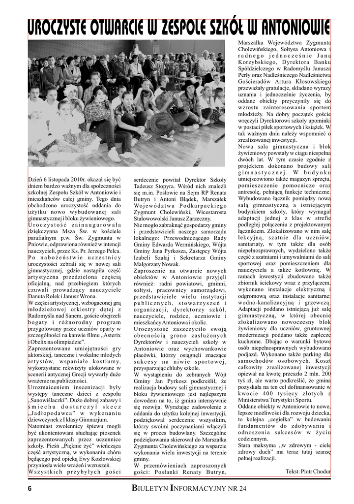 Dzień 6 listopada 2010r. okazał się być dniem bardzo ważnym dla społeczności szkolnej Zespołu Szkół w Antoniowie i mieszkańców całej gminy. Tego dnia obchodzono uroczystość oddania do użytku nowo wybudowanej sali gimnastycznej i bloku żywieniowego. Uroczystość zainaugurowała dziękczynna Msza Św. w kościele parafialnym p.w. Św. Zygmunta w Pniowie, odprawiona również w intencji nauczycieli, przez Ks. Pr. Jerzego Pelca. Po nabożeństwie uczestnicy uroczystości zebrali się w nowej sali gimnastycznej, gdzie nastąpiła część artystyczna przedzielona częścią oficjalną, nad przebiegiem których czuwali prowadzący nauczyciele Danuta Rolek i Janusz Wrona. W części artystycznej, wzbogaconej grą młodzieżowej orkiestry dętej z Radomyśla nad Sanem, goście obejrzeli bogaty i różnorodny program przygotowany przez uczniów oparty w szczególności na kanwie filmu „Asterix i Obelix na olimpiadzie”. Zaprezentowane umiejętności gry aktorskiej, taneczne i wokalne młodych a r t y s t ó w, w s p a n i a ł e k o s t i u m y, wykorzystane rekwizyty ulokowane w scenerii antycznej Grecji wywarły duże wrażenie na publiczności. Urozmaiceniem inscenizacji były występy taneczne dzieci z zespołu „Sanowiślaczki”. Dużo dobrej zabawy i śmiechu dostarczył skecz „Jadłopodawca” w wykonaniu dziewczynek z I klasy Gimnazjum. Natomiast zwolennicy śpiewu mogli być ukontentowani słuchając piosenek zaprezentowanych przez uczennice szkoły. Pieśń „Pięknie żyć” wieńcząca część artystyczną, w wykonaniu chóru będącego pod opieką Ewy Kozłowskiej przyniosła wiele wrażeń i wzruszeń. Wszystkich przybyłych gości 6 serdecznie powitał Dyrektor Szkoły Tadeusz Stopyra. Wśród nich znaleźli się m.in. Posłowie na Sejm RP Renata Butryn i Antoni Błądek, Marszałek Wo j e w ó d z t w a P o d k a r p a c k i e g o Zygmunt Cholewiński, Wicestarosta Stalowowolski Janusz Zarzeczny. Nie mogło zabraknąć gospodarzy gminy i przedstawicieli naszego samorządu lokalnego: Przewodniczącego Rady Gminy Edwarda Wermińskiego, Wójta Gminy Jana Pyrkosza, Zastępcy Wójta Izabeli Szałaj i Sekretarza Gminy Małgorzaty Nowak. Zaproszenie na otwarcie nowych obiektów w Antoniowie przyjęli również: radni powiatowi, gminni, sołtysi, pracownicy samorządowi, przedstawiciele wielu instytucji publicznych, stowarzyszeń i o rg a n i z a c j i , d y r e k t o r z y s z k ó ł , nauczyciele, rodzice, uczniowie i mieszkańcy Antoniowa i okolic. Uroczystość zaszczyciło swoją obecnością grono zasłużonych Dyrektorów i nauczycieli szkoły w Antoniowie oraz wychowankowie placówki, którzy osiągnęli znaczące sukcesy na niwie sportowej, przysparzając chluby szkole. W wystąpieniu do zebranych Wójt Gminy Jan Pyrkosz podkreślił, że realizacja budowy sali gimnastycznej i bloku żywieniowego jest najlepszym dowodem na to, iż gmina intensywnie się rozwija. Wyrażając zadowolenie z oddania do użytku kolejnej inwestycji, podziękował serdecznie wszystkim, którzy swoimi poczynaniami włączyli się w proces budowlany. Szczególne podziękowania skierował do Marszałka Zygmunta Cholewińskiego za wsparcie wykonania wielu inwestycji na terenie gminy. W przemówieniach zaproszonych gości: Posłanki Renaty Butryn, Marszałka Województwa Zygmunta Cholewińskiego, Sołtysa Antoniowa i radnego jednocześnie Jana Korzybskiego, Dyrektora Banku Spółdzielczego w Radomyślu Janusza Perły oraz Nadleśniczego Nadleśnictwa Gościeradów Artura Kłosowskiego przeważały gratulacje, składano wyrazy uznania i jednocześnie życzenia, by oddane obiekty przyczyniły się do wzrostu zainteresowania sportem młodzieży. Na dobry początek goście wręczyli Dyrektorowi szkoły upominki w postaci piłek sportowych i książek. W tak ważnym dniu należy wspomnieć o zrealizowanej inwestycji. Nowa sala gimnastyczna i blok żywieniowy powstały w ciągu niespełna dwóch lat. W tym czasie zgodnie z projektem dokonano budowy sali gimnastycznej. W budynku umiejscowiono także magazyn sprzętu, pomieszczenie pomocnicze oraz antresolę, pełniącą funkcje techniczne. Wybudowano łącznik pomiędzy nową salą gimnastyczną a istniejącym budynkiem szkoły, który wymagał adaptacji jednej z klas w strefie podległej połączeniu z projektowanym łącznikiem. Zlokalizowano w nim salę lekcyjną, szatnie dla uczniów, sanitariaty, w tym także dla osób niepełnosprawnych, wydzielono także część z szatniami i umywalniami do sali sportowej oraz pomieszczeniem dla nauczyciela a także kotłownię. W ramach inwestycji zbudowano także zbiornik ściekowy wraz z przyłączem, wykonano instalacje elektryczną i odgromową oraz instalacje sanitarne: wodno-kanalizacyjną i grzewczą. Adaptacji poddano istniejącą już salę gimnastyczną, w której obecnie zlokalizowano nowoczesny blok żywieniowy dla uczniów, gruntownej modernizacji poddano także zaplecze kuchenne. Dbając o warunki bytowe osób niepełnosprawnych wybudowano podjazd. Wykonano także parking dla samochodów osobowych. Koszt całkowity zrealizowanej inwestycji opiewał na kwotę przeszło 2 mln. 200 tyś zł, ale warto podkreślić, że gmina pozyskała na ten cel dofinansowanie w kwocie 400 tysięcy złotych z Ministerstwa Turystyki i Sportu. Oddane obiekty w Antoniowie to nowe, lepsze możliwości dla rozwoju dziecka, to kolejna „cegiełka” w budowaniu fundamentów do zdobywania i odnoszenia sukcesów w życiu codziennym. Stara maksyma „w zdrowym - ciele zdrowy duch” ma teraz tutaj szansę pełnej realizacji. BIULETYN INFORMACYJNY NR 24 Tekst: Piotr Chodur Fot. Tomasz Połomski UROCZYSTE OTWARCIE W ZESPOLE SZKÓŁ W ANTONIOWIE