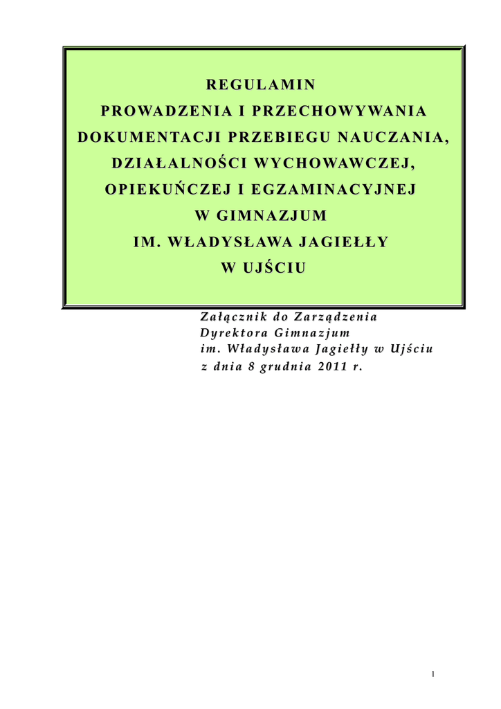 REGULAMIN P R O WA D Z E N I A I P R Z E C H O W Y WA N I A D O K U M E N TA C J I P R Z E B I E G U N A U C Z A N I A , D Z I A Ł A L N O Ś C I W Y C H O WAW C Z E J , OPIEKUŃCZEJ I EGZAMINACYJNEJ W GIMNAZJUM I M . W Ł A D Y S Ł AWA J A G I E Ł Ł Y W UJŚCIU Załącznik do Zarządzenia Dyrektora Gimnazjum im. Władysława Jagiełły w Ujściu z dnia 8 grudnia 2011 r. 1 S PI S TR E Ś CI 1. 2. 3. 4. 5. 6. 7. 8. 9. 10. 11. 12. 13. 14. 15. Postanowienia ogólne Księga ewidencji dzieci i młodzieży Księga uczniów Dziennik lekcyjny Dziennik pracy pedagoga i nauczyciela biblioteki Dziennik indywidualnego nauczania, dziennik zajęć dydaktyczno – wyrównawczych i specjalistycznych, dziennik zajęć pozalekcyjnych (kół zainteresowań), dziennik zajęć świetlicy szkolnej Arkusze ocen Księga arkuszy ocen Protokoły egzaminów poprawkowych, klasyfikacyjnych i sprawdzających Świadectwa szkolne Legitymacje szkolne Inna dokumentacja Ochrona dokumentacji Dokumentacja egzaminu zewnętrznego Odtworzenie zniszczonej dokumentacji 3 4 4 5 7 8 9 11 11 12 15 15 16 16 17 POSTANOWIENIA OGÓLNE §1 1. Niniejszy regulamin opracowano na podstawie: 1) ustawy z dnia 7 września 1991 roku o systemie oświaty (tj. Dz. U. z 2004r. Nr 256, poz. 2572 z późniejszymi zmianami), 2) art.100 ustawy z dnia 26 czerwca 1974 r. Kodeksu pracy (tj.Dz. U. z 1998 r. Nr 21, poz. 94 z późniejszymi zmianami), 3) rozporządzenia Ministra Edukacji Narodowej z dnia 30 kwietnia 2007 roku w sprawie warunków i sposobu oceniania, klasyfikowania i promowania uczniów i słuchaczy oraz przeprowadzania sprawdzianów i egzaminów w szkołach publicznych (Dz. U. z 2007r. Nr 83, poz. 562 z późniejszymi zmianami), 4) rozporządzenia MENiS z dnia 19 lutego 2002 r. w sprawie sposobu prowadzenia przez publiczne przedszkola, szkoły i placówki dokumentacji przebiegu nauczania, działalności wychowawczej i opiekuńczej oraz rodzajów tej dokumentacji (Dz. U. z 2003r. Nr 107, poz. 1003 oraz Dz. U. nr 23 poz. 225), 5) rozporządzenia MENiS z dnia 14 marca 2005 r. w sprawie zasad wydawania oraz wzorów świadectw, dyplomów państwowych i innych druków szkolnych, sposobu dokonywania ich sprostowań i wydawania duplikatów, a także zasad legalizacji dokumentów przeznaczonych do obrotu prawnego z zagranica oraz zasad odpłatności za wykonywanie tych czynności (Dz. U. z 2005r. Nr 58, poz. 504 z późniejszymi zmianami). 2. Dokumentację przebiegu nauczania, działalności wychowawczej i opiekuńczej stanowią: księga ewidencji dzieci i młodzieży, księga uczniów, dziennik lekcyjny (także: dziennik pedagoga, dziennik biblioteki, dziennik indywidualnego nauczania, dziennik zajęć dydaktyczno – wyrównawczych i specjalistycznych, dziennik zajęć pozalekcyjnych (kół zainteresowań), dziennik zajęć świetlicy szkolnej), arkusz ocen ucznia (słuchacza), księga arkuszy ocen uczniów, protokoły egzaminów poprawkowych i klasyfikacyjnych, protokoły egzaminów zewnętrznych, uchwały rady pedagogicznej dotyczące klasyfikowania i promowania uczniów oraz ukończenia szkoły, zezwolenia na indywidualny program lub tok nauki, decyzje o nauczaniu indywidualnym lub rewalidacji indywidualnej. KSIĘGA EWIDENCJI DZIECI I MŁODZIEŻY §2 1. 2. 3. Gimnazjum prowadzi księgę ewidencji dzieci i młodzieży podlegających obowiązkowi szkolnemu, zamieszkałych w obwodzie szkoły. Księgę zakłada i prowadzi sekretarz szkoły. W księdze ewidencji odnotowuje się corocznie informacje o spełnianiu przez dziecko obowiązku szkolnego w tej albo innej szkole, informacje o spełnianiu obowiązku szkolnego poza szkołą na podstawie zezwolenia wydanego przez dyrektora szkoły oraz o odroczeniu spełniania obowiązku szkolnego ze wskazaniem decyzji, na podstawie, której nastąpiło odroczenie. Sprostowań w księdze ewidencji dzieci i młodzieży dokonuje dyrektor przez skreślenie kolorem czerwonym nieprawidłowego zapisu i czytelne wpisanie nad skreślonymi wyrazami właściwych danych, daty i czytelnego podpisu. Nie stosuje korektora. KSIEGA UCZNIÓW §3 Szkoła prowadzi księgę uczniów. Księgę zakłada i prowadzi sekretarz szkoły. 2. Do księgi uczniów wpisuje się imię (imiona) i nazwisko, datę i miejsce urodzenia oraz adres zamieszkania ucznia, imiona i nazwiska rodziców (prawnych opiekunów) i adresy ich zamieszkania, a także datę przyjęcia ucznia do szkoły oraz klasę, do której ucznia przyjęto. W księdze uczniów odnotowuje się datę ukończenia szkoły albo datę i przyczynę opuszczenia szkoły przez ucznia. 3. Sprostowań w księdze uczniów dokonuje dyrektor przez skreślenie kolorem czerwonym nieprawidłowego zapisu i czytelne wpisanie nad skreślonymi wyrazami właściwych danych, daty i czytelnego podpisu. Nie stosuje korektora. 1. DZIENNIK LEKCYJNY §4 Wychowawca klasy prowadzi dziennik lekcyjny, w którym dokumentuje się przebieg nauczania w danym roku szkolnym. 2. Do dziennika lekcyjnego wychowawca do 15 września wpisuje w porządku alfabetycznym nazwiska i imiona uczniów, daty i miejsca urodzenia, numer ewidencyjny ucznia oraz adresy ich zamieszkania, imiona i nazwiska rodziców (prawnych opiekunów), adresy ich zamieszkania oraz numery telefonów, a także tygodniowy plan zajęć edukacyjnych, oznaczenie realizowanych programów nauczania zawartych w szkolnym zestawie programów nauczania dla danego oddziału oraz imiona i nazwiska nauczycieli prowadzących poszczególne zajęcia. Do 20 września wychowawca ma obowiązek uzupełnić w dzienniku dane na temat stanu liczebnego uczniów, stanu według roku urodzenia i nauki języków obcych. 3. W rubrykach przeznaczonych na wpisywanie tygodniowego rozkładu zajęć wychowawca klasy wpisuje nazwy przedmiotów z wielkiej litery, w pełnym brzmieniu bez stosowania skrótów. W przypadku braku miejsca na dokonanie takiego zapisu (np. podział uczniów na grupy), dopuszcza się używanie następujących skrótów: a) Język niemiecki – J. niem., b) Ję