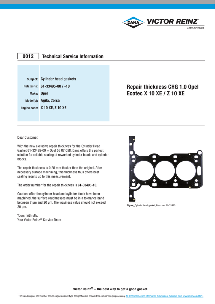 0012 Subject: Relates to: Make: Model(s): Engine code: Technical Service Information Cylinder head gaskets Repair thickness CHG 1.0 Opel Ecotec X 10 XE / Z 10 XE 61-33495-00 / -10 Opel Agila, Corsa X 10 XE, Z 10 XE Dear Customer, With the new exclusive repair thickness for the Cylinder Head Gasket 61-33495-00 = Opel 56 07 058, Dana offers the perfect solution for reliable sealing of reworked cylinder heads and cylinder blocks. The repair thickness is 0.25 mm thicker than the original. After necessary surface machining, this thickness thus offers best sealing results up to this measurement. The order number for the repair thickness is 61-33495-10. Caution: After the cylinder head and cylinder block have been machined, the surface roughnesses must be in a tolerance band between 7 μm and 20 μm. The waviness value should not exceed 20 μm. Figure_Cylinder head gasket, Reinz no. 61-33495 Yours faithfully, Your Victor Reinz® Service Team Victor Reinz® – the best way to get a good gasket. The listed original part number and/or engine number/type designation are provided for comparison purposes only. All Technical Service Information bulletins are available from www.reinz.com/TSI/E.