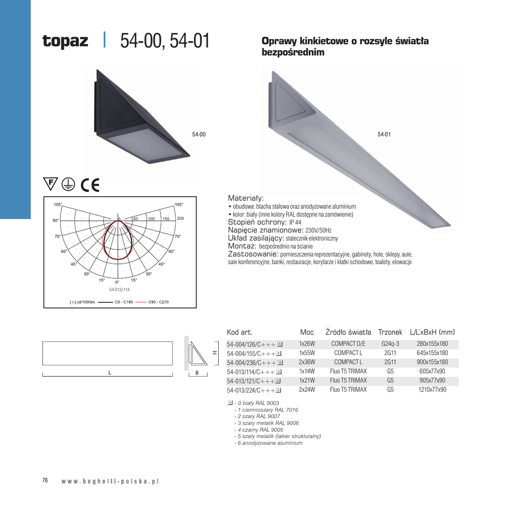 topaz 54-00, 54-01 Oprawy kinkietowe o rozsyle światła bezpośrednim 54-00 54-01 Materiały: 50 50 100 100 150 150 200 200 Materiały: • obudowa: blacha stalowa oraz anodyzowane aluminium • obudowa: blacha stalowa oraz anodyzowane aluminium • kolor: biały (inne kolory RAL dostępne na zamówienie) • kolor: białyIP(inne Stopień ochrony: 44 kolory RAL dostępne na zamówienie) Stopień ochrony: IP 44 Napięcie znamionowe: 230V/50Hz Układ zasilający: elektroniczny N i statecznik i i Montaż: bezpośrednio na ścianie Zastosowanie: pomieszczenia reprezentacyjne, gabinety, hole, sklepy, aule, sale konferencyjne, banki, restauracje, korytarze i klatki schodowe, toalety, elewacje 54-013/114 Kod art. Moc Źródło światła Trzonek L/L’xBxH (mm) 54-004/126/C+++ 1x26W COMPACT D/E G24q-3 280x155x180 54-004/155/C+++ 1x55W COMPACT L 2G11 645x155x180 54-004/236/C+++ 2x36W COMPACT L 2G11 900x155x180 54-013/114/C+++ 1x14W Fluo T5 TRIMAX G5 605x77x90 54-013/121/C+++ 1x21W Fluo T5 TRIMAX G5 905x77x90 54-013/224/C+++ 2x24W Fluo T5 TRIMAX G5 1210x77x90 - 0 biały RAL 9003 - 76 1 2 3 4 5 6 ciemnoszary RAL 7016 szary RAL 9007 szary metalik RAL 9006 czarny RAL 9005 szary metalik (lakier strukturalny) anodyzowane aluminium