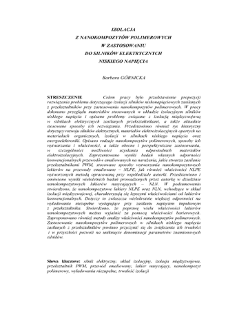 IZOLACJA Z NANOKOMPOZYTÓW POLIMEROWYCH W ZASTOSOWANIU DO SILNIKÓW ELEKTRYCZNYCH NISKIEGO NAPIĘCIA Barbara GÓRNICKA STRESZCZENIE Celem pracy było przedstawienie propozycji rozwiązania problemu dotyczącego izolacji silników niskonapięciowych zasilanych z przekształtników przy zastosowaniu nanokompozytów polimerowych. W pracy dokonano przeglądu materiałów stosowanych w układzie izolacyjnym silników niskiego napięcia i opisano problemy związane z izolacją międzyzwojową w silnikach elektrycznych zasilanych przekształtnikami, a także aktualnie stosowane sposoby ich rozwiązania. Przedstawiono również rys historyczny dotyczący rozwoju silników elektrycznych, materiałów elektroizolacyjnych opartych na materiałach organicznych, izolacji w silnikach niskiego napięcia oraz energoelektroniki. Opisano rodzaje nanokompozytów polimerowych, sposoby ich wytwarzania i właściwości, a także obecne i perspektywiczne zastosowania, w szczególności możliwości uzyskania odpowiednich materiałów elektroizolacyjnych. Zaprezentowano wyniki badań własnych odporności konwencjonalnych przewodów emaliowanych na narażenia, jakie stwarza zasilanie przekształtnikami PWM, stosowane sposoby wytwarzania nanokompozytowych lakierów na przewody emaliowane – NLPE, jak również właściwości NLPE wytworzonych metodą opracowaną przy współudziale autorki. Przedstawiono i omówiono wyniki wieloletnich badań prowadzonych przez autorkę w dziedzinie nanokompozytowych lakierów nasycających – NLN. W podsumowaniu stwierdzono, że nanokompozytowe lakiery NLPE oraz NLN, wchodzące w skład izolacji międzyzwojowej, charakteryzują się lepszymi właściwościami od lakierów konwencjonalnych. Dotyczy to zwłaszcza wielokrotnie większej odporności na wyładowania niezupełne występujące przy zasilaniu napięciem impulsowym z przekształtnika. Stwierdzono, że poprawę wielu właściwości lakierów nanokompozytowych można wyjaśnić za pomocą właściwości barierowych. Zaproponowano również metody analizy właściwości nanokompozytów polimerowych. Zastosowanie nanokompozytów polimerowych w silnikach niskiego napięcia zasilanych z przekształtników powinno przyczynić się do zwiększenia ich trwałości i w przyszłości pozwoli na uniknięcie denominacji parametrów znamionowych silników. Słowa kluczowe: silnik elektryczny, układ izolacyjny, izolacja międzyzwojowa, przekształtnik PWM, przewód emaliowany, lakier nasycający, nanokompozyt polimerowy, wyładowania niezupełne, trwałość izolacji