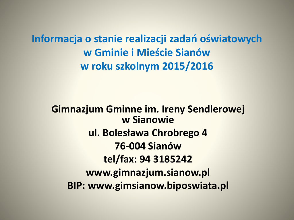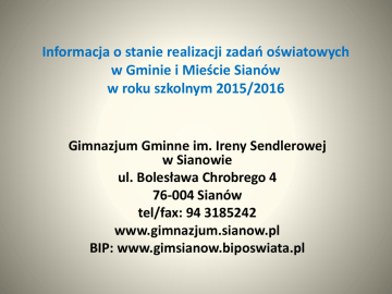 Informacja o stanie realizacji zadań oświatowych w Gminie i Mieście Sianów w roku szkolnym 2015/2016 Gimnazjum Gminne im. Ireny Sendlerowej w Sianowie ul. Bolesława Chrobrego 4 76-004 Sianów tel/fax: 94 3185242 www.gimnazjum.sianow.pl BIP: www.gimsianow.biposwiata.pl Wyniki egzaminu % Stanin - kraj Stanin – zachodniopomorskie Historia i wiedza o społeczeństwie 59,42 6 7 Język polski 63,39 4 5 Matematyka 37,44 3 5 Przedmioty przyrodnicze 45,95 4 5 Język angielski pp 52,20 4 4 Język niemiecki pp 60,25 5 6 Gimnazjum Gminne im Ireny Sendlerowej w Sianowie Tendencje rozwojowe szkoły - przedmioty humanistyczne historia i wiedza o społeczeństwie j. polski 80 60 65,99 64,86 52,42 58,59 63,39 40 20 0 2012 2013 2014 2015 2016 70 63,04 60 50 40 30 20 10 0 2012 67,53 60,03 58,25 2013 2014 59,42 2015 2016 - przedmioty matematyczno-przyrodnicze przedmioty przyrodnicze matematyka 70 60 50 41,16 40 30 20 10 0 2012 43,36 2013 40,48 2014 39,18 2015 37,44 2016 70 60 50 48,56 40 30 20 10 0 2012 54,31 2013 Gimnazjum Gminne im Ireny Sendlerowej w Sianowie 50,4 2014 45,59 2015 45,95 2016 języki obce j. angielski pp 80 60 58,27 57,44 63,71 56,87 52,2 40 20 0 2012 2013 2014 2015 2016 Konkursy • • • • • • • Wojewódzki konkurs twórczości Karola Wojtyły – Jana Pawła II (14 edycja) Szkolny Konkurs Frazeologiczny Konkurs Wiedzy o Konstytucji 3 maja Szkolny Konkurs Mitologiczny Konkurs Wiedzy o Patronce Irenie Sendlerowej Szkolny Quiz Wiedzy o Narodowym Święcie Niepodległości Gimnazjum Gminne im Ireny Sendlerowej Tydzień Języków Obcych w Sianowie Imprezy: • • • • • • • • • • • • • • • • • • • • • • • Uroczyste rozpoczęcie roku szkolnego Dzień Zwycięstwa – uroczystość z okazji zakończenia II Wojny Światowej Dzień Edukacji Narodowej Święto Szkoły – ślubowanie klas pierwszych Święto Szkoły Obchody Dnia Niepodległości Kropla Ciepła od Ciebie Świąteczne Spotkanie z Gimnazjum Naszym potrzebującym Dzieciom-Dziewczynka z Zapałkami Wigilia Szkolna Dzień Otwarty Szkoły „Under Fish and Chips” - przedstawienie Rajd Nocny Wiosenny Talent Show Góra Grosza Jarmark Bożonarodzeniowy (stoisko) Światowy dzień Walki z AIDS Bezpieczna Szkoła Dzień Bezpiecznego Internetu „Pętla czasu” promocja szkoły oraz terenów leśnych Gminy Sianów Trening klas sportowych na szlaku Pętli Tatrzańskiej. Dzień Dziecka/Dzień Sportu Szkolna Giełda Zawodoznawcza zawody i działania charakterze sportowym: • • • • Regionalny Turniej Tenisa Stołowego Szkolne Zawody w Zbijaka dziewcząt Szkolne Zawody w Zbijaka chłopcy Szkolne Zawody w Tenisie Stołowym realizowane zajęcia dodatkowe, pozalekcyjne, projekty: • • • • Program „Trzymaj Formę” (Sanepid), Projekt „Lepsza szkoła” (matematyka), Klub Turystyczny, „Znajdź właściwe rozwiązanie” – Program profilaktyki palenia tytoniu dla uczniów klas starszych szkoły podstawowej i gimnazjum, • Program „Savoir Vivre”, • Zajęcia wynikające z art.42 pkt 2 Karty Nauczyciela, Udział uczniów w akcjach charytatywnych: • Dziewczynka z zapałkami, • Góra Grosza • WOŚP. Osiągnięcia uczniów, szkoły, placówki - zajęcia pozalekcyjne, osiągnięcia sportowe, kulturalne, wystawy, prezentacje sportowe: • • • • • • • • • I miejsce w Selektywnym Turnieju Unijnym Piłki Halowej – chłopcy I miejsce w szkolnym Turnieju Unijnym Piłki Halowej - dziewczęta I miejsce Turniej Orlika o Puchar Premiera – drużyna chłopców Powiatowe biegi przełajowe - dziewczęta II miejsce, chłopcy III miejsce I miejsce Powiatowy Turniej Tenisa Stołowego - dziewczęta, III miejsce Powiatowy Turniej Tenisa Stołowego - chłopcy Regionalny Turniej Tenisa Stołowego- V miejsce dziewczęta Powiatowy Turniej Unihokeja - chłopcy i dziewczęta II miejsce Powiatowy Turniej Koszykówki - chłopcy III miejsce Gimnazjum Gminne im Ireny Sendlerowej w Sianowie artystyczne: • II i III miejsce konkursie literackim w XV konkursie Twórczości Karola Wojtyły – Jana Pawła II • III miejsce w XV konkursie Twórczości Karola Wojtyły – Jana Pawła II • Wyróżnienie XV konkursie Twórczości Karola Wojtyły – Jana Pawła II • Wyróżnienie w konkursie literackim w XV konkursie Twórczości Karola Wojtyły – Jana Pawła II • Wyróżnienie w Międzynarodowym konkursie literacko-artystycznym o Irenie Sendlerowej - część literacka • Wyróżnienie w Międzynarodowym konkursie literacko-artystycznym o Irenie Sendlerowej - cześć plastyczna • I miejsce w Rejonowym Konkursie Fotograficznym „Woda-ukryte wdzięki” • I miejsce w Międzyszkolnym Konkursie Języka Niemieckiego pt. „Symbole krajów niemieckojęzycznych” • Wyróżnienie w IX Turnieju Recytatorskim twórczości religijnej edukacyjne: • Finalistka Wojewódzkiego Konkursu z Języka Angielskiego • III miejsce w Międzyszkolnym Konkursie Wiedzy o Wielkiej Brytanii • Trzech finalistów w Międzyszkolnym konkursie Wiedzy o Wielkiej Brytanii • Dwoje laureatów konkursu o Puchar Dyrektora LO Dubois – język angielski • Finalista Wojewódzkiego konkursu wiedzy o społeczeństwie. • Finaliści wojewódzkiego konkursu graficznego • II i III miejsce w konkursie informatycznym „3x i” Współpraca • Instytucje z którymi szkoła współpracuje: Powiatowa Poradnia Psychologiczno - Pedagogiczna w Koszalinie Powiatowe Centrum Pomocy Rodzinie, Sąd Rejonowy – wydział dla nieletnich Kuratorzy zawodowi (w szkole raz w miesiącu pełni dyżur kurator zawodowy) Komenda Miejska Policji w Koszalinie – Wydział Prewencji Politechnika Koszalińska Policja, Straż Miejska w Sianowie Parafia Rzymsko-Katolicka w Sianowie Ochotnicza Straż Pożarna w Sianowie Zarządy osiedli miasta Sianów Miejsko-Gminny Ośrodek Pomocy Społecznej w Sianowie Gimnazjum Gminne im Ireny Sendlerowej w Sianowie Pełna informacja oraz dokumentacja fotograficzna znajduje się na stronie 
