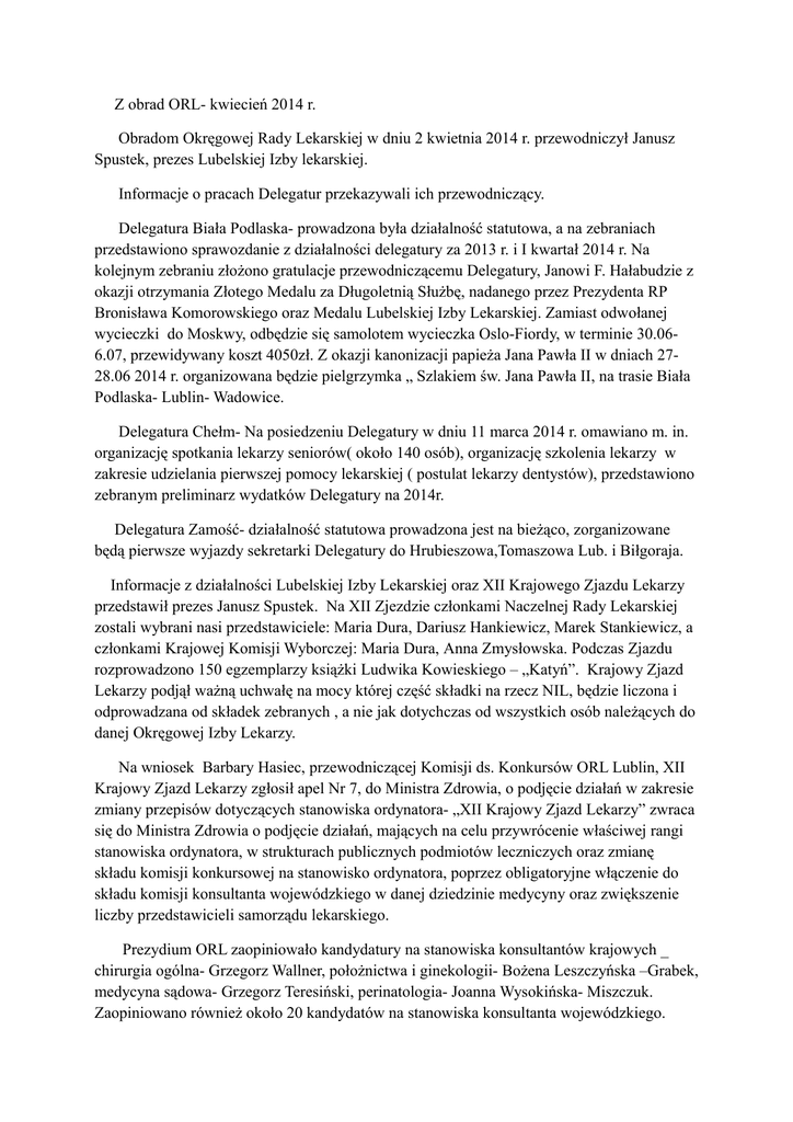 Z obrad ORL- kwiecień 2014 r. Obradom Okręgowej Rady Lekarskiej w dniu 2 kwietnia 2014 r. przewodniczył Janusz Spustek, prezes Lubelskiej Izby lekarskiej. Informacje o pracach Delegatur przekazywali ich przewodniczący. Delegatura Biała Podlaska- prowadzona była działalność statutowa, a na zebraniach przedstawiono sprawozdanie z działalności delegatury za 2013 r. i I kwartał 2014 r. Na kolejnym zebraniu złożono gratulacje przewodniczącemu Delegatury, Janowi F. Hałabudzie z okazji otrzymania Złotego Medalu za Długoletnią Służbę, nadanego przez Prezydenta RP Bronisława Komorowskiego oraz Medalu Lubelskiej Izby Lekarskiej. Zamiast odwołanej wycieczki do Moskwy, odbędzie się samolotem wycieczka Oslo-Fiordy, w terminie 30.066.07, przewidywany koszt 4050zł. Z okazji kanonizacji papieża Jana Pawła II w dniach 2728.06 2014 r. organizowana będzie pielgrzymka „ Szlakiem św. Jana Pawła II, na trasie Biała Podlaska- Lublin- Wadowice. Delegatura Chełm- Na posiedzeniu Delegatury w dniu 11 marca 2014 r. omawiano m. in. organizację spotkania lekarzy seniorów( około 140 osób), organizację szkolenia lekarzy w zakresie udzielania pierwszej pomocy lekarskiej ( postulat lekarzy dentystów), przedstawiono zebranym preliminarz wydatków Delegatury na 2014r. Delegatura Zamość- działalność statutowa prowadzona jest na bieżąco, zorganizowane będą pierwsze wyjazdy sekretarki Delegatury do Hrubieszowa,Tomaszowa Lub. i Biłgoraja. Informacje z działalności Lubelskiej Izby Lekarskiej oraz XII Krajowego Zjazdu Lekarzy przedstawił prezes Janusz Spustek. Na XII Zjezdzie członkami Naczelnej Rady Lekarskiej zostali wybrani nasi przedstawiciele: Maria Dura, Dariusz Hankiewicz, Marek Stankiewicz, a członkami Krajowej Komisji Wyborczej: Maria Dura, Anna Zmysłowska. Podczas Zjazdu rozprowadzono 150 egzemplarzy książki Ludwika Kowieskiego – „Katyń”. Krajowy Zjazd Lekarzy podjął ważną uchwałę na mocy której część składki na rzecz NIL, będzie liczona i odprowadzana od składek zebranych , a nie jak dotychczas od wszystkich osób należących do danej Okręgowej Izby Lekarzy. Na wniosek Barbary Hasiec, przewodniczącej Komisji ds. Konkursów ORL Lublin, XII Krajowy Zjazd Lekarzy zgłosił apel Nr 7, do Ministra Zdrowia, o podjęcie działań w zakresie zmiany przepisów dotyczących stanowiska ordynatora- „XII Krajowy Zjazd Lekarzy” zwraca się do Ministra Zdrowia o podjęcie działań, mających na celu przywrócenie właściwej rangi stanowiska ordynatora, w strukturach publicznych podmiotów leczniczych oraz zmianę składu komisji konkursowej na stanowisko ordynatora, poprzez obligatoryjne włączenie do składu komisji konsultanta wojewódzkiego w danej dziedzinie medycyny oraz zwiększenie liczby przedstawicieli samorządu lekarskiego. Prezydium ORL zaopiniowało kandydatury na stanowiska konsultantów krajowych _ chirurgia ogólna- Grzegorz Wallner, położnictwa i ginekologii- Bożena Leszczyńska –Grabek, medycyna sądowa- Grzegorz Teresiński, perinatologia- Joanna Wysokińska- Miszczuk. Zaopiniowano również około 20 kandydatów na stanowiska konsultanta wojewódzkiego. Część Komisji problemowych podjęła swoją normalną działalność . Komisja Kultury- W dniu 12 kwietnia 2014 r., o godz. 12 w Klubie Lekarza odbędzie się wernisaż fotografii kol. Piotra Kliszcza z Małopolskiej Izby Lekarskiej. Autor jest zapalonym płetwonurkiem, tematem jego prac jest „Podwodny świat”. W dniach 11-14 września 2014 r. w Kazimierzu Dolnym nad Wisłą odbędzie się II Ogólnopolski Plener Fotograficzny Lekarzy. Liczba miejsc 20, koszt 300 zł od osoby. Komisja ds. Sportu - Regulamin pracy Komisji jest w końcowej fazie opracowywania. W Opolu Lub. odbył się turniej halowy w piłce nożnej, o puchar prezesa NIL, wygrała ekipa lubelska. Na stronie internetowej będą informacje o planowanych zawodach sportowych. Komisja ds. Wykonywania Zawodu- W okresie sprawozdawczym( marzec) odbyły się 4 posiedzenia Komisji oraz zostało podjęta 45 uchwał Prezydium ORL. W tym 4 z nich dotyczyły 955 lekarzy, w sprawie zatwierdzenia zmian wpisu do rejestru podmiotów wykonujących działalność leczniczą. ORL podjęła uchwałę o aktualizacji kwoty z 1600 zł do 1680 zł upoważniającej do pomocy z Funduszu Pomocowego. ORL zatwierdziła w głosowaniu regulaminy prac Komisji Seniorów oraz Komisji ds. Zmian Systemowych w ochronie zdrowia, a także zmiany w składzie osobowym komisji problemowych: Komisji Etyki, Komisji ds. Zmian Systemowych. Mec Alicja Lemieszek, radca prawny LIL przedstawiła zmiany w nowym prawie , w tym jednolity tekst w sprawie recept lekarskich ( D U 2014, poz. 309) W końcowej fazie obrad ORL dyskutowano nad tzw. projektami kolejkowymi min. Arłukowicza. W kolejnych wystąpieniach powtarzały się uwagi, że są to tylko projekty, a nie konkretne przepisy prawne, a w dodatku nie są podane źródła finansowania tych projektów. (jj)