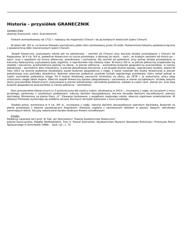 Historia - przysiółek GRANECZNIK GRANECZNIK dawniej Granicznik, niem. Granietschnik Folwark wzmiankowany od 1722 r. należący do majętności Choryń i do jej kolejnych właścicieli (patrz Choryń) W latach 80. XIX w. na terenie folwarku wymieniany jeden dom zamieszkany przez 25 osób. Powierzchnia folwarku podawana łącznie z powierzchnią dóbr macierzystych (patrz Choryń). Zespół folwarczny usytuowany wśród pól na południowy – wschód od Choryni przy bocznej drodze prowadzącej z Choryni do Kopaszewa. W 4 ćw. XIX w. podwórze folwarczne na rzucie prostokąta, o dłuższej osi wsch. – zach., ze ściętym narożem od strony pn. wsch. oraz z wjazdami od strony północnej, południowej i zachodniej. Na zachód od podwórza, przy polnej drodze prowadzącej w kierunku Katarzynina, usytuowana była cegielnia, a naprzeciwko niej nieduży staw. W końcu XIX w. w pierzei północnej znajdowała się stodoła i owczarnia, przekształcona później na oborę, w pierzei północno – wschodniej budynek gospodarczy pracowników, w narożu południowo – wschodnim dom mieszkalny, w pierzei południowej owczarnia, a po drugiej stronie wjazdu, naprzeciwko stodoły, stajnia.W roku 1913 na terenie podwórza zbudowany został budynek gospodarczy z cegły, a także czworaki dla służby folwarcznej w pierzei południowej oraz pośrodku dziedzińca. Również wówczas podwórze uzyskało kształt regularnego prostokąta, który został jednak w części zachodniej podzielony drogą. Po II wojnie światowej owczarnie zmieniono na obory, po 1978 r. je wyburzono, prócz tego zniszczeniu uległa także stajnia. Obecnie zespół folwarczny bardzo zdegradowany i zachowany w stanie szczątkowym. Ocalały jedynie domy pracowników folwarcznych usytuowane w pierzei południowej i zachodniej podwórza, stodoła w części zach. pierzei pn. oraz dwa budynki gospodarcze pracowników w naroży północno – wschodnim. Dom pracowników folwarcznych nr 2 przeznaczony dla sześciu rodzin, zbudowany w 1913 r., murowany z cegły, ze szczytami z muru pruskiego, parterowy z użytkowym poddaszem, nakryty dachem dwuspadowym, boczne skrzydła dachami naczółkowymi, pokryty dachówką. Wzniesiony na planie litery „U”. Elewacje tynkowane, z wyjątkiem ceglanego cokołu, obecnie częściowo zniekształcone. W elewacji frontowej wyróżniają się ozdobne szczyty bocznych skrzydeł wykonane z muru pruskiego. Stodoła polna, wzniesiona w 4 ćw. XIX w., murowana z cegły, nakryta dachem dwuspadowym pokrytym dachówką. Budynek na planie prostokąta z dwoma sąsiadującymi klepiskami. Elewacja ceglana z zachowanym detalem w postaci ślepych, odcinkowo zamkniętych blend. Szczyty zakończone bardzo drobnym frezem schodkowym. Źródło: Redakcja naukowa serii prof. dr hab. Jan Skorutowicz "Dawne budownictwa folwarczne" Jolanta Goszczyńska, Majątki Wielkopolskie, Tom V, Powiat Kościański, Wydawnictwo Muzeum Narodowe Rolnictwa i Przemysłu Rolno Spożywczego w Szreniawie 1998r., wyd. cyt., s. 72. Powered by TCPDF (www.tcpdf.org)