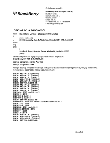 Certyfikowany model: BlackBerry STH100-2 (RJD211LW) BlackBerry Limited. 2200 University Ave. E Waterloo, Ontario Kanada N2K 0A7 +1 519 888 7465, faks +1 519 888 6906 e-mail: [email protected] DEKLARACJA ZGODNOŚCI Firm a BlackBerry Limited i BlackBerry UK Limited (nazwa producenta) z siedz ibą przy 2200 University Ave. E, Waterloo, Ontario N2K 0A7, KANADA i 200 Bath Road, Slough, Berks, Wielka Brytania SL1 3XE (adres) oświadcza ponosząc wyłączną odpowiedzialność, że produkt BlackBerry STH100-2 (RJD211LW) Wersja oprogramowania: AAF155 Wersja urządzenia: PIO którego dotyczy niniejsza deklaracja, jest zgodny z zasadniczymi wymaganiami dyrektywy 1999/5/WE. Potwierdzono zgodność z następującymi normami: EN 301 489-1 V1.9.2 (2011-09) EN 301 489-3 V1.6.1 (2013-08) EN 301 489-7 V1.3.1 (2005-11) EN 301 489-17 V2.2.1 (2012-09) EN 301 489-24 V1.5.1 (2010-10) EN 300 328 V1.9.1 (2015-02) EN 300 440-1 V1.6.1 (2010-08) EN 300 440-2 V1.4.1 (2010-08) EN 302 291-2 V1.1.1 (2005-07) EN 302 291-2 V1.1.1 (2005-07) EN 55020 : 2007 + A111 : 2011 EN 55013 : 2013 EN 61000-3-2 : 2014 EN 61000-3-3 : 2013 EN 301 511 V9.0.2 (2003-03) EN 60950-1 : 2006/A11:2009/A1:2010/A12:2011/A2:2013 EN 50332-1 : 2013 EN 50332-2 : 2013 EN 50360 : 2001 + A1 : 2012 EN 50566-2013/AC : 2014 EN 62311 : 2008 EN 62479 :2010 EN 301 908-1 V7.1.1 (2015-03) EN 301 908-13 V6.2.1 (2013-10) EN 301 908-13 V6.2.1 (2013-10) EN 301 893 V1.8.1 (2015-03) Strona 1 z 2 Certyfikowany model: BlackBerry STH100-2 (RJD211LW) BlackBerry Limited. 2200 University Ave. E Waterloo, Ontario Kanada N2K 0A7 +1 519 888 7465, faks +1 519 888 6906 e-mail: [email protected] Produkt opisany powyżej jest również zgodny z: Dyrektywą 2011/65/EU Parlamentu Europejskiego i Rady z dn. 8 czerwca 2011, dotyczącą ograniczeń stosowania niektórych substancji niebezpiecznych (RoHS) w urządzeniach elektrycznych i elektronicznych Rozporządzeniem 1907/2006 Parlamentu Europejskiego i Rady z dnia 18 grudnia 2006, dotyczącym rejestracji, oceny, pozwolenia na używanie i ograniczenia stosowania chemikaliów (REACH) Dyrektywą 2012/19/EU Parlamentu Europejskiego i Rady z dnia 4 lipca 2012, dotyczącą zużytego sprzętu elektrotechnicznego i elektronicznego (WEEE) Dyrektywą 2006/66/EC Parlamentu Europejskiego i Rady z dnia 6 września 2006, dotyczącą baterii i akumulatorów oraz zużytych baterii i akumulatorów Produkt ma oznaczenie CE oraz nadano mu kod jednostki notyfikowanej 1588. Procedury oceny zgodności, o których mowa w paragrafie 10 i które wyszczególnione są w Załączniku do IV Dyrektywy 1999/5/WE, zostały przeprowadzone przy udziale następującej jednostki notyfikowanej: American Certification Body, Inc. Suite C110, Whittier Avenue 6731, 22101 McLean, Wirginia, Stany Zjednoczone Znak identyfikacyjny: 1588 (Numer jednostki notyfikowanej) Dokumentacja techniczna dotycząca wymienionego wyżej sprzętu będzie przechowywana w wersji elektronicznej pod następującym adresem: BlackBerry Limited 2200 University Avenue East, Waterloo, ON, Kanada, N2K 0A7 Kontakt: Charles Bishop Starszy menedżer ds. certyfikacji Kontakt: Charles Bishop Starszy menedżer projektu technicznego ds. certyfikacji (podpis osoby upoważnionej) (data) 24 czerwca 2016 r. Strona 2 z 2