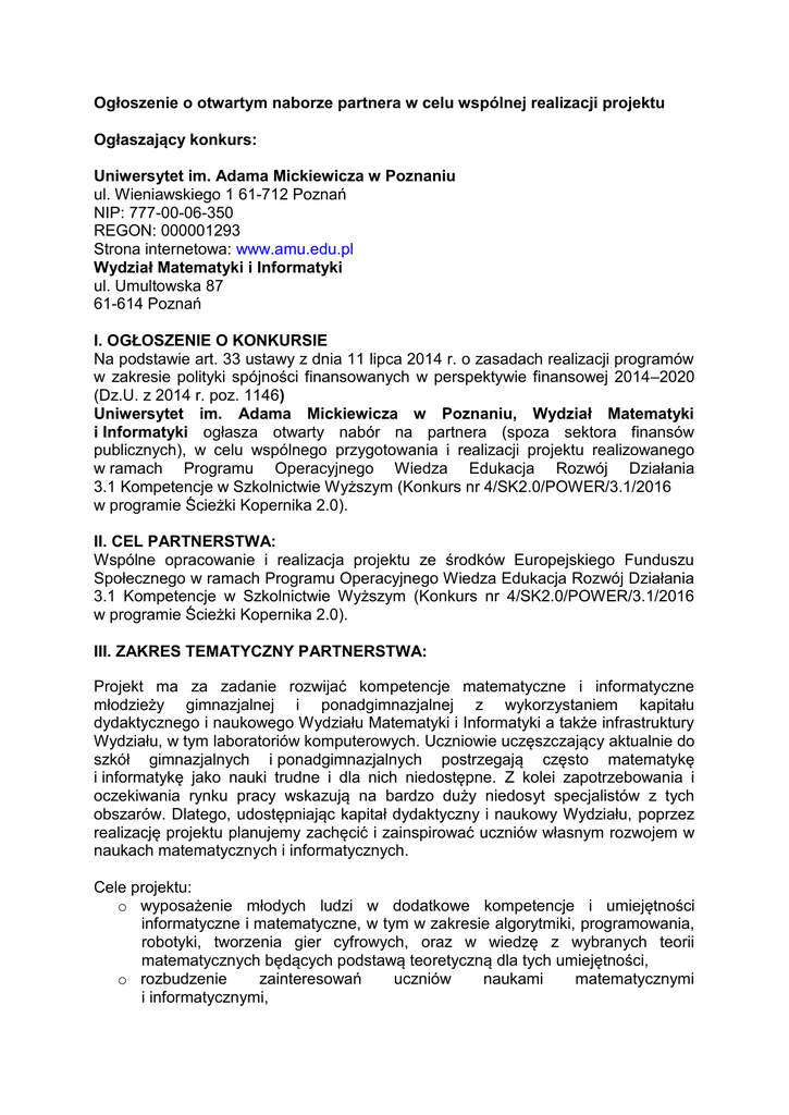 Ogłoszenie o otwartym naborze partnera w celu wspólnej realizacji projektu Ogłaszający konkurs: Uniwersytet im. Adama Mickiewicza w Poznaniu ul. Wieniawskiego 1 61-712 Poznań NIP: 777-00-06-350 REGON: 000001293 Strona internetowa: www.amu.edu.pl Wydział Matematyki i Informatyki ul. Umultowska 87 61-614 Poznań I. OGŁOSZENIE O KONKURSIE Na podstawie art. 33 ustawy z dnia 11 lipca 2014 r. o zasadach realizacji programów w zakresie polityki spójności finansowanych w perspektywie finansowej 2014–2020 (Dz.U. z 2014 r. poz. 1146) Uniwersytet im. Adama Mickiewicza w Poznaniu, Wydział Matematyki i Informatyki ogłasza otwarty nabór na partnera (spoza sektora finansów publicznych), w celu wspólnego przygotowania i realizacji projektu realizowanego w ramach Programu Operacyjnego Wiedza Edukacja Rozwój Działania 3.1 Kompetencje w Szkolnictwie Wyższym (Konkurs nr 4/SK2.0/POWER/3.1/2016 w programie Ścieżki Kopernika 2.0). II. CEL PARTNERSTWA: Wspólne opracowanie i realizacja projektu ze środków Europejskiego Funduszu Społecznego w ramach Programu Operacyjnego Wiedza Edukacja Rozwój Działania 3.1 Kompetencje w Szkolnictwie Wyższym (Konkurs nr 4/SK2.0/POWER/3.1/2016 w programie Ścieżki Kopernika 2.0). III. ZAKRES TEMATYCZNY PARTNERSTWA: Projekt ma za zadanie rozwijać kompetencje matematyczne i informatyczne młodzieży gimnazjalnej i ponadgimnazjalnej z wykorzystaniem kapitału dydaktycznego i naukowego Wydziału Matematyki i Informatyki a także infrastruktury Wydziału, w tym laboratoriów komputerowych. Uczniowie uczęszczający aktualnie do szkół gimnazjalnych i ponadgimnazjalnych postrzegają często matematykę i informatykę jako nauki trudne i dla nich niedostępne. Z kolei zapotrzebowania i oczekiwania rynku pracy wskazują na bardzo duży niedosyt specjalistów z tych obszarów. Dlatego, udostępniając kapitał dydaktyczny i naukowy Wydziału, poprzez realizację projektu planujemy zachęcić i zainspirować uczniów własnym rozwojem w naukach matematycznych i informatycznych. Cele projektu: o wyposażenie młodych ludzi w dodatkowe kompetencje i umiejętności informatyczne i matematyczne, w tym w zakresie algorytmiki, programowania, robotyki, tworzenia gier cyfrowych, oraz w wiedzę z wybranych teorii matematycznych będących podstawą teoretyczną dla tych umiejętności, o rozbudzenie zainteresowań uczniów naukami matematycznymi i informatycznymi, o rozwinięcie interdyscyplinarnego podejścia do przedmiotów matematycznych przyrodniczych oraz informatycznych, o wdrożenie modelu intensywnej współpracy oraz integracji środowisk szkolnych i akademickich. Zgodnie z Regulaminem konkursu: „Do zadań partnera należeć będzie co najmniej: o angażowanie członków lokalnej społeczności (w szczególności młodzieży szkolnej) w spójne tematycznie działania naukowe lub o aktywne włączanie młodzieży do działań promujących zadania realizowane w ramach projektu, poprzez m.in. wystawy, warsztaty, eksperymenty, doświadczenia, opracowania. Projekty mają służyć realizacji celów PO WER, w tym przede wszystkim celu szczegółowego dotyczącego podniesienia kompetencji osób uczestniczących w edukacji na poziomie wyższym, odpowiadających potrzebom gospodarki, rynku pracy i społeczeństwa w ramach Działania 3.1 Kompetencje w szkolnictwie wyższym, Oś III Szkolnictwo wyższe dla gospodarki i rozwoju, Program Operacyjny Wiedza Edukacja Rozwój 2014-2020.” (Regulamin, str. 6). IV. KRYTERIA WYBORU PARTNERA Kryteria dostępu: Do postępowania mogą przystąpić podmioty, które łącznie spełniają poniższe wymogi. 1. Prowadzenie działalności w zakresie zgodnym z celami partnerstwa. 2. Nie zaleganie z uiszczaniem wobec Urzędu Skarbowego oraz Zakładu Ubezpieczeń Społecznych podatków, opłat lub składek na ubezpieczenia społeczne lub zdrowotne, z wyjątkiem przypadków gdy podmiot uzyskał przewidziane prawem zwolnienie, odroczenie, rozłożenie na raty zaległych płatności lub wstrzymanie w całości wykonania decyzji właściwego organu. 3. Nie podleganie wykluczeniu z ubiegania się o dofinansowanie na podstawie art. 207 ust. 4 ustawy z 21.06.2013 r. o finansach publicznych (Dz.U. z 2013 r. poz. 885) z zastrzeżeniem art. 207 ust. 7 tej Ustawy. 4. Jeden podmiot może złożyć tylko jedną ofertę. Kryteria dodatkowe 1. Okres prowadzenia działalności: a) do 3 lat – 1 pkt b) powyżej 3 do 5 lat – 2 pkt c) powyżej 5 lat – 3 pkt 2. Posiadanie potencjału ludzkiego, organizacyjnego i technicznego niezbędnego do realizacji zgłaszanych do projektu działań – od 0 do 20 pkt. 3. Proponowany zakres merytoryczny działań wraz z wykorzystaniem narzędzi edukacyjnych w projekcie – od 0 do 30 pkt. V. SPOSÓB PRZYGOTOWANIA I ZŁOŻENIA OFERTY Podmiot ubiegający się o wybór Partnera w procedurze konkursowej jest zobowiązany do przedłożenia poniższych dokumentów (oryginał lub uwierzytelniona kopia). 1. Wypełniony „Formularza oferty” w oparciu o wzór zawarty w ogłoszeniu. 2. Aktualny odpis z właściwego rejestru np. KRS lub centralnej ewidencji i informacji o działalności gospodarczej, wystawiony nie wcześniej niż 6 miesięcy przed upływem składania ofert potwierdzający formę organizacyjnoprawną podmiotu. 3. Aktualne zaświadczenie właściwego oddziału Zakładu Ubezpieczeń Społecznych lub Kasy Rolniczego Ubezpieczenia Społecznego potwierdzającego, że oferent nie zalega z opłaceniem składek na ubezpieczenie zdrowotne i społeczne, lub potwierdzenia, że uzyskał przewidziane prawem zwolnienie, odroczenie lub rozłożenie na raty zaległych płatności lub wstrzymanie w całości wykonania decyzji właściwego organu - wystawione nie wcześniej niż 3 miesiące przed terminem składania ofert. 4. Aktualne zaświadczenie właściwego naczelnika urzędu skarbowego potwierdzającego, że oferent nie zalega z opłacaniem podatków, lub zaświadczenia, że uzyskał przewidziane prawem zwolnienie, odro