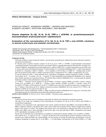 Acta Haematologica Polonica 2011, 42, Nr 1, str. 85–93 PRACA ORYGINALNA – Original Article PATRYCJA ŁOPACZ1, AGNIESZKA WRÓBEL1, JADWIGA SAK-BUDZISZ1, ELŻBIETA LACHERT2, KRYSTYNA MAŚLANKA1, EWA BROJER1 Ocena stężenia IL-1β, IL-6, IL-8, TNF-α α i sCD40L w przechowywanych koncentratach erytrocytarnych i płytkowych Evaluation of the concentration of IL-1β, IL-6, IL-8, TNF-α α and sCD40L cytokines in stored erythrocyte and platelet concentrates 1 Zakład Immunologii Hematologicznej i Transfuzjologiczej IHiT w Warszawie Kierownik: Prof. dr hab.n.med. Ewa Brojer 2 Zakład Zapewnienia Jakości i Organizacji Służby Krwi IHiT w Warszawie Kierownik: Dr Elżbieta Lachert STRESZCZENIE Głównym źródłem cytokin biorących udział w powstawaniu gorączkowych niehemolitycznych odczynów poprzetoczeniowych są leukocyty. W obecnej pracy oceniono stężenia cytokin: IL-1β, IL-6, IL-8, TNF-α i sCD40L w supernatantach otrzymanych z przechowywanych: koncentratów krwinek czerwonych (KKCz), ubogoleukocytarnych koncentratów krwinek czerwonych (UKKCz), koncentratów krwinek płytkowych z aferezy (KKP-Af.), w świeżo mrożonym osoczu (FFP) oraz w osoczu zdrowych osób (kontrola/norma). Cytokiny badano we wszystkich składnikach krwi: w dniu ich preparatyki (dzień 0), a następnie w KKCz i UKKCz – raz w tygodniu, aż do 42 dnia, a w KKP-Af. – każdego dnia, aż do 6 dnia ich przechowywania. KKCz i UKKCz przechowywano w temperaturze 4oC, a KKP w temperaturze 20–22oC. W osoczu zdrowych osób, w dniu pobrania krwi, stwierdzono następujące stężenia badanych cytokin: sCD40L – 645,9 pg/ml, IL-8 – 9,1 pg/ml, a IL-1β – 1,0 pg/ml. W dniu preparatyki poszczególnych składników krwi stężenia tych cytokin mieściły się w granicach normy. W ostatnim dniu ważności składników krwi, w porównaniu do stężenia badanych cytokin w dniu pobrania krwi stwierdzono: a) w KKCz – 10-krotny wzrost stężenia IL-1β (p=0,006), 2,5-krotny wzrost sCD40L (p=0,295) i prawie 3-krotny wzrost IL-8 (p=0,002), b) w KKP-Af. - 5-krotny wzrost stężenia sCD40L (p=0,002) i 3-krotny wzrost IL-8 (p=0,002). W UKKCz i FFP stężenia IL-1β, IL-8 i sCD40L przez cały okres przechowywania były w granicach normy. U żadnej z osób zdrowych ani w żadnym z przechowywanych składników krwi nie wykryto IL-6 i TNFα, a dodatkowo w KKP-Af. nie wykrywano także IL-1β. Podwyższone stężenia niektórych cytokin w długo przechowywanych składnikach krwi mogą być rozważane jako potencjalna przyczyna niehemolitycznych odczynów poprzetoczeniowych. SŁOWA KLUCZOWE: IL-1β, IL-6, IL-8, TNFα, sCD40L – Przechowywane składniki krwi SUMMARY Leukocytes are the main source of cytokines responsible for febrile non-haemolytic transfusion reactions. The aim of our study was evaluation of the concentration of cytokines: IL-1β, IL-6, IL-8, TNF-α and sCD40L in stored blood components. Cytokines were measured in the supernatants from stored: packed red blood cells (RBCs), leucoreduced RBCs (LRBCs), apheresis platelet concentrates (PCs Aph.) and in fresh frozen plasma (FFP). Plasma samples from random donors were used as a control. The samples from all the units were analysed on collection day (Day 0) and next in RBCs and L-RBCs once a week until Day 42 and in PCs Aph. every day until Day 6. RBCs components were stored at 4oC and platelet concentrates at 20-22oC. On the day of collection the concentrations of cytokines in control donor plasma samples were as follows: sCD40L – 645.9 pg/ml, IL-8 – 9.1 pg/ml, a IL-1β – 1.0 pg/ml. On the Day 0 the concentrations of those cytokines in blood components were within the limits for control plasma. On the last day of storage the following concentrations were determined comparing to storage Day 0: a) for RBCs – a 10 fold higher concentration of IL-1β (p=0,006), a 2.5 fold 86 P. ŁOPACZ i wsp. higher concentration of sCD40L (p=0,295), a 3 fold higher concentration of IL-8 (p=0,002), b) for PCsAph. – a 5 fold higher concentration of sCD40L (p=0,002) and a 3 fold higher concentration of IL-8 (p=0,002). For stored L-RBCs the IL-1β, IL-8 and sCD40L cytokine concentrations were within the limits for control plasma. No IL-6 and TNF-α were found in any of donor samples and in any of stored blood components. Additionally, IL-1β in PCs Aph. was also not found. The higher concentrations of some cytokines in stored blood components may be considered a likely cause of nonhaemolytic transfusion reactions. KEY WORDS: IL-1β – IL-6 – IL-8 – TNF-α – sCD40L – Stored blood components WPROWADZENIE Udział rozpuszczalnych bioaktywnych związków, takich jak cytokiny, w powstawaniu gorączkowych niehemolitycznych odczynów po przetoczeniu składników krwi jest dobrze znany [1, 2, 3, 4]. Głównym źródłem prozapalnych cytokin, między innymi interleukin (IL) IL-1α, IL-1β, IL-6, czynnika martwicy nowotworu – TNF-α (ang. Tumor Necrosis Factor) są zaktywowane leukocyty, a zwłaszcza monocyty. Cytokiny mogą być uwalniane zarówno przez leukocyty biorcy, jak i przez leukocyty dawcy obecne w przetaczanej krwi. Świadczą o tym między innymi badania Shanwell i wsp. [5], którzy wykazali, że przechowywanie ubogoleukocytarnych składników krwi znacznie ogranicza ilość uwalnianych cytokin. W ostatnich latach problem obecności cytokin w przetaczanych składnikach krwi znalazł się w centrum zainteresowania w związku z badaniami dotyczącymi wyjaśnienia patogenezy TRALI (ang. Transfusion Related Acute Lung Injury). Wykazano, że istotną rolę w patogenezie tego odczynu odgrywają nie tylko przeciwciała antyleukocytarne obecne w przetaczanej krwi lub w krążeniu chorego, ale też bioaktywne lipidy i cytokiny [6]. Bardzo ważny jest stan kliniczny chorego, ponieważ zaobserwowano, że odczyny przebiegające z dusznością, w tym TRALI występują częściej u chorych w stanie krytycznym [7]. Obecnie wiadomo, że w patogenezie TRALI, głównymi komórkami efektor