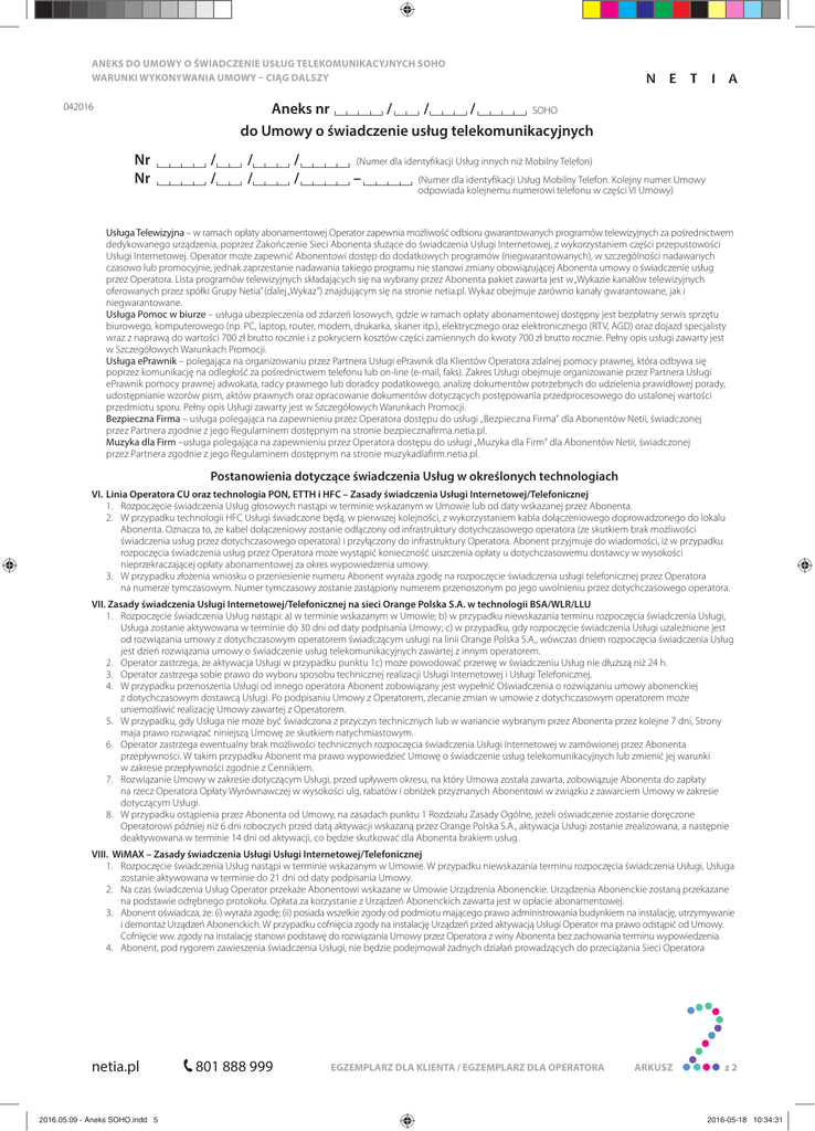 ANEKS DO UMOWY O ŚWIADCZENIE USŁUG TELEKOMUNIKACYJNYCH SOHO WARUNKI WYKONYWANIA UMOWY – CIĄG DALSZY 042016 Aneks nr / / / SOHO do Umowy o świadczenie usług telekomunikacyjnych Nr Nr / / / / / / (Numer dla identyfikacji Usług innych niż Mobilny Telefon) – (Numer dla identyfikacji Usług Mobilny Telefon. Kolejny numer Umowy odpowiada kolejnemu numerowi telefonu w części VI Umowy) Usługa Telewizyjna – w ramach opłaty abonamentowej Operator zapewnia możliwość odbioru gwarantowanych programów telewizyjnych za pośrednictwem dedykowanego urządzenia, poprzez Zakończenie Sieci Abonenta służące do świadczenia Usługi Internetowej, z wykorzystaniem części przepustowości Usługi Internetowej. Operator może zapewnić Abonentowi dostęp do dodatkowych programów (niegwarantowanych), w szczególności nadawanych czasowo lub promocyjnie, jednak zaprzestanie nadawania takiego programu nie stanowi zmiany obowiązującej Abonenta umowy o świadczenie usług przez Operatora. Lista programów telewizyjnych składających się na wybrany przez Abonenta pakiet zawarta jest w „Wykazie kanałów telewizyjnych oferowanych przez spółki Grupy Netia” (dalej „Wykaz”) znajdującym się na stronie netia.pl. Wykaz obejmuje zarówno kanały gwarantowane, jak i niegwarantowane. Usługa Pomoc w biurze – usługa ubezpieczenia od zdarzeń losowych, gdzie w ramach opłaty abonamentowej dostępny jest bezpłatny serwis sprzętu biurowego, komputerowego (np. PC, laptop, router, modem, drukarka, skaner itp.), elektrycznego oraz elektronicznego (RTV, AGD) oraz dojazd specjalisty wraz z naprawą do wartości 700 zł brutto rocznie i z pokryciem kosztów części zamiennych do kwoty 700 zł brutto rocznie. Pełny opis usługi zawarty jest w Szczegółowych Warunkach Promocji. Usługa ePrawnik – polegająca na organizowaniu przez Partnera Usługi ePrawnik dla Klientów Operatora zdalnej pomocy prawnej, która odbywa się poprzez komunikację na odległość za pośrednictwem telefonu lub on-line (e-mail, faks). Zakres Usługi obejmuje organizowanie przez Partnera Usługi ePrawnik pomocy prawnej adwokata, radcy prawnego lub doradcy podatkowego, analizę dokumentów potrzebnych do udzielenia prawidłowej porady, udostępnianie wzorów pism, aktów prawnych oraz opracowanie dokumentów dotyczących postępowania przedprocesowego do ustalonej wartości przedmiotu sporu. Pełny opis Usługi zawarty jest w Szczegółowych Warunkach Promocji. Bezpieczna Firma – usługa polegająca na zapewnieniu przez Operatora dostępu do usługi „Bezpieczna Firma” dla Abonentów Netii, świadczonej przez Partnera zgodnie z jego Regulaminem dostępnym na stronie bezpiecznafirma.netia.pl. Muzyka dla Firm –usługa polegająca na zapewnieniu przez Operatora dostępu do usługi „Muzyka dla Firm” dla Abonentów Netii, świadczonej przez Partnera zgodnie z jego Regulaminem dostępnym na stronie muzykadlafirm.netia.pl. Postanowienia dotyczące świadczenia Usług w określonych technologiach VI. Linia Operatora CU oraz technologia PON, ETTH i HFC – Zasady świadczenia Usługi Internetowej/Telefonicznej 1. Rozpoczęcie świadczenia Usług głosowych nastąpi w terminie wskazanym w Umowie lub od daty wskazanej przez Abonenta. 2. W przypadku technologii HFC Usługi świadczone będą, w pierwszej kolejności, z wykorzystaniem kabla dołączeniowego doprowadzonego do lokalu Abonenta. Oznacza to, że kabel dołączeniowy zostanie odłączony od infrastruktury dotychczasowego operatora (ze skutkiem brak możliwości świadczenia usług przez dotychczasowego operatora) i przyłączony do infrastruktury Operatora. Abonent przyjmuje do wiadomości, iż w przypadku rozpoczęcia świadczenia usług przez Operatora może wystąpić konieczność uiszczenia opłaty u dotychczasowemu dostawcy w wysokości nieprzekraczającej opłaty abonamentowej za okres wypowiedzenia umowy. 3. W przypadku złożenia wniosku o przeniesienie numeru Abonent wyraża zgodę na rozpoczęcie świadczenia usługi telefonicznej przez Operatora na numerze tymczasowym. Numer tymczasowy zostanie zastąpiony numerem przenoszonym po jego uwolnieniu przez dotychczasowego operatora. VII. Zasady świadczenia Usługi Internetowej/Telefonicznej na sieci Orange Polska S.A. w technologii BSA/WLR/LLU 1. Rozpoczęcie świadczenia Usług nastąpi: a) w terminie wskazanym w Umowie; b) w przypadku niewskazania terminu rozpoczęcia świadczenia Usługi, Usługa zostanie aktywowana w terminie do 30 dni od daty podpisania Umowy; c) w przypadku, gdy rozpoczęcie świadczenia Usługi uzależnione jest od rozwiązania umowy z dotychczasowym operatorem świadczącym usługi na linii Orange Polska S.A., wówczas dniem rozpoczęcia świadczenia Usług jest dzień rozwiązania umowy o świadczenie usług telekomunikacyjnych zawartej z innym operatorem. 2. Operator zastrzega, że aktywacja Usługi w przypadku punktu 1c) może powodować przerwę w świadczeniu Usług nie dłuższą niż 24 h. 3. Operator zastrzega sobie prawo do wyboru sposobu technicznej realizacji Usługi Internetowej i Usługi Telefonicznej. 4. W przypadku przenoszenia Usługi od innego operatora Abonent zobowiązany jest wypełnić Oświadczenia o rozwiązaniu umowy abonenckiej z dotychczasowym dostawcą Usługi. Po podpisaniu Umowy z Operatorem, zlecanie zmian w umowie z dotychczasowym operatorem może uniemożliwić realizację Umowy zawartej z Operatorem. 5. W przypadku, gdy Usługa nie może być świadczona z przyczyn technicznych lub w wariancie wybranym przez Abonenta przez kolejne 7 dni, Strony maja prawo rozwiązać niniejszą Umowę ze skutkiem natychmiastowym. 6. Operator zastrzega ewentualny brak możliwości technicznych rozpoczęcia świadczenia Usługi Internetowej w zamówionej przez Abonenta przepływności. W takim przypadku Abonent ma prawo wypowiedzieć Umowę o świadczenie usług telekomunikacyjnych lub zmienić jej warunki w zakresie przepływności zgodnie z Cennikiem. 7. R