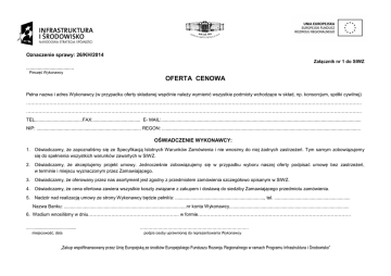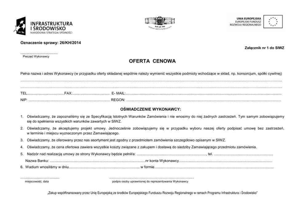 Oznaczenie sprawy: 26/KH/2014 Załącznik nr 1 do SIWZ ..................................... Pieczęć Wykonawcy OFERTA CENOWA Pełna nazwa i adres Wykonawcy (w przypadku oferty składanej wspólnie należy wymienić wszystkie podmioty wchodzące w skład, np. konsorcjum, spółki cywilnej) ………………………………………………………………………………………………………………………………………………………………………….…………………… ……………………………………………………………………………………………………………………………………………………………………………………….……… TEL.....................................FAX:..................................... E- MAIL:........................................................................................................................................................... NIP: ................................................................................. REGON: .......................................................................................................................................................... OŚWIADCZENIE WYKONAWCY: 1. Oświadczamy, że zapoznaliśmy się ze Specyfikacją Istotnych Warunków Zamówienia i nie wnosimy do niej żadnych zastrzeżeń. Tym samym zobowiązujemy się do spełnienia wszystkich warunków zawartych w SIWZ. 2. Oświadczamy, że akceptujemy projekt umowy. Jednocześnie zobowiązujemy się w przypadku wyboru naszej oferty podpisać umowę bez zastrzeżeń, w terminie i miejscu wyznaczonym przez Zamawiającego. 3. Oświadczamy, że oferowany przez nas asortyment jest zgodny z przedmiotem zamówienia szczegółowo opisanym w SIWZ. 4. Oświadczamy, że cena ofertowa zawiera wszystkie koszty związane z zakupem i dostawą do siedziby Zamawiającego przedmiotu zamówienia. 5. Nadzór nad realizacją umowy ze strony Wykonawcy będzie pełnił/a: ....................................................................., tel. ........................................................... Nazwa Banku: ...............................................................................................nr konta Wykonawcy............................................................................................. 6. Wadium wnosiliśmy w dniu………………………………………………….. w formie……………………………………………………………………………………… ........................................... miejscowość, data …………………………………………………………………… podpis osoby uprawnionej do reprezentowania Wykonawcy „Zakup współfinansowany przez Unię Europejską ze środków Europejskiego Funduszu Rozwoju Regionalnego w ramach Programu Infrastruktura i Środowisko” PAKIET nr 1 – Aparaty cyfrowe USG Lp. PRZEDMIOT ZAMÓWIENIA ILOŚĆ CENA JEDNOSTKOWA NETTO CENA JEDNOSTKOWA BRUTTO WARTOŚĆ NETTO WARTOŚĆ BRUTTO PRODUCENT NUMER KATALOGOWY NR CERTYFIKATU CE (jeśli posiada) 1 Aparaty cyfrowe USG 2 szt. Wartość netto Pakietu nr 1 wynosi: ..................................................................................................................................................................................... zł słownie: ................................................................................................................................................................................................................................... Wartość brutto Pakietu nr 1 wynosi: ................................................................................................................................................................................... zł słownie: .................................................................................................................................................................................................................................. Stawka VAT: ……………… % (w przypadku stawki mieszanej należy podać kalkulację obliczenia ceny) ........................................, dnia ............................. Miejscowość ....................................................................................................................... (pieczątka i podpis osoby upoważnionej do reprezentowania Wykonawcy) „Zakup współfinansowany przez Unię Europejską ze środków Europejskiego Funduszu Rozwoju Regionalnego w ramach Programu Infrastruktura i Środowisko” ZESTAWIENIE PARAMETRÓW TECHNICZNYCH GRANICZNYCH aparatu ultrasonograficznego wraz z wyposażeniem A) Dane ogólne o Wykonawcy Lp. Informacja ogólna o Wykonawcy Podać Osoba upoważniona do kontaktu z Zamawiającym po stronie Wykonawcy Adres e-mail ww. osoby Nr telefonu ww. osoby Nr fax. ww. osoby Strona www. Wykonawcy 1. 2. 3. 4. 5. B) Dane producenta ultrasonografów wraz z wyposażeniem Lp. 1. 2. 3. 4. 5. 6. Informacja ogólna o producencie aparatu USG Podać Pełna nazwa producenta Adres siedziby: Kraj Miejscowość Kod pocztowy Ulica nr / lokal Strona www Oferowany model Oferowany typ Rok PRODUKCJI „Zakup współfinansowany przez Unię Europejską ze środków Europejskiego Funduszu Rozwoju Regionalnego w ramach Programu Infrastruktura i Środowisko” C) Parametry techniczne graniczne oferowanych ultrasonografów wraz z wyposażeniem: L.p. 1. Parametry techniczne 2. Wysokiej klasy ogólnodiagnostyczny ultrasonograf. Całość dostarczanego sprzętu fabrycznie nowa, rok produkcji nie starszy niż 2014 Maksymalna Ilość kanałów przetwarzania 3. 4. Fizyczna ilość kanałów nadawczych TX Fizyczna ilość kanałów odbiorczych RX 5. Możliwość pracy w warunkach sali zabiegowej 6. Ilość gniazd aktywnych podłączenia głowic obrazowych (nie licząc gniazda dla głowicy typu PEN) Medyczny monitor kolorowy LCD wysokiej rozdzielczości, min. 128
