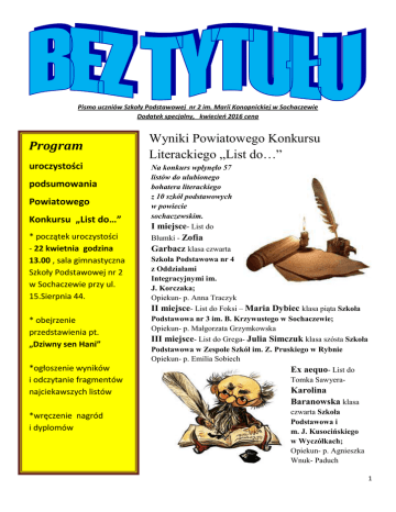 Pismo uczniów Szkoły Podstawowej nr 2 im. Marii Konopnickiej w Sochaczewie Dodatek specjalny, kwiecień 2016 cena Program uroczystości podsumowania Powiatowego Konkursu „List do…” * początek uroczystości - 22 kwietnia godzina 13.00 , sala gimnastyczna Szkoły Podstawowej nr 2 w Sochaczewie przy ul. 15.Sierpnia 44. * obejrzenie przedstawienia pt. „Dziwny sen Hani” *ogłoszenie wyników i odczytanie fragmentów najciekawszych listów *wręczenie nagród i dyplomów Wyniki Powiatowego Konkursu Literackiego „List do…” Na konkurs wpłynęło 57 listów do ulubionego bohatera literackiego z 10 szkół podstawowych w powiecie sochaczewskim. I miejsce- List do Blumki - Zofia Garbacz klasa czwarta Szkoła Podstawowa nr 4 z Oddziałami Integracyjnymi im. J. Korczaka; Opiekun- p. Anna Traczyk II miejsce- List do Foksi – Maria Dybiec klasa piąta Szkoła Podstawowa nr 3 im. B. Krzywustego w Sochaczewie; Opiekun- p. Małgorzata Grzymkowska III miejsce- List do Grega- Julia Simczuk klasa szósta Szkoła Podstawowa w Zespole Szkół im. Z. Pruskiego w Rybnie Opiekun- p. Emilia Sobiech Ex aequo- List do Tomka Sawyera- Karolina Baranowska klasa czwarta Szkoła Podstawowa i m. J. Kusocińskiego w Wyczółkach; Opiekun- p. Agnieszka Wnuk- Paduch 1 Wyróżnienia: - List do Odysa- Damian Pętlak, klasa piąta Szkoła Podstawowa im. K. Makuszyńskiego w Kozłowie Biskupim; Opiekun- p. Anna Walczak - List do Phileasa Fogga- Wiktoria Baranowska, klasa piąta Szkoła Podstawowa im. J. Kusocińskiego w Wyczółkach; Opiekun- p. Iwona Kochanek - List do Stasia Tarkowskiego- Konrad Ziółkowski , klasa piąta Szkoła Podstawowa im. J. Piłsudskiego w Iłowie; Opiekun- p. Elżbieta Modrzejewska - List do Mariolki- Sandra Łęcka, klasa piąta Szkoła Podstawowa im. J. Piłsudskiego w Iłowie; Opiekun- p. Elżbieta Modrzejewska - List do Mai- Aleksandra Bolimowska, klasa piąta Szkoła Podstawowa nr 3 im. B. Krzywustego w Sochaczewie; Opiekun- p. Małgorzata Grzymkowska - List do Ani Shirley- Olimpia Woszczalska, klasa szósta Szkoła Podstawowa nr 4 z Oddziałami Integracyjnymi im. J. Korczaka; Opiekun – p. Marta Kułakowska - List do Harry’ego Pottera- Patrycja Bodnar, klasa piąta Szkoła Podstawowa w Brzozowie Starym; Opiekun- p. Teresa Kupiec - List do Mikołajka -Oliwia Mitręga, klasa czwarta Zespół Szkół im. F.Chopina w Sochaczewie; Opiekun- p. Agnieszka Padzik- Papierowska - List do Aslana- Adam Hungerbühler, klasa piąta Szkoła Podstawowa nr 2 im. Marii Konopnickiej w Sochaczewie; Opiekun- p. Justyna Miziołek - List do Zenka Wójcika- Wiktor Kłos, klasa szósta Szkoła Podstawowa nr 2 im. Marii Konopnickiej w Sochaczewie; Opiekun- p. Elżbieta Cieślak Na kolejnych stronach naszej gazetki zapraszamy do lektury najciekawszych listów. Z uwagi na ich obszerność redakcja dokonała drobnych skrótów, zostawiając najciekawsze fragmenty. 2 I miejsce- List do Blumki - Zofia Garbacz, klasa czwarta Szkoła Podstawowa nr 4 z Oddziałami Integracyjnymi im. J. Korczaka Droga Blumko! To ja, Zosia, jestem Twoją rówieśniczką, a Twój pamiętnik to nasza ulubiona książka o czasach wojny.(…) Blumko, bardzo podobają mi się rysunki w Twoim pamiętniku. Mam dysleksję, więc gdy do opisu dodajesz obrazek, to dla mnie raj. Łatwiej mi przeczytać i zapamiętać. (…) Blumko, pytałaś ciągle, jak to będzie po wojnie? Jakie dzieci? Jaka będzie Warszawa? Czy ludzie będą pamiętać Starego Doktora i jego nauki? Co z Domem Sierot? Kochana, niepotrzebnie się martwiłaś, słowo harcerza! zielonych parków i placów zabaw. Nie ma śladów Chodzę do szkoły imienia Janusza Korczaka, po getcie. Choć jest tablica pamiątkowa na chodzili do niej moi rodzice i nawet babcia Ela. Siennej i pomnik Starego Doktora w miejscu Wszyscy tu znają poglądy Doktora, co roku mamy Waszego Domu. Chodzę tam czasem. Należę do konkurs o jego twórczości i życiorysie.(…) harcerstwa, moja drużyna nosi nazwę Pasja – Jestem w klasie integracyjnej i Pani Grażynka to świetna nazwa, nie? Mam swoją Pasję Pani, która pomaga niepełnosprawnym Co roku wspominamy i Was, i powstańców, i dzieciakom. Ale my też im pomagamy! I sprawia poległych żołnierzy. Naprawdę żyjecie w naszej nam to wielką radość. Nie było większej dumy, pamięci!(…) jak Paulina, która ma problem z chodzeniem, w Dbamy o groby żołnierzy, sprzątamy las w końcu SAMA trafiła do kosza. Albo Olek, który okolicy i co roku zbieramy pieniądze dla chorych nie słyszy, prawie WYRAŹNIE powiedział na w Wielkiej Orkiestrze Świątecznej Pomocy. To wieczernicy swój wiersz. Zupełnie jak u Was. już mój piąty rok. Super sprawa, Korczak pewnie Nasza wychowawczyni, pani Ania, tak jak pani pęka z dumy. Co roku od rana biegamy po mieście Stefa Wilczyńska, wierzy w nagrody i z puszkami. Mróz szczypie w uszy, jak słowo wybaczanie. Ciągle daje nam kolejną ostatnią daję, co roku jest mróz! Potem wszyscy chodzą z szansę.(…) serduszkiem Orkiestry na piersi. Jak z czerwonym Nasza Ninka, całkiem jak Pola z Twojego Domu medalem. Najwięcej zbiera mała Hania. Każdy Sierot, włożyła sobie do nosa fasolę, bo chciała daje takiemu maluchowi, zwłaszcza jak ma rzęsy zobaczyć, czy jej wyrośnie. Na szczęście tata do pasa. Ale nie żal mi, w końcu cel mamy zdążył to wyssać odkurzaczem, zanim wyrosły jej wspólny… strąki. A ja, jak Wasza Reginka, uwielbiam Hania nawet spłaca swój dług, bo jak się opowiadać historie, ale jak mam je zapisać, to urodziła, to leżała w inkubatorze kupionym przez klops. Byk na byku. Ale regułki wszystkie znam, Orkiestrę, a później przewozili ją karetką, też żebyś nie myślała, że leń ze mnie. A Ty piszesz kupioną za te pieniądze. Więc dzielnie zbiera. świetnie!(…) Widzisz, Blumko, niby czasy spokojne, ale I MY O WAS PAMIĘTAMY! pomoc też się przydaje. Inaczej, a podobnie. Bo Blumko, Warszawę odbudowano. Jest teraz taka zawsze jest coś do zrobien