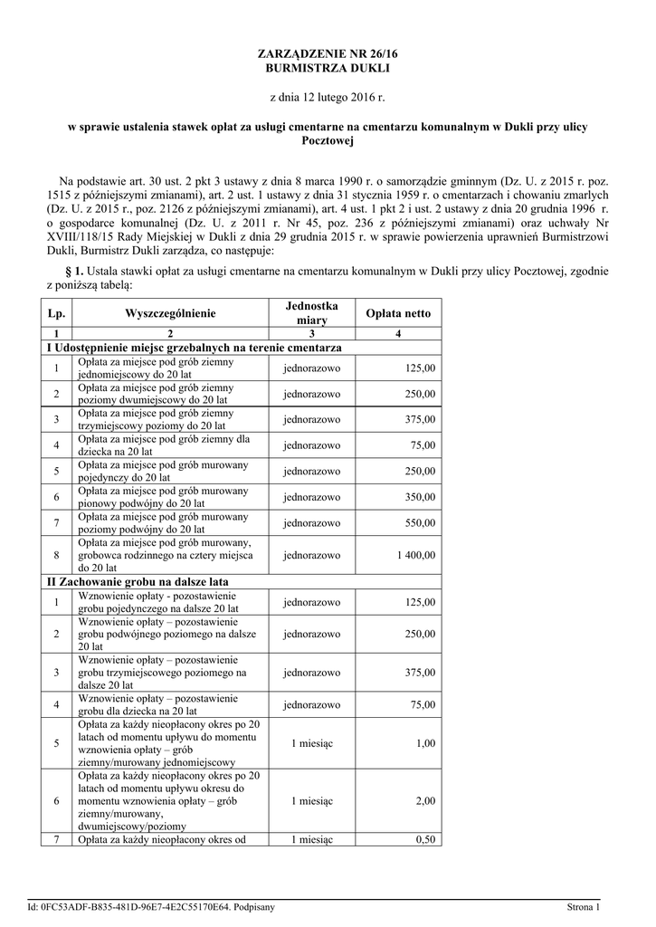 ZARZĄDZENIE NR 26/16 BURMISTRZA DUKLI z dnia 12 lutego 2016 r. w sprawie ustalenia stawek opłat za usługi cmentarne na cmentarzu komunalnym w Dukli przy ulicy Pocztowej Na podstawie art. 30 ust. 2 pkt 3 ustawy z dnia 8 marca 1990 r. o samorządzie gminnym (Dz. U. z 2015 r. poz. 1515 z późniejszymi zmianami), art. 2 ust. 1 ustawy z dnia 31 stycznia 1959 r. o cmentarzach i chowaniu zmarlych (Dz. U. z 2015 r., poz. 2126 z późniejszymi zmianami), art. 4 ust. 1 pkt 2 i ust. 2 ustawy z dnia 20 grudnia 1996 r. o gospodarce komunalnej (Dz. U. z 2011 r. Nr 45, poz. 236 z późniejszymi zmianami) oraz uchwały Nr XVIII/118/15 Rady Miejskiej w Dukli z dnia 29 grudnia 2015 r. w sprawie powierzenia uprawnień Burmistrzowi Dukli, Burmistrz Dukli zarządza, co następuje: § 1. Ustala stawki opłat za usługi cmentarne na cmentarzu komunalnym w Dukli przy ulicy Pocztowej, zgodnie z poniższą tabelą: Lp. Wyszczególnienie Jednostka miary Opłata netto 1 2 3 4 I Udostępnienie miejsc grzebalnych na terenie cmentarza 1 2 3 4 5 6 7 8 Opłata za miejsce pod grób ziemny jednomiejscowy do 20 lat Opłata za miejsce pod grób ziemny poziomy dwumiejscowy do 20 lat Opłata za miejsce pod grób ziemny trzymiejscowy poziomy do 20 lat Opłata za miejsce pod grób ziemny dla dziecka na 20 lat Opłata za miejsce pod grób murowany pojedynczy do 20 lat Opłata za miejsce pod grób murowany pionowy podwójny do 20 lat Opłata za miejsce pod grób murowany poziomy podwójny do 20 lat Opłata za miejsce pod grób murowany, grobowca rodzinnego na cztery miejsca do 20 lat jednorazowo 125,00 jednorazowo 250,00 jednorazowo 375,00 jednorazowo 75,00 jednorazowo 250,00 jednorazowo 350,00 jednorazowo 550,00 jednorazowo 1 400,00 jednorazowo 125,00 jednorazowo 250,00 jednorazowo 375,00 jednorazowo 75,00 1 miesiąc 1,00 1 miesiąc 2,00 1 miesiąc 0,50 II Zachowanie grobu na dalsze lata 1 2 3 4 5 6 7 Wznowienie opłaty - pozostawienie grobu pojedynczego na dalsze 20 lat Wznowienie opłaty – pozostawienie grobu podwójnego poziomego na dalsze 20 lat Wznowienie opłaty – pozostawienie grobu trzymiejscowego poziomego na dalsze 20 lat Wznowienie opłaty – pozostawienie grobu dla dziecka na 20 lat Opłata za każdy nieopłacony okres po 20 latach od momentu upływu do momentu wznowienia opłaty – grób ziemny/murowany jednomiejscowy Opłata za każdy nieopłacony okres po 20 latach od momentu upływu okresu do momentu wznowienia opłaty – grób ziemny/murowany, dwumiejscowy/poziomy Opłata za każdy nieopłacony okres od Id: 0FC53ADF-B835-481D-96E7-4E2C55170E64. Podpisany Strona 1 momentu upływu okresu do momentu wznowienia opłaty na 20 lat – grób dla dziecka III Kaplica cmentarna 1 Opłata za korzystanie z kaplicy cmentarnej 1 doba 100,00 jednorazowo 80,00 IV Nagrobki 1 Opłata za zezwolenie na: obmurowanie grobu ziemnego, remont istniejącego lub wymianę nagrobka, postawienie nowego nagrobka V Wjazd pojazdami na teren cmentarza komunalnego * Samochodem o ładowności do 3,5 t 1 2 3 Wjazd związany z wykonywaniem usługi pogrzebowej Wjazd związany z wykonywaniem usługi cmentarnej Wjazd związany z wykonywaniem usługi budowlanej jednorazowo 75,00 jednorazowo 75,00 jednorazowo 100,00 VI Pozostałe opłaty Rezerwacja miejsca pod grób jednorazowo 50,00 jednomiejscowy do 5 lat Rezerwacja miejsca pod grób 2 jednorazowo 100,00 dwumiejscowy poziomy do 5 lat Opłata za korzystanie z wody- pobierana 3 jednorazowo 10,00 przy pogrzebie Opłata za utrzymanie czystości i 4 jednorazowo 250,00 porządku- pobierana przy pogrzebie Opłata za składowanie materiałów 5 jednorazowo 10,00 budowlanych na nagrobek Opłata za składowanie materiałów 6 budowlanych na grób murowany, jednorazowo 20,00 grobowiec *Obowiązek wnoszenia opłat nie dotyczy wjazdu samochodów: 1) podmiotu wykonującego prace na podstawie umowy zawartej z Gminą Dukla, 2) dowożących zwłoki do kaplicy. 1 § 2. Do opłat ustalonych w § 1 w tabeli w kolumnie 4 zostanie doliczony, zgodnie z obowiązującymi przepisami, podatek od towarów i usług. § 3. Traci moc zarządzenie Nr 168/15 Burmistrza Dukli z dnia 31 grudnia 2015 r. w sprawie ustalenia stawek opłat za usługi cmentarne na cmentarzu komunalnym w Dukli przy ul. Pocztowej. § 4. Wykonanie zarządzenia powierza Naczelnikowi Wydziału Gospodarczego Urzędu Miejskiego w Dukli. § 5. Zarządzenie wchodzi w życie z dniem podjęcia z mocą obowiązującą od 1 marca 2016 r. Burmistrz Andrzej Bytnar Id: 0FC53ADF-B835-481D-96E7-4E2C55170E64. Podpisany Strona 2