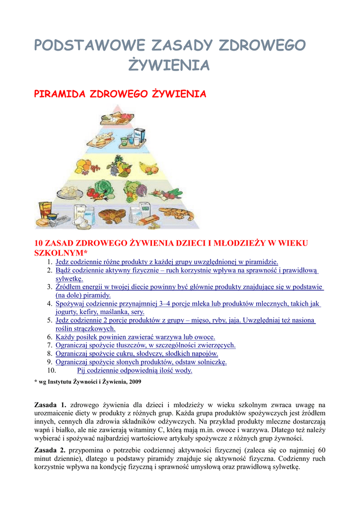 PODSTAWOWE ZASADY ZDROWEGO ŻYWIENIA PIRAMIDA ZDROWEGO ŻYWIENIA 10 ZASAD ZDROWEGO ŻYWIENIA DZIECI I MŁODZIEŻY W WIEKU SZKOLNYM* 1. Jedz codziennie różne produkty z każdej grupy uwzględnionej w piramidzie. 2. Bądź codziennie aktywny fizycznie – ruch korzystnie wpływa na sprawność i prawidłową sylwetkę. 3. Źródłem energii w twojej diecie powinny być głównie produkty znajdujące się w podstawie (na dole) piramidy. 4. Spożywaj codziennie przynajmniej 3–4 porcje mleka lub produktów mlecznych, takich jak jogurty, kefiry, maślanka, sery. 5. Jedz codziennie 2 porcje produktów z grupy – mięso, ryby, jaja. Uwzględniaj też nasiona roślin strączkowych. 6. Każdy posiłek powinien zawierać warzywa lub owoce. 7. Ograniczaj spożycie tłuszczów, w szczególności zwierzęcych. 8. Ograniczaj spożycie cukru, słodyczy, słodkich napojów. 9. Ograniczaj spożycie słonych produktów, odstaw solniczkę. 10. Pij codziennie odpowiednią ilość wody. * wg Instytutu Żywności i Żywienia, 2009 Zasada 1. zdrowego żywienia dla dzieci i młodzieży w wieku szkolnym zwraca uwagę na urozmaicenie diety w produkty z różnych grup. Każda grupa produktów spożywczych jest źródłem innych, cennych dla zdrowia składników odżywczych. Na przykład produkty mleczne dostarczają wapń i białko, ale nie zawierają witaminy C, którą mają m.in. owoce i warzywa. Dlatego też należy wybierać i spożywać najbardziej wartościowe artykuły spożywcze z różnych grup żywności. Zasada 2. przypomina o potrzebie codziennej aktywności fizycznej (zaleca się co najmniej 60 minut dziennie), dlatego u podstawy piramidy znajduje się aktywność fizyczna. Codzienny ruch korzystnie wpływa na kondycję fizyczną i sprawność umysłową oraz prawidłową sylwetkę. Zasada 3. dotyczy spożywania produktów zbożowych. Prawidłowo zaplanowany codzienny jadłospis powinien zawierać co najmniej 5 porcji produktów zbożowych, które są przede wszystkim głównym źródłem energii dla organizmu, zawierają wiele składników mineralnych i witamin, są także bogate w błonnik regulujący pracę jelit. Z grupy tej należy wybierać artykuły z tzw. grubego przemiału, są bowiem bogatsze w składniki odżywcze, zawierają więcej witamin, szczególnie witamin z grupy B (tiamina, ryboflawina, niacyna, kwas foliowy), składników mineralnych (magnez, cynk), oraz błonnika. Oprócz pieczywa pełnoziarnistego (ciemnego – razowego, typu graham), poleca się także ryż pełnoziarnisty niełuskany (brązowy), kaszę gryczaną i jęczmienną oraz razowy makaron. Zasada 4. dotyczy grupy: mleko i przetwory mleczne, najważniejszego źródła wapnia w diecie, który jest niezbędny do budowy zdrowych kości i zębów. W żadnym produkcie spożywczym nie ma tak dużo, jak w mleku i jego przetworach, dobrze przyswajalnego wapnia. Mleko zawiera również witaminy (A, D, B2)i jest źródłem najwyższej jakości białka. Uczniowie zatem powinni albo wypijać 3–4 szklanki mleka dziennie albo część mleka zastępować przetworami mlecznymi (jogurty, kefiry, maślanka lub serami twarogowymi, podpuszczkowymi żółtymi). Zasada 5. dotyczy grupy: mięso, ryby, jaja i nasiona roślin strączkowych, orzechy. Mięso, ryby, jaja i ich przetwory są w diecie źródłem pełnowartościowego białka, żelaza, cynku i witamin z grupy B. Ponieważ nasiona roślin strączkowych i orzechy są również źródłem wartościowego białka i wielu cennych składników mineralnych i witamin, włączone są do grupy produktów mięsnych. Z produktów mięsnych należy wybierać gatunki o małej zawartości tłuszczu (drób, wołowina, cielęcina). Ryby morskie (jak makrela, śledź i sardynka), warto spożywać ze względu na zawartość w nich korzystnych dla zdrowia wielonienasyconych kwasów tłuszczowych z grupy n-3 i witaminy D. Zasada 6: warzywa i owoce powinny być spożywane kilka razy dziennie w ramach głównych posiłków i pojadania (co najmniej 5 porcji dziennie). W diecie powinno się uwzględniać różnorodne warzywa (m.in. zielone: np. sałata, brokuł, szpinak, czy warzywa pomarańczowe: np. marchew, pomidor, dynia). Dietę należy też wzbogacać w owoce, zarówno świeże, jak i mrożone lub suszone oraz w mniejszej ilości w soki. Warzywa i owoce dostarczają składników mineralnych, witamin i flawonoidów. Są głównym źródłem witamin antyoksydacyjnych (C, E, karotenów), które mają działanie przeciwmiażdżycowe i przeciwnowotworowe. Ponadto są źródłem błonnika regulującego czynności przewodu pokarmowego. Warto jednak wiedzieć, że owoce i soki owocowe oprócz wartościowych witamin i błonnika, dostarczają dużych ilości cukrów prostych, których spożycie powinno być jednak ograniczane. Dlatego też należy spożywać więcej warzyw niż owoców, a wśród soków wybierać raczej warzywne lub owocowo-warzywne. Zasada 7. dotyczy tłuszczów. Większość tłuszczów w diecie powinna pochodzić z ryb, orzechów i tłuszczów roślinnych (np. olej rzepakowy, sojowy, słonecznikowy, oliwa z oliwek). Tłuszcze powinny stanowić jedynie dodatek do potraw. Do smażenia poleca się stosowanie oliwy z oliwek lub oleju rzepakowego bogatego w zdrowe jednonienasycone kwasy tłuszczowe. Należy również ograniczyć produkty zawierające dużo cholesterolu (głównie podroby) i izomery trans nienasyconych kwasów tłuszczowych (wyroby ciastkarskie, cukiernicze, margaryny twarde, dania typu fast food). Dzieci i młodzież mogą zmniejszyć spożycie tłuszczów, ograniczając spożycie produktów typu fast food (frytki, hamburgery, cheesburgery, pizza) oraz chipsów, ponieważ mają bardzo dużą zawartość tłuszczów (33–48%). Zasada 8: należy ograniczać słodycze ze względu na to, że cukier nie dostarcza żadnych witamin i składników mineralnych, a jego nadmiar prowadzi do odkładania się tkanki tłuszczowej. Zasada 9 zaleca ograniczanie spożycia soli kuchennej, czyl
