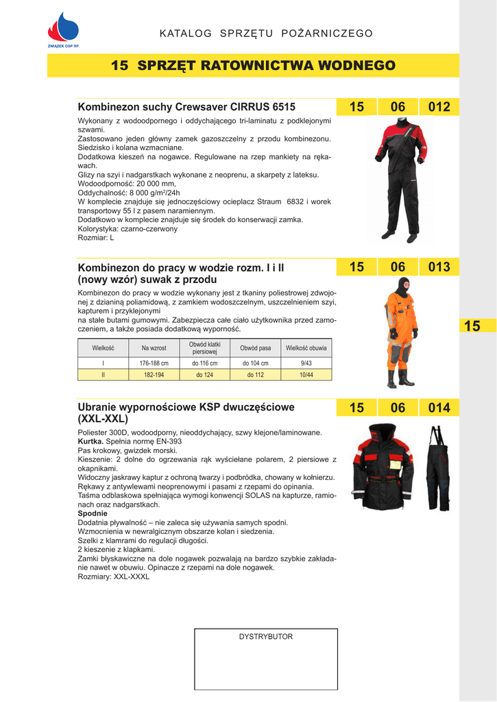 K ATA L OG SPRZĘTU POŻARNICZEGO 15 SPRZĘT RATOWNICTWA WODNEGO Kombinezon suchy Crewsaver CIRRUS 6515 Wykonany z wodoodpornego i oddychającego tri-laminatu z podklejonymi szwami. Zastosowano jeden główny zamek gazoszczelny z przodu kombinezonu. Siedzisko i kolana wzmacniane. Dodatkowa kieszeń na nogawce. Regulowane na rzep mankiety na rękawach. Glizy na szyi i nadgarstkach wykonane z neoprenu, a skarpety z lateksu. Wodoodporność: 20 000 mm, Oddychalność: 8 000 g/m2/24h W komplecie znajduje się jednoczęściowy ocieplacz Straum 6832 i worek transportowy 55 l z pasem naramiennym. Dodatkowo w komplecie znajduje się środek do konserwacji zamka. Kolorystyka: czarno-czerwony Rozmiar: L Kombinezon do pracy w wodzie rozm. I i II (nowy wzór) suwak z przodu 15 06 012 15 06 013 15 06 014 Kombinezon do pracy w wodzie wykonany jest z tkaniny poliestrowej zdwojonej z dzianiną poliamidową, z zamkiem wodoszczelnym, uszczelnieniem szyi, kapturem i przyklejonymi na stałe butami gumowymi. Zabezpiecza całe ciało użytkownika przed zamoczeniem, a także posiada dodatkową wyporność. Wielkość Na wzrost Obwód klatki piersiowej Obwód pasa Wielkość obuwia I 176-188 cm do 116 cm do 104 cm 9/43 II 182-194 do 124 do 112 10/44 Ubranie wypornościowe KSP dwuczęściowe (XXL-XXL) Poliester 300D, wodoodporny, nieoddychający, szwy klejone/laminowane. Kurtka. Spełnia normę EN-393 Pas krokowy, gwizdek morski. Kieszenie: 2 dolne do ogrzewania rąk wyściełane polarem, 2 piersiowe z okapnikami. Widoczny jaskrawy kaptur z ochroną twarzy i podbródka, chowany w kołnierzu. Rękawy z antywlewami neoprenowymi i pasami z rzepami do opinania. Taśma odblaskowa spełniająca wymogi konwencji SOLAS na kapturze, ramionach oraz nadgarstkach. Spodnie Dodatnia pływalność – nie zaleca się używania samych spodni. Wzmocnienia w newralgicznym obszarze kolan i siedzenia. Szelki z klamrami do regulacji długości. 2 kieszenie z klapkami. Zamki błyskawiczne na dole nogawek pozwalają na bardzo szybkie zakładanie nawet w obuwiu. Opinacze z rzepami na dole nogawek. Rozmiary: XXL-XXXL DYSTRYBUTOR