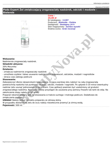 Informacje o produkcie Utworzono 07-03-2017 Podo Expert Żel zmiękczający zrogowaciały naskórek, odciski i modzele Bielenda Cena : 24,00 zł ov a. pl Nr katalogowy : 11287 Producent : Bielenda - Polska Dostępność : Dostępny 24 h Stan magazynowy : bardzo wysoki Średnia ocena : brak recenzji B ea ut yN Wskazania: Nadmiernie zrogowaciały naskórek. Składniki aktywne: 20% Mocznika Działanie: - zmiękcza nadmiernie zrogowaciały naskórek - umożliwia szybkie i łatwe usuwanie nadmiernych zrogowaceń, odcisków, modzeli i nagniotków - skraca czas zabiegu pedicure Stosowanie: Zabezpieczyć dłonie rękawiczkami lateksowymi. Kryjącą warstwę żelu nałożyć na całą zrogowaciałą powierzchnię naskórka lub punktowo na pięty, odciski, modzele i nagniotki. Po upływie 5-10 minut ewentualny nadmiar żelu usunąć jednorazowym ręcznikiem. Czas aplikacji powinien być uzależniony od grubości zrogowaciałego naskórka. Następnie należy przystąpić do usuwania przy pomocy frezarki lub tarki do stóp. Na zakończenie stopy należy umyć wodą! Preparat rekomendowany jest do stosowania w trakcie suchego i mokrego pedicure. Dodatkowo do zmiękczania paznokci. UWAGA! Należy unikać kontaktu preparatu ze zdrową skórą. W przypadku dostania się żelu do oczu należy niezwłocznie przemyć je zimną wodą. Pojemność: 500 ml Wygenerowano w programie www.oscGold.com