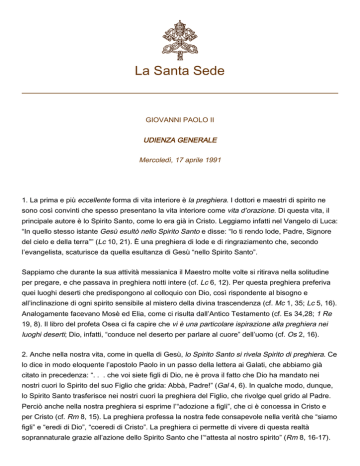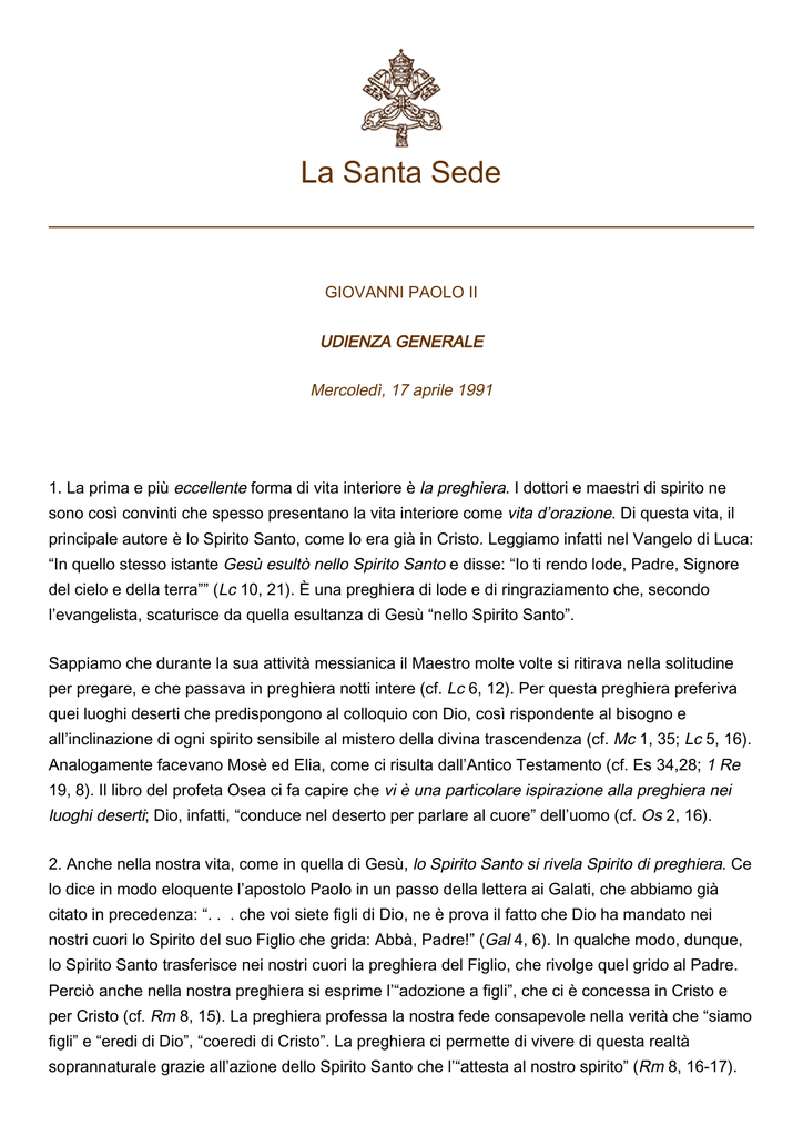 La Santa Sede GIOVANNI PAOLO II UDIENZA GENERALE Mercoledì, 17 aprile 1991 1. La prima e più eccellente forma di vita interiore è la preghiera. I dottori e maestri di spirito ne sono così convinti che spesso presentano la vita interiore come vita d’orazione. Di questa vita, il principale autore è lo Spirito Santo, come lo era già in Cristo. Leggiamo infatti nel Vangelo di Luca: “In quello stesso istante Gesù esultò nello Spirito Santo e disse: “Io ti rendo lode, Padre, Signore del cielo e della terra”” (Lc 10, 21). È una preghiera di lode e di ringraziamento che, secondo l’evangelista, scaturisce da quella esultanza di Gesù “nello Spirito Santo”. Sappiamo che durante la sua attività messianica il Maestro molte volte si ritirava nella solitudine per pregare, e che passava in preghiera notti intere (cf. Lc 6, 12). Per questa preghiera preferiva quei luoghi deserti che predispongono al colloquio con Dio, così rispondente al bisogno e all’inclinazione di ogni spirito sensibile al mistero della divina trascendenza (cf. Mc 1, 35; Lc 5, 16). Analogamente facevano Mosè ed Elia, come ci risulta dall’Antico Testamento (cf. Es 34,28; 1 Re 19, 8). Il libro del profeta Osea ci fa capire che vi è una particolare ispirazione alla preghiera nei luoghi deserti; Dio, infatti, “conduce nel deserto per parlare al cuore” dell’uomo (cf. Os 2, 16). 2. Anche nella nostra vita, come in quella di Gesù, lo Spirito Santo si rivela Spirito di preghiera. Ce lo dice in modo eloquente l’apostolo Paolo in un passo della lettera ai Galati, che abbiamo già citato in precedenza: “. . . che voi siete figli di Dio, ne è prova il fatto che Dio ha mandato nei nostri cuori lo Spirito del suo Figlio che grida: Abbà, Padre!” (Gal 4, 6). In qualche modo, dunque, lo Spirito Santo trasferisce nei nostri cuori la preghiera del Figlio, che rivolge quel grido al Padre. Perciò anche nella nostra preghiera si esprime l’“adozione a figli”, che ci è concessa in Cristo e per Cristo (cf. Rm 8, 15). La preghiera professa la nostra fede consapevole nella verità che “siamo figli” e “eredi di Dio”, “coeredi di Cristo”. La preghiera ci permette di vivere di questa realtà soprannaturale grazie all’azione dello Spirito Santo che l’“attesta al nostro spirito” (Rm 8, 16-17). 2 3. I seguaci di Cristo già dagli inizi della Chiesa sono vissuti in questa stessa fede, espressa anche nell’ora della morte. Conosciamo la preghiera di Stefano, il primo martire, un uomo “pieno di Spirito Santo”, il quale durante la lapidazione diede prova della sua particolare unione con Cristo esclamando, come il suo Maestro crocifisso, in riferimento ai suoi uccisori: “Signore, non imputar loro questo peccato!”. E poi, sempre in orazione, fissando la gloria di Cristo elevato “alla destra di Dio”, gridò: “Signore Gesù, accogli il mio spirito” (At 7, 55-60). Questa preghiera era un frutto dell’azione dello Spirito Santo nel cuore del martire. Anche negli Atti del martirio di altri confessori di Cristo, si ritrova la stessa ispirazione interiore della preghiera. In quelle pagine si esprime la coscienza cristiana formata alla scuola del Vangelo e delle Lettere degli Apostoli, e diventata coscienza della Chiesa stessa. 4. In realtà, soprattutto nell’insegnamento di San Paolo, lo Spirito Santo appare come l’autore della preghiera cristiana. Anzitutto perché sprona alla preghiera. È lui che genera il bisogno e il desiderio di ottemperare a quel “Vegliate e pregate” raccomandato da Cristo, specialmente nell’ora della tentazione, perché “lo spirito è pronto ma la carne è debole” (Mt 26, 41). Un’eco di questa esortazione sembra risonare nella esortazione della Lettera agli Efesini: “Pregate . . . incessantemente con ogni sorta di preghiere e di suppliche nello Spirito, vigilate a questo scopo con ogni perseveranza . . . perché mi sia data una parola franca, per far conoscere il mistero del Vangelo” (Ef 6, 18-19). Paolo si riconosce nella condizione degli uomini che hanno bisogno di preghiera per resistere alla tentazione e non cadere vittime della loro umana debolezza, e per far fronte alla missione a cui sono chiamati. Egli ha sempre presente e in qualche momento sente in modo quasi drammatico la consegna che gli è stata data, di essere nel mondo, specialmente in mezzo ai pagani, il testimone di Cristo e del Vangelo. E sa che ciò che è chiamato a fare e a dire è anche e soprattutto opera dello Spirito di verità, del quale Gesù ha detto: “prenderà del mio e ve l’annunzierà” (Gv 16, 14). Trattandosi di una “cosa di Cristo” che lo Spirito Santo prende per “glorificarlo” mediante l’annuncio missionario, è solo con l’entrare nel circuito di quel rapporto tra Cristo e il suo Spirito, nel mistero dell’unità col Padre, che l’uomo può svolgere una simile missione: la via d’ingresso in tale comunione è la preghiera, suscitata in noi dallo Spirito. 5. Con parole particolarmente penetranti, nella lettera ai Romani l’Apostolo mostra come “lo Spirito viene in aiuto alla nostra debolezza, perché nemmeno sappiamo che cosa sia conveniente domandare, ma lo Spirito stesso intercede con insistenza per noi, con gemiti inesprimibili (Rm 8, 26). Simili gemiti Paolo ascolta salire in qualche modo dall’intimo stesso della creazione, la quale, “attendendo la rivelazione dei figli di Dio”, con la speranza di “essere liberata dalla schiavitù della corruzione, geme e soffre quasi nelle doglie del parto” (Rm 8, 19.21-22). E su questo scenario, storico e spirituale, opera lo Spirito Santo: “Colui che scruta i cuori (Dio) sa quali sono i desideri dello Spirito, poiché Egli intercede per i credenti secondo i disegni di Dio” (Rm 8, 27). Siamo alla radice più intima e profonda della preghiera. Paolo ce la addita e ci fa dunque comprendere che lo Spirito Santo non soltanto ci sprona alla preghiera, ma Egli stesso prega in 3 noi! 6. Lo