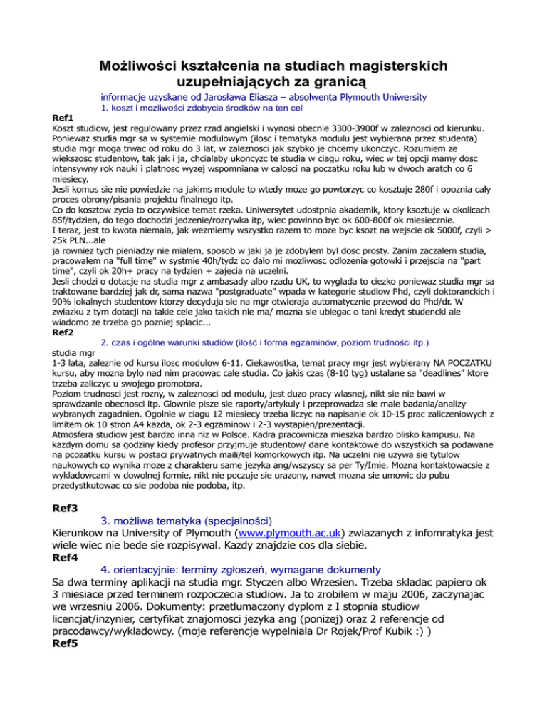 Możliwości kształcenia na studiach magisterskich uzupełniających za granicą informacje uzyskane od Jarosława Eliasza – absolwenta Plymouth Uniwersity 1. koszt i mozliwości zdobycia środków na ten cel Ref1 Koszt studiow, jest regulowany przez rzad angielski i wynosi obecnie 3300-3900f w zaleznosci od kierunku. Poniewaz studia mgr sa w systemie modulowym (ilosc i tematyka modulu jest wybierana przez studenta) studia mgr moga trwac od roku do 3 lat, w zaleznosci jak szybko je chcemy ukonczyc. Rozumiem ze wiekszosc studentow, tak jak i ja, chcialaby ukoncyzc te studia w ciagu roku, wiec w tej opcji mamy dosc intensywny rok nauki i platnosc wyzej wspomniana w calosci na poczatku roku lub w dwoch aratch co 6 miesiecy. Jesli komus sie nie powiedzie na jakims module to wtedy moze go powtorzyc co kosztuje 280f i opoznia caly proces obrony/pisania projektu finalnego itp. Co do kosztow zycia to oczywisice temat rzeka. Uniwersytet udostpnia akademik, ktory ksoztuje w okolicach 85f/tydzien, do tego dochodzi jedzenie/rozrywka itp, wiec powinno byc ok 600-800f ok miesiecznie. I teraz, jest to kwota niemala, jak wezmiemy wszystko razem to moze byc ksozt na wejscie ok 5000f, czyli > 25k PLN...ale ja rowniez tych pieniadzy nie mialem, sposob w jaki ja je zdobylem byl dosc prosty. Zanim zaczalem studia, pracowalem na "full time" w systmie 40h/tydz co dalo mi mozliwosc odlozenia gotowki i przejscia na "part time", czyli ok 20h+ pracy na tydzien + zajecia na uczelni. Jesli chodzi o dotacje na studia mgr z ambasady albo rzadu UK, to wyglada to ciezko poniewaz studia mgr sa traktowane bardziej jak dr, sama nazwa "postgraduate" wpada w kategorie studiow Phd, czyli doktoranckich i 90% lokalnych studentow ktorzy decyduja sie na mgr otwieraja automatycznie przewod do Phd/dr. W zwiazku z tym dotacji na takie cele jako takich nie ma/ mozna sie ubiegac o tani kredyt studencki ale wiadomo ze trzeba go pozniej splacic... Ref2 2. czas i ogólne warunki studiów (ilość i forma egzaminów, poziom trudności itp.) studia mgr 1-3 lata, zaleznie od kursu ilosc modulow 6-11. Ciekawostka, temat pracy mgr jest wybierany NA POCZATKU kursu, aby mozna bylo nad nim pracowac cale studia. Co jakis czas (8-10 tyg) ustalane sa "deadlines" ktore trzeba zaliczyc u swojego promotora. Poziom trudnosci jest rozny, w zaleznosci od modulu, jest duzo pracy wlasnej, nikt sie nie bawi w sprawdzanie obecnosci itp. Glownie pisze sie raporty/artykuly i przeprowadza sie male badania/analizy wybranych zagadnien. Ogolnie w ciagu 12 miesiecy trzeba liczyc na napisanie ok 10-15 prac zaliczeniowych z limitem ok 10 stron A4 kazda, ok 2-3 egzaminow i 2-3 wystapien/prezentacji. Atmosfera studiow jest bardzo inna niz w Polsce. Kadra pracownicza mieszka bardzo blisko kampusu. Na kazdym domu sa godziny kiedy profesor przyjmuje studentow/ dane kontaktowe do wszystkich sa podawane na pcozatku kursu w postaci prywatnych maili/tel komorkowych itp. Na uczelni nie uzywa sie tytulow naukowych co wynika moze z charakteru same jezyka ang/wszyscy sa per Ty/Imie. Mozna kontaktowacsie z wykladowcami w dowolnej formie, nikt nie poczuje sie urazony, nawet mozna sie umowic do pubu przedystkutowac co sie podoba nie podoba, itp. Ref3 3. możliwa tematyka (specjalności) Kierunkow na University of Plymouth (www.plymouth.ac.uk) zwiazanych z infomratyka jest wiele wiec nie bede sie rozpisywal. Kazdy znajdzie cos dla siebie. Ref4 4. orientacyjnie: terminy zgłoszeń, wymagane dokumenty Sa dwa terminy aplikacji na studia mgr. Styczen albo Wrzesien. Trzeba skladac papiero ok 3 miesiace przed terminem rozpoczecia studiow. Ja to zrobilem w maju 2006, zaczynajac we wrzesniu 2006. Dokumenty: przetlumaczony dyplom z I stopnia studiow licencjat/inzynier, certyfikat znajomosci jezyka ang (ponizej) oraz 2 referencje od pracodawcy/wykladowcy. (moje referencje wypelniala Dr Rojek/Prof Kubik :) ) Ref5 5. wymagania odnośnie poziomu znajomości języka Jesli chodzi o kezyk ang to tutaj sa dwie opcje. I opcja Udac sie do opiekuna wybranego kierunku i poprosic go o ocene swoich mozliwosci. Z reguly sa to ludzie, ktorzy "od reki" porozmawiaja, ocenia czy poziom ang. jest wystraczajacy do podjecia studiow. Jesli ich odp bedzie OK, to potem bedzie drugie spotkanie na ktorym beda konkretne pytania o I stopien studiow, itp, zwiazane scisle z nauka. Jelsi to bedzie tez OK, to taki student nie musi zdawac zadnych certyfikatow, moze spokojnie aplikowac na studia. II opcja Opiekun sie nie zgadza lub poziom ang jest slaby, wtedy trzeba zdac jeden z dwoch egzaminow IELTS/TEOFL. Egzaminy Cambridge FCE/CAE/CEP nie sa UZNAWANE przez angielskie uczlenie. Oba egzmainy sa opisane na stronie konsulatu wiec nie bede sie rozpisywal. Limit na University of Plymouth jest 6.5/9 aby sie dostac. Link do strony uniwersytetu: www.plymouth.ac.uk Dodatkowe informacje: www.studiuj.org Mozna rowniez umiescic kontakt do mnie bezposrednio Jarek Eliasz [email protected] [email protected]