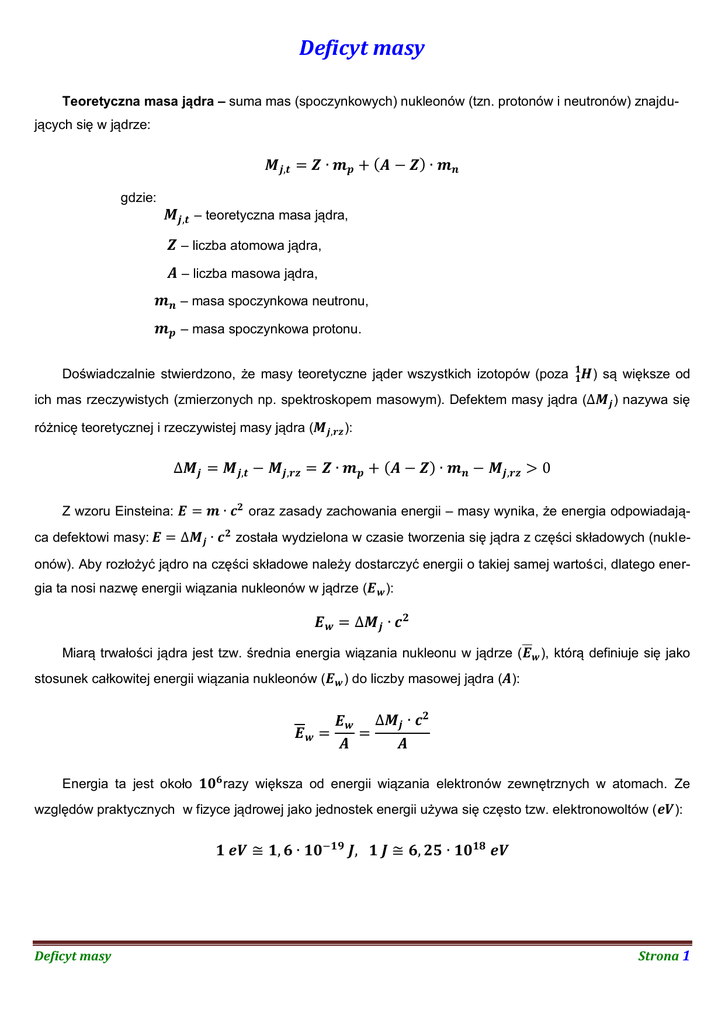 Deficyt masy Teoretyczna masa jądra – suma mas (spoczynkowych) nukleonów (tzn. protonów i neutronów) znajdujących się w jądrze: gdzie: – teoretyczna masa jądra, – liczba atomowa jądra, – liczba masowa jądra, – masa spoczynkowa neutronu, – masa spoczynkowa protonu. Doświadczalnie stwierdzono, że masy teoretyczne jąder wszystkich izotopów (poza ich mas rzeczywistych (zmierzonych np. spektroskopem masowym). Defektem masy jądra ( różnicę teoretycznej i rzeczywistej masy jądra ( Z wzoru Einsteina: ca defektowi masy: ) są większe od ) nazywa się ): oraz zasady zachowania energii – masy wynika, że energia odpowiadajązostała wydzielona w czasie tworzenia się jądra z części składowych (nukle- onów). Aby rozłożyć jądro na części składowe należy dostarczyć energii o takiej samej wartości, dlatego energia ta nosi nazwę energii wiązania nukleonów w jądrze ( ): Miarą trwałości jądra jest tzw. średnia energia wiązania nukleonu w jądrze ( stosunek całkowitej energii wiązania nukleonów ( Energia ta jest około ), którą definiuje się jako ) do liczby masowej jądra ( ): razy większa od energii wiązania elektronów zewnętrznych w atomach. Ze względów praktycznych w fizyce jądrowej jako jednostek energii używa się często tzw. elektronowoltów ( Deficyt masy ): Strona 1 Średnie energie wiązania nukleonu dla jąder lekkich wykazują duże wahania wartości (szczególnie dużą wartość tej energii mają jądra: to znaczy jądra o jednakowej liczbie protonów i neutronów). Przy zwiększaniu liczby masowej (do energia ta powoli rośnie do około , po czym (dla ) ) zaczyna stopniowo maleć do około . Z przebiegu krzywej można wnioskować, w jakich przypadkach zostanie w reakcjach jądrowych wyzwolona energia. Ma to miejsce w sytuacji, gdy układ jądrowy o danej średniej energii wiązania układ o większej energii wiązania przechodzi w , wówczas całkowita ilość wydzielonej energii wyraża się zależnością: Tego rodzaju reakcje zachodzą podczas łączenia się jąder lekkich w jądra cięższe ( reakcje syntezy termo- jądrowej) lub podczas rozszczepienia jąder ciężkich na lżejsze (np. podczas reakcji łańcuchowej). Deficyt masy Strona 2