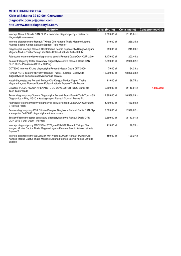MOTO DIAGNOSTYKA Kicin ul.Szkolna 32 62-004 Czerwonak [email protected] http://www.motodiagnostyka.com/ Produkty Interfejs Renault Sonda CAN CLIP + Komputer diagnostyczny - zestaw do diagnostyki serwisowej Cena (brutto) Cena (netto) 2.599,00 zł 2.113,01 zł Interfejs diagnostyczny Renault Twingo Clio Kangoo Thalia Megane Laguna Fluence Scenic Koleos Latitude Espace Trafic Master 319,00 zł 259,35 zł Diagnostyka interfejs Renault OBD2 Grand Scenic Espace Clio Kangoo Laguna Megane Modus Thalia Twingo Vel Satis Koleos Latitude Trafic II III IV 299,00 zł 243,09 zł Fabryczny tester serwisowy diagnostyka serwis Renault Dacia CAN CLIP 2016 1.479,00 zł 1.202,44 zł Zestaw Fabryczny tester serwisowy diagnostyka serwis Renault Dacia CAN CLIP 2016+ Panasonic CF19 + ReProg 3.599,00 zł 2.926,02 zł DDT2000 Interfejs K-Line diagnostyka Renault Nissan Dacia DDT 2000 Renault NG10 Tester Fabryczny Renault Trucks + Laptop - Zestaw do diagnostyki na poziomie autoryzowanego serwisu Kabel diagnostyczny Renault Twingo Clio Kangoo Modus Captur Thalia Megane Laguna Fluence Scenic Koleos Latitude Espace Trafic Master Dev2tool VOLVO / MACK / RENAULT / UD DEVELOPER TOOL Euro6 dla Tech Tool i Vcads 79,00 zł 64,23 zł 16.999,00 zł 13.820,33 zł 119,00 zł 96,75 zł 2.599,00 zł 2.113,01 zł Tester diagnostyczny Vocom Diagnostyka Renault Truck Euro 6 Tech Tool NG3 Diagnostica + Diag NG10 + katalog części Renault Consult Trucks PL 12.999,00 zł 10.568,29 zł Fabryczny tester serwisowy diagnostyka serwis Renault Dacia CAN CLIP 2016 + ReProg Flash 1.799,00 zł 1.462,60 zł Zestaw diagnostyczny PSA Citroen Peugeot Diagbox + Renault Dacia CAN Clip + komputer Dell D630 diagnostyka aut francuskich 3.599,00 zł 2.926,02 zł Zestaw Fabryczny tester serwisowy diagnostyka serwis Renault Dacia CAN CLIP 2016 + Dell D630 + ReProg 2.599,00 zł 2.113,01 zł Interfejs diagnostyczny OBD2 iCar BT Vgate ELM327 Renault Twingo Clio Kangoo Modus Captur Thalia Megane Laguna Fluence Scenic Koleos Latitude Espace T 119,00 zł 96,75 zł Interfejs diagnostyczny OBD2 iCar WiFi Vgate ELM327 Renault Twingo Clio Kangoo Modus Captur Thalia Megane Laguna Fluence Scenic Koleos Latitude Espace 159,00 zł 129,27 zł Cena promocyjna 1.899,00 zł