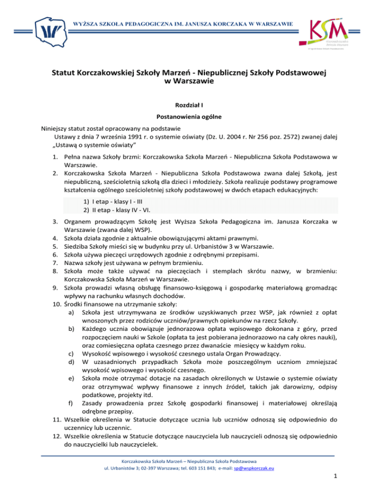 WYŻSZA SZKOŁA PEDAGOGICZNA IM. JANUSZA KORCZAKA W WARSZAWIE Statut Korczakowskiej Szkoły Marzeń - Niepublicznej Szkoły Podstawowej w Warszawie Rozdział I Postanowienia ogólne Niniejszy statut został opracowany na podstawie Ustawy z dnia 7 września 1991 r. o systemie oświaty (Dz. U. 2004 r. Nr 256 poz. 2572) zwanej dalej „Ustawą o systemie oświaty” 1. Pełna nazwa Szkoły brzmi: Korczakowska Szkoła Marzeń - Niepubliczna Szkoła Podstawowa w Warszawie. 2. Korczakowska Szkoła Marzeń - Niepubliczna Szkoła Podstawowa zwana dalej Szkołą, jest niepubliczną, sześcioletnią szkołą dla dzieci i młodzieży. Szkoła realizuje podstawy programowe kształcenia ogólnego sześcioletniej szkoły podstawowej w dwóch etapach edukacyjnych: 1) I etap - klasy I - III 2) II etap - klasy IV - VI. 3. Organem prowadzącym Szkołę jest Wyższa Szkoła Pedagogiczna im. Janusza Korczaka w Warszawie (zwana dalej WSP). 4. Szkoła działa zgodnie z aktualnie obowiązującymi aktami prawnymi. 5. Siedziba Szkoły mieści się w budynku przy ul. Urbanistów 3 w Warszawie. 6. Szkoła używa pieczęci urzędowych zgodnie z odrębnymi przepisami. 7. Nazwa szkoły jest używana w pełnym brzmieniu. 8. Szkoła może także używać na pieczęciach i stemplach skrótu nazwy, w brzmieniu: Korczakowska Szkoła Marzeń w Warszawie. 9. Szkoła prowadzi własną obsługę finansowo-księgową i gospodarkę materiałową gromadząc wpływy na rachunku własnych dochodów. 10. Środki finansowe na utrzymanie szkoły: a) Szkoła jest utrzymywana ze środków uzyskiwanych przez WSP, jak również z opłat wnoszonych przez rodziców uczniów/prawnych opiekunów na rzecz Szkoły. b) Każdego ucznia obowiązuje jednorazowa opłata wpisowego dokonana z góry, przed rozpoczęciem nauki w Szkole (opłata ta jest pobierana jednorazowo na cały okres nauki), oraz comiesięczna opłata czesnego przez dwanaście miesięcy w każdym roku. c) Wysokość wpisowego i wysokość czesnego ustala Organ Prowadzący. d) W uzasadnionych przypadkach Szkoła może poszczególnym uczniom zmniejszać wysokość wpisowego i wysokość czesnego. e) Szkoła może otrzymać dotacje na zasadach określonych w Ustawie o systemie oświaty oraz otrzymywać wpływy finansowe z innych źródeł, takich jak darowizny, odpisy podatkowe, projekty itd. f) Zasady prowadzenia przez Szkołę gospodarki finansowej i materiałowej określają odrębne przepisy. 11. Wszelkie określenia w Statucie dotyczące ucznia lub uczniów odnoszą się odpowiednio do uczennicy lub uczennic. 12. Wszelkie określenia w Statucie dotyczące nauczyciela lub nauczycieli odnoszą się odpowiednio do nauczycielki lub nauczycielek. Korczakowska Szkoła Marzeń – Niepubliczna Szkoła Podstawowa ul. Urbanistów 3; 02-397 Warszawa; tel. 603 151 843; e-mail: [email protected] 1 WYŻSZA SZKOŁA PEDAGOGICZNA IM. JANUSZA KORCZAKA W WARSZAWIE Rozdział II Cele i zadania szkoły 1. Szkoła realizuje cele i zadania określone w Ustawie o systemie oświaty oraz przepisach wykonawczych wydanych na jej podstawie kierując się zasadami zawartymi w: a) Konstytucji Rzeczypospolitej Polskiej, b) Powszechnej Deklaracji Praw Człowieka, c) Międzynarodowej Konwencji Praw Dziecka. 2. Cele i zadania Szkoły reguluje niniejszy Statut Szkoły. 3. Szkoła realizuje cele i zadania: 3.1. W zakresie dydaktycznym poprzez zapewnienie uczniom: a) Prowadzenia wszystkich typów i form zajęć na wysokim poziomie merytorycznym w tym nauki poprawnego i swobodnego wypowiadania się, pisania i czytania ze zrozumieniem, b) Poznawania wymaganych pojęć i zdobywania rzetelnej wiedzy na poziomie umożliwiającym, co najmniej kontynuacje nauki na następnym etapie kształcenia, c) Stosowania zróżnicowanych metod nauczania, trafnie dobranych do poziomu uczniów i treści programu, d) Dochodzenia do rozumienia, a nie tylko do pamięciowego opanowania przekazanych treści oraz stopniowanie poziomu wymagań wiedzy i umiejętności, e) Rozwijania zdolności do dostrzegania różnego rodzaju związków i zależności, f) Rozwijania zdolności myślenia analitycznego i syntetycznego, g) Traktowania wiadomości przedmiotowych w sposób integralny, prowadzących do lepszego rozumienia świata, ludzi i siebie oraz korzystania i umiejętnego segregowania informacji z wielu źródeł, h) Poznawania zasad rozwoju osobowego i życia społecznego, i) Poznawania i poszanowania dziedzictwa kultury narodowej w celu kształtowania postaw miłości do ojczyzny przy jednoczesnym respektowaniu wartości kultur i cywilizacji Europy i świata, j) Umiejętnego rozwijania osobistych zainteresowań, k) Pełne wykorzystanie bazy dydaktycznej, ciągłe jej unowocześnianie, l) Prowadzenie zajęć pozalekcyjnych, kół zainteresowań w ramach posiadanych środków, m) Przeprowadzenie wycieczek programowych. 3.2. W zakresie wychowawczym tak żeby uczniowie: a) Czuli się w Szkole bezpiecznie i mieli w niej oparcie, b) Znajdowali w Szkole środowisko wszechstronnego rozwoju osobowego, przede wszystkim intelektualnego, moralnego i duchowego, c) Rozwijali w sobie dociekliwość poznawczą, ukierunkowaną na poszukiwanie prawdy, dobra i piękna w świecie, a także umiejętność przewidywania zagrożeń i radzenia sobie z nimi oraz rozwiązywania problemów, d) Mieli świadomość życiowej użyteczności zarówno poszczególnych przedmiotów nauczania, jak całej edukacji na danym etapie, Korczakowska Szkoła Marzeń – Niepubliczna Szkoła Podstawowa ul. Urbanistów 3; 02-397 Warszawa; tel. 603 151 843; e-mail: [email protected] 2 WYŻSZA SZKOŁA PEDAGOGICZNA IM. JANUSZA KORCZAKA W WARSZAWIE e) f) g) h) i) j) k) Stali się coraz bardziej samodzielni w dążeniu do dobra w jego wymiarze indywidualnym i społecznym, godząc umiejętnie dążenie do dobra własnego z dobrem innych, łącząc odpowiedzialność za siebie z odpowiedzialnością za innych, Uczyli się szacunku dla dobra wspólnego jako podstawy życia społecznego oraz prz