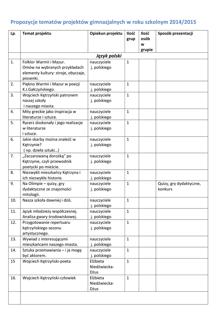 Propozycje tematów projektów gimnazjalnych w roku