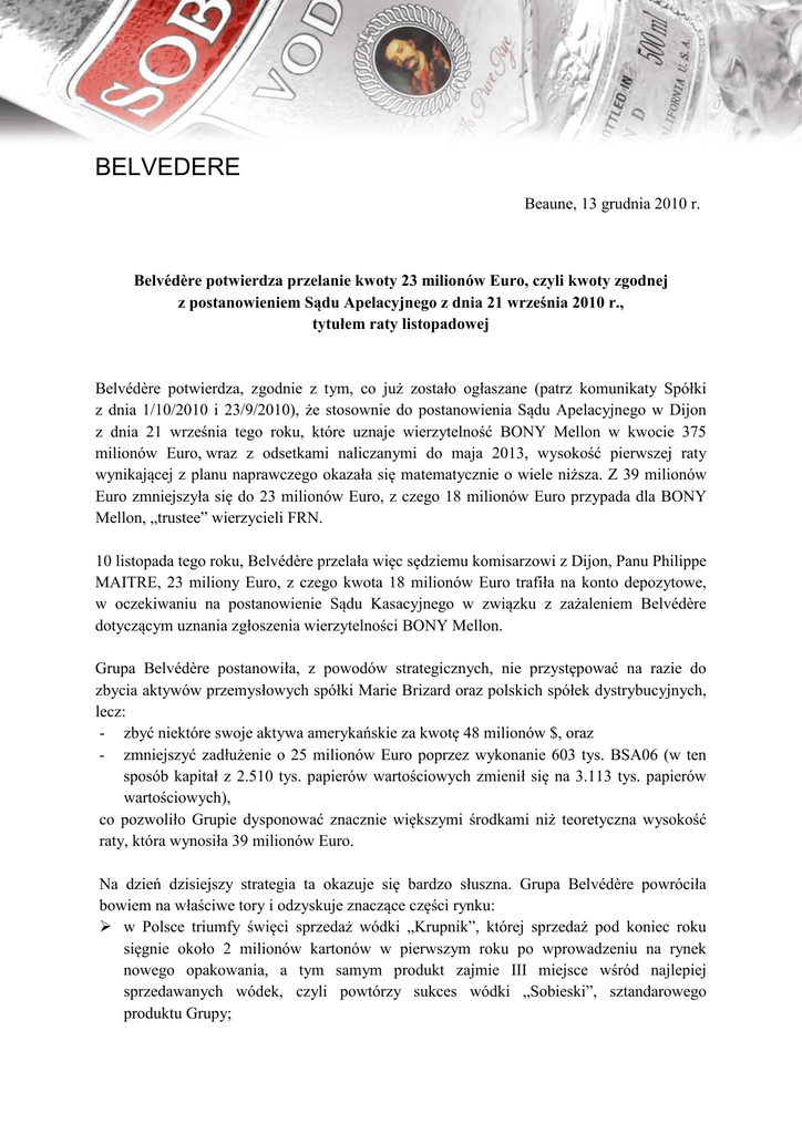 BELVEDERE Beaune, 13 grudnia 2010 r. Belvédère potwierdza przelanie kwoty 23 milionów Euro, czyli kwoty zgodnej z postanowieniem Sądu Apelacyjnego z dnia 21 września 2010 r., tytułem raty listopadowej Belvédère potwierdza, zgodnie z tym, co już zostało ogłaszane (patrz komunikaty Spółki z dnia 1/10/2010 i 23/9/2010), że stosownie do postanowienia Sądu Apelacyjnego w Dijon z dnia 21 września tego roku, które uznaje wierzytelność BONY Mellon w kwocie 375 milionów Euro, wraz z odsetkami naliczanymi do maja 2013, wysokość pierwszej raty wynikającej z planu naprawczego okazała się matematycznie o wiele niższa. Z 39 milionów Euro zmniejszyła się do 23 milionów Euro, z czego 18 milionów Euro przypada dla BONY Mellon, „trustee” wierzycieli FRN. 10 listopada tego roku, Belvédère przelała więc sędziemu komisarzowi z Dijon, Panu Philippe MAITRE, 23 miliony Euro, z czego kwota 18 milionów Euro trafiła na konto depozytowe, w oczekiwaniu na postanowienie Sądu Kasacyjnego w związku z zażaleniem Belvédère dotyczącym uznania zgłoszenia wierzytelności BONY Mellon. Grupa Belvédère postanowiła, z powodów strategicznych, nie przystępować na razie do zbycia aktywów przemysłowych spółki Marie Brizard oraz polskich spółek dystrybucyjnych, lecz: - zbyć niektóre swoje aktywa amerykańskie za kwotę 48 milionów $, oraz - zmniejszyć zadłużenie o 25 milionów Euro poprzez wykonanie 603 tys. BSA06 (w ten sposób kapitał z 2.510 tys. papierów wartościowych zmienił się na 3.113 tys. papierów wartościowych), co pozwoliło Grupie dysponować znacznie większymi środkami niż teoretyczna wysokość raty, która wynosiła 39 milionów Euro. Na dzień dzisiejszy strategia ta okazuje się bardzo słuszna. Grupa Belvédère powróciła bowiem na właściwe tory i odzyskuje znaczące części rynku: w Polsce triumfy święci sprzedaż wódki „Krupnik”, której sprzedaż pod koniec roku sięgnie około 2 milionów kartonów w pierwszym roku po wprowadzeniu na rynek nowego opakowania, a tym samym produkt zajmie III miejsce wśród najlepiej sprzedawanych wódek, czyli powtórzy sukces wódki „Sobieski”, sztandarowego produktu Grupy; we Francji, sprzedaż wódki “Sobieski” również odnotowuje spektakularny wzrost i zajmuje 13% rynku na przestrzeni 2 lat; w Azji (w szczególności w Chinach i w Indiach), gdzie Grupa inwestuje; w USA, gdzie sprzedaż w 21010 zbliża się do miliona kartonów, dzięki wsparciu Bruce’a Willis’a, akcjonariusza marki, który pragnie, by wódka „Sobieski” jak najszybciej odniosła światowy sukces. Z okazji zbliżającego się Nowego Roku kierownictwo oraz współpracownicy Grupy pragną złożyć Akcjonariuszom najserdeczniejsze życzenia na rok 2011, podziękować im za okazane zaufanie oraz zapewnić, że mocno wierzą w przyszłość Belvédère. Kontakt Belvédère: Jacques Rouvroy, +33 (0) 3 80 22 93 83 Kontakt dla Akcjonariuszy: Olivier Balva, [email protected] Kontakt ALMEA: Murielle Plavis: 01 47 23 05 42