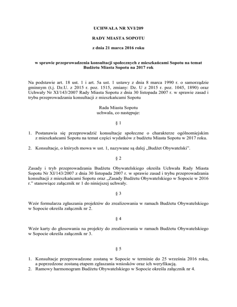 UCHWAŁA NR XVI/209 RADY MIASTA SOPOTU z dnia 21 marca 2016 roku w sprawie przeprowadzenia konsultacji społecznych z mieszkańcami Sopotu na temat Budżetu Miasta Sopotu na 2017 rok Na podstawie art. 18 ust. 1 i art. 5a ust. 1 ustawy z dnia 8 marca 1990 r. o samorządzie gminnym (t.j. Dz.U. z 2015 r. poz. 1515, zmiany: Dz. U z 2015 r. poz. 1045, 1890) oraz Uchwały Nr XI/143/2007 Rady Miasta Sopotu z dnia 30 listopada 2007 r. w sprawie zasad i trybu przeprowadzania konsultacji z mieszkańcami Sopotu Rada Miasta Sopotu uchwala, co następuje: §1 1. Postanawia się przeprowadzić konsultacje społeczne o charakterze ogólnomiejskim z mieszkańcami Sopotu na temat części wydatków z budżetu Miasta Sopotu w 2017 roku. 2. Konsultacje, o których mowa w ust. 1, nazywane są dalej „Budżet Obywatelski”. §2 Zasady i tryb przeprowadzania Budżetu Obywatelskiego określa Uchwała Rady Miasta Sopotu Nr XI/143/2007 z dnia 30 listopada 2007 r. w sprawie zasad i trybu przeprowadzania konsultacji z mieszkańcami Sopotu oraz „Zasady Budżetu Obywatelskiego w Sopocie w 2016 r.” stanowiące załącznik nr 1 do niniejszej uchwały. §3 Wzór formularza zgłaszania projektów do zrealizowania w ramach Budżetu Obywatelskiego w Sopocie określa załącznik nr 2. §4 Wzór karty do głosowania na projekty do zrealizowania w ramach Budżetu Obywatelskiego w Sopocie określa załącznik nr 3. §5 1. Konsultacje przeprowadzone zostaną w Sopocie w terminie do 25 września 2016 roku, a poprzedzone zostaną etapem zgłaszania wniosków oraz ich weryfikacją. 2. Ramowy harmonogram Budżetu Obywatelskiego w Sopocie określa załącznik nr 4. §6 Upoważnia się Prezydenta Miasta Sopotu do powołania zespołu ds. konsultacji oraz określenia regulaminu jego działania. §7 Wykonanie uchwały powierza się Prezydentowi Miasta Sopotu. §8 Uchwała wchodzi w życie po upływie 14 dni od dnia jej ogłoszenia w Dzienniku Urzędowym Województwa Pomorskiego. PRZEWODNICZĄCY RADY MIASTA SOPOTU /-/ dr inż. Wieczesław Augustyniak Radca Prawny /-/ Ewa Frymark Załącznik nr 1 do uchwały nr XVI/209 Rady Miasta Sopotu z dnia 21 marca 2016 roku ZASADY BUDŻETU OBYWATELSKIEGO W SOPOCIE w 2016 r. Rozdział 1 Postanowienia ogólne §1 1. Konsultacje społeczne w sprawie części wydatków z budżetu miasta Sopotu określane są jako „Budżet Obywatelski”. 2. Postuluje się, że kwota z budżetu miasta Sopotu, której dotyczy Budżet Obywatelski, w 2017 r. łącznie wyniesie około 4 miliony zł. 3. W ramach Budżetu Obywatelskiego mogą być proponowane wydatki o charakterze lokalnym (dotyczące określonego rejonu miasta) oraz ogólnomiejskim (dotyczące mieszkańców całego miasta). 4. Postuluje się, że kwota przeznaczona na finansowanie projektów o charakterze lokalnym w 2017 r. wyniesie nie mniej niż 2 miliony złotych, tj. nie mniej niż 0,5 miliona złotych z przeznaczeniem na każdy z czterech okręgów. Rozdział 2 Zgłaszanie projektów §2 Propozycję projektu do zrealizowania w ramach budżetu obywatelskiego może zgłosić: a) każdy mieszkaniec Sopotu, który ukończył 16 rok życia, b) organizacja pozarządowa, której siedziba, siedziba oddziału lub realizacja zadań publicznych odbywa się na terenie Gminy Miasta Sopotu na podstawie ustawy o działalności pożytku publicznego i wolontariacie. §3 1. Formularz zgłaszania projektów do zrealizowania w ramach Budżetu Obywatelskiego w Sopocie jest dostępny na stronie internetowej Miasta Sopotu, w Biurze Rady Miasta Sopotu, w Urzędzie Miasta oraz w filiach Biblioteki Miejskiej. 2. Projekty mogą dotyczyć wszystkich spraw, które mieszczą się w kompetencjach gminy. 3. Opracowywanie szacunkowych kosztów dla projektów zapewnia Prezydent Miasta Sopotu w uzgodnieniu z Komisją ds. Budżetu Obywatelskiego. 4. Wypełnione formularze projektów składa się w wersji pisemnej w Urzędzie Miasta Sopotu (również korespondencyjnie) lub przesyła się je w wersji elektronicznej przez stronę www.obywatelskisopot.pl. Rozdział 3 Weryfikacja projektów §4 1. Komisja ds. Budżetu Obywatelskiego, w uzgodnieniu z Prezydentem Miasta Sopotu, przeprowadza weryfikację zgłoszonych projektów pod względem gospodarności oraz formalno–prawnym. 2. Decyzję o odrzuceniu projektu podejmuje Komisja ds. Budżetu Obywatelskiego w uzgodnieniu z Prezydentem Miasta, zwykłą większością głosów. 3. Pozytywnie oraz negatywnie zweryfikowane projekty publikowane będą niezwłocznie wraz z uzasadnieniem na stronie internetowej Miasta. 4. Ostateczna realizacja projektów wskazanych przez mieszkańców nastąpi po zatwierdzeniu projektu Budżetu Miasta Sopotu na rok 2017 przez Radę Miasta Sopotu. Rozdział 4 Wybór projektów §5 1. Projekty są oceniane w głosowaniu tajnym. 2. Prawo udziału w głosowaniu ma każdy mieszkaniec Sopotu, który ukończył 16 rok życia. §6 1. Głosowanie przeprowadza się w Urzędzie Miasta Sopotu oraz w wyznaczonych punktach do głosowania. 2. Listę punktów do głosowania podaje się do publicznej wiadomości. 3. Oddanie głosu następuje poprzez wrzucenie karty do urny, po uprzednim okazaniu dokumentu potwierdzającego tożsamość i złożeniu podpisu potwierdzającego oddanie głosu lub poprzez przesłanie wypełnionej karty do głosowania drogą elektroniczną, wraz z podaniem imienia, nazwiska i numeru pesel. 4. W każdym z punktów do głosowania udostępnia się pełne opisy wszystkich projektów. §7 1. Głosowanie odbywa się poprzez postawienie znaku „X” przy wybranych projektach na karcie do głosowania. Głosujący wybiera maksymalnie pięć, jego zdaniem, najważniejszych projektów. 2. Jeżeli głosujący nie zaznaczył żadnego pola, lub zaznaczył więcej niż pięć pozycji jest to traktowane jako głos nieważny. 3. Na karcie do głosowania podaje się osobno informacje o projektach o charakterze lokalnym oraz ogólnomiejskim. 4. Na karcie do głosowania podaje się tytuły projektów, szacunkowy koszt