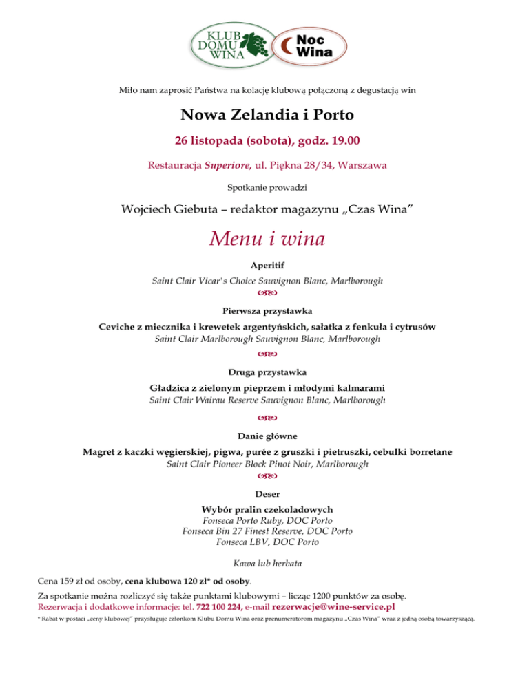 Miło nam zaprosić Państwa na kolację klubową połączoną z degustacją win Nowa Zelandia i Porto 26 listopada (sobota), godz. 19.00 Restauracja Superiore, ul. Piękna 28/34, Warszawa Spotkanie prowadzi Wojciech Giebuta – redaktor magazynu „Czas Wina” Menu i wina Aperitif Saint Clair Vicar's Choice Sauvignon Blanc, Marlborough Pierwsza przystawka Ceviche z miecznika i krewetek argentyńskich, sałatka z fenkuła i cytrusów Saint Clair Marlborough Sauvignon Blanc, Marlborough Druga przystawka Gładzica z zielonym pieprzem i młodymi kalmarami Saint Clair Wairau Reserve Sauvignon Blanc, Marlborough Danie główne Magret z kaczki węgierskiej, pigwa, purée z gruszki i pietruszki, cebulki borretane Saint Clair Pioneer Block Pinot Noir, Marlborough Deser Wybór pralin czekoladowych Fonseca Porto Ruby, DOC Porto Fonseca Bin 27 Finest Reserve, DOC Porto Fonseca LBV, DOC Porto Kawa lub herbata Cena 159 zł od osoby, cena klubowa 120 zł* od osoby. Za spotkanie można rozliczyć się także punktami klubowymi – licząc 1200 punktów za osobę. Rezerwacja i dodatkowe informacje: tel. 722 100 224, e-mail [email protected] * Rabat w postaci „ceny klubowej” przysługuje członkom Klubu Domu Wina oraz prenumeratorom magazynu „Czas Wina” wraz z jedną osobą towarzyszącą.