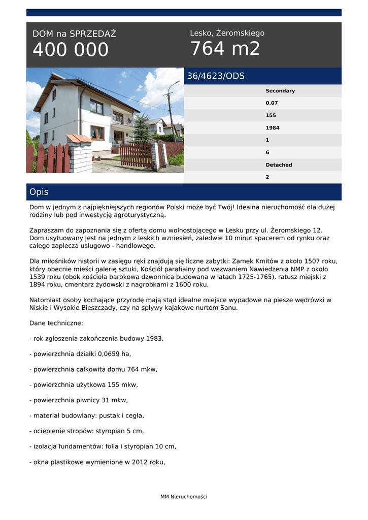 Lesko, Żeromskiego DOM na SPRZEDAŻ 764 m2 400 000 36/4623/ODS Secondary 0.07 155 1984 1 6 Detached 2 Opis Dom w jednym z najpiękniejszych regionów Polski może być Twój! Idealna nieruchomość dla dużej rodziny lub pod inwestycję agroturystyczną. Zapraszam do zapoznania się z ofertą domu wolnostojącego w Lesku przy ul. Żeromskiego 12. Dom usytuowany jest na jednym z leskich wzniesień, zaledwie 10 minut spacerem od rynku oraz całego zaplecza usługowo - handlowego. Dla miłośników historii w zasięgu ręki znajdują się liczne zabytki: Zamek Kmitów z około 1507 roku, który obecnie mieści galerię sztuki, Kościół parafialny pod wezwaniem Nawiedzenia NMP z około 1539 roku (obok kościoła barokowa dzwonnica budowana w latach 1725-1765), ratusz miejski z 1894 roku, cmentarz żydowski z nagrobkami z 1600 roku. Natomiast osoby kochające przyrodę mają stąd idealne miejsce wypadowe na piesze wędrówki w Niskie i Wysokie Bieszczady, czy na spływy kajakowe nurtem Sanu. Dane techniczne: - rok zgłoszenia zakończenia budowy 1983, - powierzchnia działki 0,0659 ha, - powierzchnia całkowita domu 764 mkw, - powierzchnia użytkowa 155 mkw, - powierzchnia piwnicy 31 mkw, - materiał budowlany: pustak i cegła, - ocieplenie stropów: styropian 5 cm, - izolacja fundamentów: folia i styropian 10 cm, - okna plastikowe wymienione w 2012 roku, MM Nieruchomości - schody betonowe, pokrycie drewniane, - ogrzewanie gazowe (2006 rok) oraz CO na węgiel i drewno (Zębiec 2006 rok), - kanalizacja miejska, - roczne koszty gazu ok. 3000 zł, - garaż wolnostojący - jednostanowiskowy z blachy (widoczny na zdjęciu). Chcesz wziąć kredyt hipoteczny, lub gotówkowy? OFERTA PONAD 40 BANKÓW W JEDNYM MIEJSCU U Nas kupisz nieruchomość i weźmiesz kredyt. ZADZWOŃ JUŻ TERAZ I ZAPYTAJ MNIE O SZCZEGÓŁY! MM Nieruchomości oddział w Sanoku tel. +48 13 492 41 61 +48 881-799-704 ZAPŁACISZ TYLKO WTEDY, KIEDY OKAŻEMY SIĘ SKUTECZNI! MM 360 tel. +48 881 799 704; +48 13 492 41 61 email: [email protected] MM Nieruchomości Powered by TCPDF (www.tcpdf.org)
