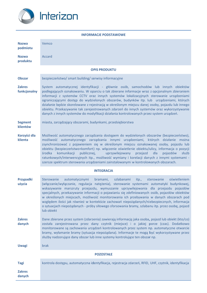 INFORM MACJE PODST TAWOWE Nazwa N podmiotu p Vemco Nazwa N produktu p Accard O PIS PRODUKT TU Obszar O bezpieczeeństwo/ smarrt building/ seerwisy inform macyjne Zakres Z funkcjonalny f System automatyczn a ej identyfikkacji ‐ głów wnie osób, samochodów w lub innyych obiektów w podlegająących oznakowaniu. W opparciu o tak zzbierane informacje wraz z opcjonalnyym zbieraniem m informacji z systemów CCTV oraaz innych syystemów lokalizacyjnych sterowanie urządzeniam mi ograniczającymi dostę ęp do wydzi elonych obszarów, budyynków itp. luub urządzen niami, którycch działanie będzie skore elowane z rejeestracją w okkreślonym miejscu danej osoby, pojazzdu lub inneggo obiektu. P Przekazywanie tak zarejesstrowanych zzdarzeń do in nnych system mów oraz wykorzystywaniie danych z innych system mów do moddyfikacji działaania kontrolo owanych przeez system urządzeń. Segment S klientów k miasta, zaarządzający o obszarami, buudynkami, przzedsiębiorstw wa Korzyści dla K klienta k Możliwość automatyccznego zarząddzania dostępem do wyd dzielonych obbszarów (bezzpieczeństwo o), możliwość automatyycznego zarrządzania in nnymi urząd dzeniami, kt których dzia ałanie możn na zsynchron nizować z po ojawieniem się w okreśślonym miejsscu oznakow wanej osoby,, pojazdu lu ub obiektu (bezpieczeństwo+komfort ) np. włączenie oświetlenie obiektu/uulicy, informacja o pozyccji środka komunikacji publiczneej, uprzywilejowany przejazd dla poja azdów służżb ratunkow wych/interwen ncyjnych itp.., możliwość wymiany i korelacji k dan ych z innymi systemami ‐ szersze sp pektrum stero owania urząddzeniami zain nstalowanymii w kontrolow wanych obsza arach. INTEGRACJA A Przypadki P użycia u Sterowanie automa atycznymi bramami, szlabanami itp., stterowanie oświetleniem m (włączaniee/wyłączanie e, regulacja natężenia), sterowanie systemami automatyki budynkoweej, wskazywaanie marszru uty przejazddu, wymuszanie uprzyw wilejowania dla przejazdu pojazdów w specjalnycch, przekazyw wanie inform macji o pojaw wianiu się zde efiniowanych osób, pojazd dów obiektów w w określo onych miejsccach, możliwoość monitoro owania ich przebywania p w danych obszarach o po od względem m ilości jak ró ównież w ko ntekście zach howań niepo ożądanych/ni ebezpiecznycch, informacjja o sytuacjaach niepożądanych ‐ prób y siłowego sfforsowania bramy, szlabannu itp. przez osobę, pojazzd lub obiektt Zakres Z danych d Dane zbieerane przez syystem (zdarzeenia) zawieraają informację ę jaka osoba,, pojazd lub o obiekt (kto/co o) została zarejestrowan z na przez daany czytnik (miejsce) i o jakiej pporze (czas). Dodatkow wo monitorow wane są zach howania urząądzeń kontro olowanych przez system nnp. automatyyczne otwarciie bramy, w wyłamanie bra amy (sytuacjaa niepożądan na). Informaccje te mogą bbyć wykorzysstywane przeez służby nad dzorujące dany obszar lubb inne system my kontrolujące ten obszarr np. Uwagi U brak POZOSTAŁEE Tagi T kontrola d dostępu, auto omatyczna iddentyfikacja, rrejestracja zd darzeń, RFID, UHF, czytnikk, identyfikacjja Zakres Z danych d