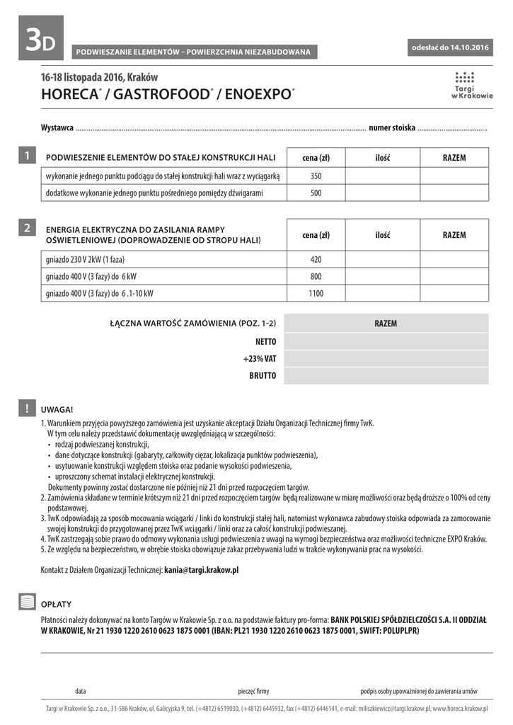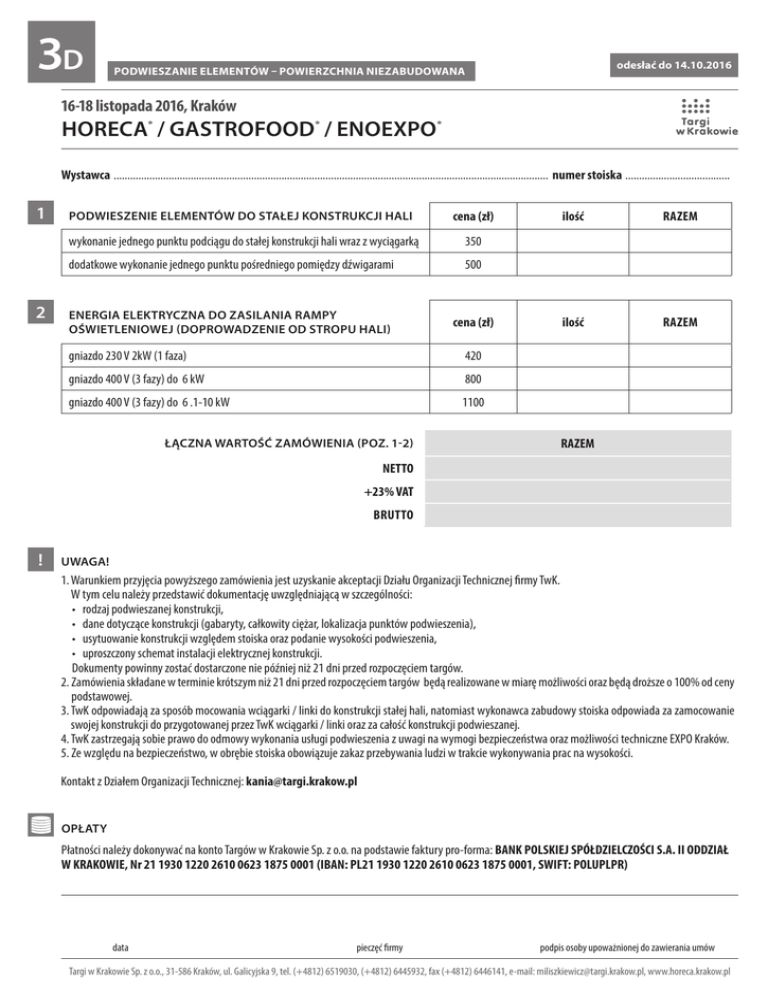 3D odesłać do 14.10.2016 PODWIESZANIE ELEMENTÓW – POWIERZCHNIA NIEZABUDOWANA 16-18 listopada 2016, Kraków HORECA® / GASTROFOOD® / ENOEXPO® Wystawca ............................................................................................................................................................... numer stoiska ....................................... 1 2 PODWIESZENIE ELEMENTÓW DO STAŁEJ KONSTRUKCJI HALI cena (zł) wykonanie jednego punktu podciągu do stałej konstrukcji hali wraz z wyciągarką 350 dodatkowe wykonanie jednego punktu pośredniego pomiędzy dźwigarami 500 ENERGIA ELEKTRYCZNA DO ZASILANIA RAMPY OŚWIETLENIOWEJ (DOPROWADZENIE OD STROPU HALI) cena (zł) gniazdo 230 V 2kW (1 faza) 420 gniazdo 400 V (3 fazy) do 6 kW 800 gniazdo 400 V (3 fazy) do 6 .1-10 kW 1100 ŁĄCZNA WARTOŚĆ ZAMÓWIENIA (POZ. 1-2) ilość RAZEM ilość RAZEM RAZEM NETTO +23% VAT BRUTTO ! UWAGA! 1. Warunkiem przyjęcia powyższego zamówienia jest uzyskanie akceptacji Działu Organizacji Technicznej firmy TwK. W tym celu należy przedstawić dokumentację uwzględniającą w szczególności: • rodzaj podwieszanej konstrukcji, • dane dotyczące konstrukcji (gabaryty, całkowity ciężar, lokalizacja punktów podwieszenia), • usytuowanie konstrukcji względem stoiska oraz podanie wysokości podwieszenia, • uproszczony schemat instalacji elektrycznej konstrukcji. Dokumenty powinny zostać dostarczone nie później niż 21 dni przed rozpoczęciem targów. 2. Zamówienia składane w terminie krótszym niż 21 dni przed rozpoczęciem targów będą realizowane w miarę możliwości oraz będą droższe o 100% od ceny podstawowej. 3. TwK odpowiadają za sposób mocowania wciągarki / linki do konstrukcji stałej hali, natomiast wykonawca zabudowy stoiska odpowiada za zamocowanie swojej konstrukcji do przygotowanej przez TwK wciągarki / linki oraz za całość konstrukcji podwieszanej. 4. TwK zastrzegają sobie prawo do odmowy wykonania usługi podwieszenia z uwagi na wymogi bezpieczeństwa oraz możliwości techniczne EXPO Kraków. 5. Ze względu na bezpieczeństwo, w obrębie stoiska obowiązuje zakaz przebywania ludzi w trakcie wykonywania prac na wysokości. Kontakt z Działem Organizacji Technicznej: [email protected] OPŁATY Płatności należy dokonywać na konto Targów w Krakowie Sp. z o.o. na podstawie faktury pro-forma: BANK POLSKIEJ SPÓŁDZIELCZOŚCI S.A. II ODDZIAŁ W KRAKOWIE, Nr 21 1930 1220 2610 0623 1875 0001 (IBAN: PL21 1930 1220 2610 0623 1875 0001, SWIFT: POLUPLPR) data pieczęć firmy podpis osoby upoważnionej do zawierania umów Targi w Krakowie Sp. z o.o., 31-586 Kraków, ul. Galicyjska 9, tel. (+4812) 6519030, (+4812) 6445932, fax (+4812) 6446141, e-mail: [email protected], www.horeca.krakow.pl