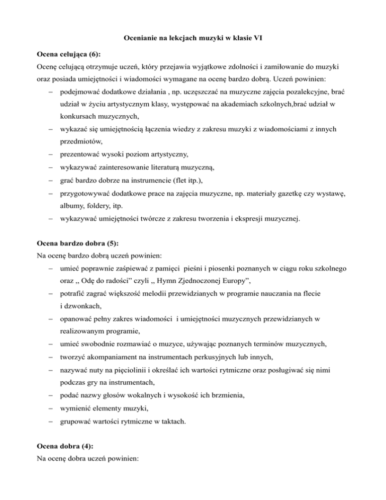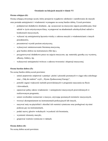 Ocenianie na lekcjach muzyki w klasie VI Ocena celująca (6): Ocenę celującą otrzymuje uczeń, który przejawia wyjątkowe zdolności i zamiłowanie do muzyki oraz posiada umiejętności i wiadomości wymagane na ocenę bardzo dobrą. Uczeń powinien: podejmować dodatkowe działania , np. uczęszczać na muzyczne zajęcia pozalekcyjne, brać udział w życiu artystycznym klasy, występować na akademiach szkolnych,brać udział w konkursach muzycznych, wykazać się umiejętnością łączenia wiedzy z zakresu muzyki z wiadomościami z innych przedmiotów, prezentować wysoki poziom artystyczny, wykazywać zainteresowanie literaturą muzyczną, grać bardzo dobrze na instrumencie (flet itp.), przygotowywać dodatkowe prace na zajęcia muzyczne, np. materiały gazetkę czy wystawę, albumy, foldery, itp. wykazywać umiejętności twórcze z zakresu tworzenia i ekspresji muzycznej. Ocena bardzo dobra (5): Na ocenę bardzo dobrą uczeń powinien: umieć poprawnie zaśpiewać z pamięci pieśni i piosenki poznanych w ciągu roku szkolnego oraz ,, Odę do radości” czyli ,, Hymn Zjednoczonej Europy”, potrafić zagrać większość melodii przewidzianych w programie nauczania na flecie i dzwonkach, opanować pełny zakres wiadomości i umiejętności muzycznych przewidzianych w realizowanym programie, umieć swobodnie rozmawiać o muzyce, używając poznanych terminów muzycznych, tworzyć akompaniament na instrumentach perkusyjnych lub innych, nazywać nuty na pięciolinii i określać ich wartości rytmiczne oraz posługiwać się nimi podczas gry na instrumentach, podać nazwy głosów wokalnych i wysokość ich brzmienia, wymienić elementy muzyki, grupować wartości rytmiczne w taktach. Ocena dobra (4): Na ocenę dobra uczeń powinien: poprawnie zaśpiewać pieśni i większość piosenki ujęte w programie nauczania, poprawnie zagrać kilka melodii na flecie i/lub dzwonkach, rozpoznać brzmienie większości poznanych instrumentów, umieć wyjaśnić znaczenie większości poznanych terminów muzycznych, opanować większość wiadomości i umiejętności przewidzianych w realizowanym programie, brać aktywny udział w lekcji, grupować proste wartości rytmiczne, odrabiać prace domowe. Ocena dostateczna (3): Ocenę dostateczną otrzymuje uczeń wówczas, gdy bierze udział w procesie lekcyjnym na miarę swoich możliwości oraz uczestniczy w wybranych formach działalności muzycznej, ponadto opanował określone umiejętności i wiadomości podstawowe, mianowicie: umie zaśpiewać piosenki o średnim stopniu trudności, uzupełnia podane takty odpowiednimi wartościami nut, wyjaśnia podstawowe terminy muzyczne, z pomocą nauczyciela zagra na flecie wybrane melodie, zna wartości nut, ich nazwy, posiada wiedzę niezbędną do rozumienia słuchanych form muzycznych, prowadzi zeszyt przedmiotowy. Ocena dopuszczająca (2): Ocenę dopuszczającą otrzymuje uczeń, który: opanował tylko ustalone umiejętności i wiadomości konieczne oraz niezbędne lub ewentualnie w ograniczonym zakresie podstawowe, wykazuje pozytywny stosunek do przedmiotu i potrafi wykonać z pomocą nauczyciela najprostsze zadania: podejmuje próby śpiewania lub recytuje tekst piosenki. prowadzi zeszyt przedmiotowy. Ocena niedostateczna (1): Ocenę niedostateczną otrzymuje uczeń, który: nie opanował wiadomości i umiejętności przewidzianych w realizowanym programie nauczania (co uniemożliwia dalsze kształcenie), nie jest w stanie wykonać prostych ćwiczeń nawet przy pomocy nauczyciela, nie potrafi grać na żadnym instrumencie, ma duże trudności z zaśpiewaniem jakiejkolwiek piosenki z repertuaru kl. VI, jest pasywny na lekcjach, nie uważa, nie odrabia prac domowych, nie prowadzi zeszytu przedmiotowego, nie wykazuje żadnych chęci nauczenia się czegokolwiek, nadrobienia braków, poprawienia ocen. Uwaga: Ocena niedostateczna nie wynika z braku możliwości czy braku uzdolnień ucznia. Należy ją traktować wyłącznie jako skutek całkowitej niechęci ucznia do przedmiotu i do pracy na lekcjach oraz braku zaangażowania. Końcowa ocena będzie wynikiem uzyskiwanych ocen oraz podsumowaniem aktywności ucznia na lekcjach. Ocenianie z przedmiotu muzyka w kl. VI 100%- celujący 99-91%- bardzo dobry 90-75%- dobry 74- 50%- dostateczny 49-30%- dopuszczający 29-0%- niedostateczny