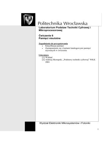 Laboratorium Podstaw Techniki Cyfrowej i Mikroprocesorowej Ćwiczenie 6 Pamięci nieulotne Zagadnienia do przygotowania • Klasyfikacja pamięci • Zaznajomienie się z kartami katalogowymi pamięci używanych w ćwiczeniu Literatura [1] Wykład [2] Andrzej Skorupski, „Podstawy techniki cyfrowej” WKiŁ 2001 Wydział Elektroniki Mikrosystemów i Fotoniki 1 1. Wstęp Tematem ćwiczenia jest zapis i odczyt informacji z nieulotnych pamięci z równoległą i szeregową transmisją danych. W ćwiczeniu używa się modułów z dwoma rodzajami pamięci: równoległą pamięcią typu FRAM firmy RAMTRON typ FM18L08-70 oraz szeregową pamięcią EEPROM firmy Microchip typ 93LC56B Ćwiczenie wymaga programu Makieta.exe w wersji 1.7 lub nowszej oraz makiety z wersją firmware 0.50 lub nowszej. 1.1. Pamięć równoległa FRAM Pamięć ta jest pamięcią nieulotną z równoległym interfejsem danych o organizacji 32k x 8bit. Na makiecie wyprowadzone są linie adresowe A0..A8 (pozostałe są zwarte do masy), linie sterujące ���� 𝐶𝐸 (Chip Enable – aktywacja układu), ���� 𝑂𝐸 (Output Enable – ����� (Write Enable – aktywacja zapisu) oraz wejścia / aktywacja wyjść danych) oraz 𝑊𝐸 wyjścia danych D0..D7. Oprócz tego na makiecie są dostępne piny ze stałą wartością 1 oraz 0. Cykl odczytu z pamięci przedstawiony jest na rysunku „Read Cycle Timing” na stronie 8 karty katalogowej. Odczyt wymaga podania adresu na wejścia adresowe oraz wpisania adresu za pomocą zmiany stanu ���� 𝐶𝐸 . Na wyjściach danych (pod warunkiem ich aktywacji) pojawia się informacja zapisana w komórce pamięci pod adresem podanym na wejścia adresowe. Zapis odbywa się dwutaktowo (rysunki „Write Cycle Timing”). Najpierw w trakcie opadającego zbocza na wejściu ���� 𝐶𝐸 pamięć zatrzaskuje adres podany wcześniej na wejścia adresowe, po czym w trakcie narastającego zbocza na wejściu ����� 𝑊𝐸 następuje zapis pod ten adres danej podanej wcześniej na wejście danych. Oba te sygnały sterujące mogą zmieniać się jednocześnie. 1.2. Pamięć szeregowa FLASH Pamieć szeregowa FLASH obsługiwana jest prostym interfejsem szeregowym. Posiada on sygnał CS aktywujący pamięć, sygnał taktujący CLK, wejście danych DI oraz wyjście danych DO. Cykle zapisu i odczytu opisane są w dokumentacji. W trakcie ćwiczenia będzie jedynie odczytywana informacja z pamięci. Mamy do czynienia z układem o organizacji 128x16 bitów zatem jest to tabela 1-3 oraz wykres 2-7. Odczyt polega na wygenerowaniu szeregowo podawanej na wejście sekwencji bitów 1 1 0 x A6 A5 A4 A3 A2 A1 A0 i utrzymaniu sygnału zegarowego aż zostanie odczytane 16 bitów. 2. Realizacja ćwiczenia Program ćwiczenia obejmuje: • • • odczyt informacji z pamięci równoległej FRAM spod adresu podanego przez prowadzącego zapis informacji do pamięci równoległej FRAM pod adres wskazany przez prowadzącego i jej odczyt w celu weryfikacji prawidłowości zapisu odczyt informacji z pamięci szeregowej FLASH spod adresu wskazanego przez prowadzącego 2 2.1. Punktacja Czynność Nr Pkt. Sprawozdanie 1 Odczyt informacji z pamięci FRAM 2 tak 2 Zapis i weryfikacja zapisu w pamięci FRAM 4 tak 3 Odczyt informacji z pamięci FLASH 4 tak Skala ocen Suma punktów 10-9 8 7-6 5 4 Ocena 5 4,5 4 3,5 3 3