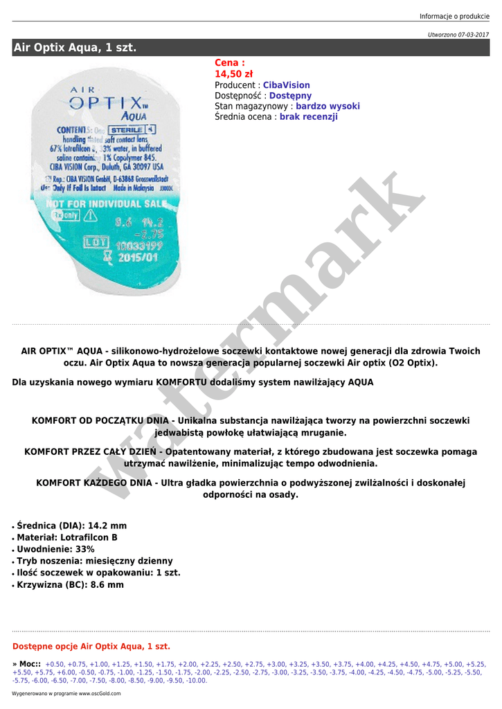 Informacje o produkcie Utworzono 07-03-2017 Air Optix Aqua, 1 szt. Cena : 14,50 zł er m ar k Producent : CibaVision Dostępność : Dostępny Stan magazynowy : bardzo wysoki Średnia ocena : brak recenzji AIR OPTIX™ AQUA - silikonowo-hydrożelowe soczewki kontaktowe nowej generacji dla zdrowia Twoich oczu. Air Optix Aqua to nowsza generacja popularnej soczewki Air optix (O2 Optix). at Dla uzyskania nowego wymiaru KOMFORTU dodaliśmy system nawilżający AQUA KOMFORT OD POCZĄTKU DNIA - Unikalna substancja nawilżająca tworzy na powierzchni soczewki jedwabistą powłokę ułatwiającą mruganie. w KOMFORT PRZEZ CAŁY DZIEŃ - Opatentowany materiał, z którego zbudowana jest soczewka pomaga utrzymać nawilżenie, minimalizując tempo odwodnienia. KOMFORT KAŻDEGO DNIA - Ultra gładka powierzchnia o podwyższonej zwilżalności i doskonałej odporności na osady. ● ● ● ● ● ● Średnica (DIA): 14.2 mm Materiał: Lotrafilcon B Uwodnienie: 33% Tryb noszenia: miesięczny dzienny Ilość soczewek w opakowaniu: 1 szt. Krzywizna (BC): 8.6 mm Dostępne opcje Air Optix Aqua, 1 szt. » Moc:: +0.50, +0.75, +1.00, +1.25, +1.50, +1.75, +2.00, +2.25, +2.50, +2.75, +3.00, +3.25, +3.50, +3.75, +4.00, +4.25, +4.50, +4.75, +5.00, +5.25, +5.50, +5.75, +6.00, -0.50, -0.75, -1.00, -1.25, -1.50, -1.75, -2.00, -2.25, -2.50, -2.75, -3.00, -3.25, -3.50, -3.75, -4.00, -4.25, -4.50, -4.75, -5.00, -5.25, -5.50, -5.75, -6.00, -6.50, -7.00, -7.50, -8.00, -8.50, -9.00, -9.50, -10.00. Wygenerowano w programie www.oscGold.com