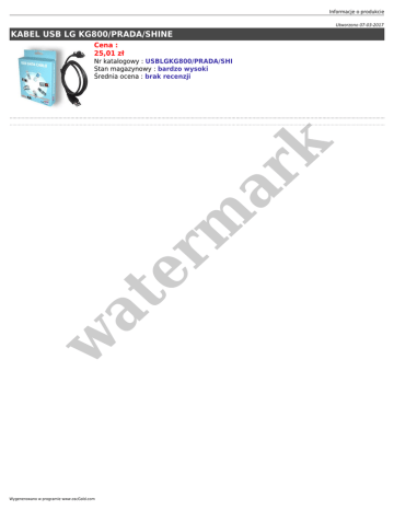 Informacje o produkcie Utworzono 07-03-2017 KABEL USB LG KG800/PRADA/SHINE Cena : 25,01 zł w at er m ar k Nr katalogowy : USBLGKG800/PRADA/SHI Stan magazynowy : bardzo wysoki Średnia ocena : brak recenzji Wygenerowano w programie www.oscGold.com