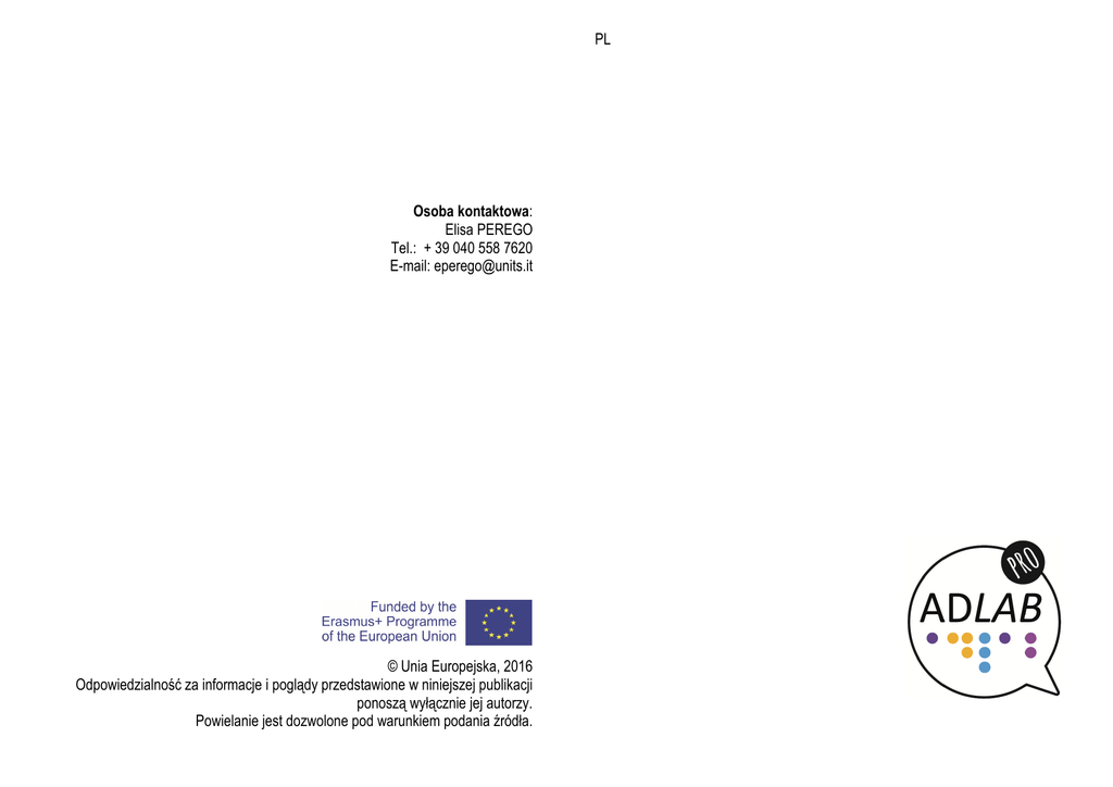 PL Osoba kontaktowa: Elisa PEREGO Tel.: + 39 040 558 7620 E-mail: [email protected] © Unia Europejska, 2016 Odpowiedzialność za informacje i poglądy przedstawione w niniejszej publikacji ponoszą wyłącznie jej autorzy. Powielanie jest dozwolone pod warunkiem podania źródła. Audiodeskrypcja: Laboratorium Rozwoju Nowego Profilu Zawodowego indywidualnych potrzeb: możliwe będzie wykorzystanie wszystkich modułów razem w formie gotowego kursu lub oddzielnie w różnych konfiguracjach. ADLAB PRO to trzyletni (2016-2019) projekt finansowany przez Unię Europejską w ramach programu Erasmus +, Akcje Kluczowe 2 –Partnerstwa Strategiczne. Działania projektowe prowadzone będą przez partnerów działających w obszarze edukacji oraz poza nim tak, aby stworzony profil zawodowy spełniał liczne wymogi rynkowe, a opracowany program szkolenia przyszłych audiodeskryptorów był skuteczny, elastyczny oraz wysokiej jakości. W projekcie udział bierze ośmiu partnerów z siedmiu krajów europejskich. Partnerzy akademiccy to Uniwersytet w Trieście (Włochy), który jest jednocześnie koordynatorem projektu, Universitat Autònoma de Barcelona (Hiszpania), Universiteit Antwerpen (Belgia) oraz Uniwersytet im. Adama Mickiewicza w Poznaniu (Polska). Wszystkie te instytucje brały także udział w projekcie ADLAB (2011-2014). Ponadto w projekcie jest czterech partnerów pozaakademickich, wybranych ze względu na ich różnorodne doświadczenie. Utopian Voices to brytyjska spółka zajmująca się opracowywaniem wysokiej jakości AD, a także szkoleniem, badaniami i analizą danych w dziedzinie tłumaczeń audiowizualnych. Soundfocus to studio zajmujące się postprodukcją dźwięku, specjalizujące się w dostępności mediów oraz AD w Holandii. RTV Slovenija – ogólnokrajowa publiczna stacja radiowotelewizyjna, która od niedawna wprowadziła AD do swoich programów i pracuje nad jej wdrażaniem oraz upowszechnianiem dobrych praktyk także w innych krajach bałkańskich. Royal National Institute for the Blind – znana brytyjska organizacja pożytku publicznego działająca na rzecz osób niewidomych, której zadaniem będzie rozpowszechnianie informacji o projekcie w kraju o długiej tradycji w dziedzinie AD. Pomimo ciągłych głosów domagających się społeczeństwa zapewniającego równe traktowanie wszystkich obywateli oraz mimo rosnącego zapotrzebowania na produkty audiowizualne dostępne dla osób z dysfunkcjami sensorycznymi, nadal niewiele osób zajmuje się zawodowo audiodeskrypcją (AD). Do tej pory zawód audiodeskryptora nie został właściwie zdefiniowany, a większość osób go wykonujących nie przeszła odpowiedniego przeszkolenia. Ponadto dostępność AD – tj. werbalnego opisu elementów wizualnych produktu audiowizualnego na potrzeby niewidomych i słabowidzących – jest różna w poszczególnych krajach Europejskich. ADLAB PRO ma na celu zniwelowanie tych różnic poprzez opracowanie programu nauczania zapewniającego wdrożenie profesjonalnej AD we wszystkich sektorach kultury i środkach masowego przekazu. Tak rozumiany program nauczania będzie miał formę materiałów dydaktycznych, a jego celem będzie stworzenie nowego profilu zawodowego audiodeskryptora. W ramach projektu ADLAB PRO opisane zostaną obecne działania szkoleniowe w zakresie AD w Europie, a także nakreślony zostanie profil zawodowy audiodeskryptora, wraz z wymaganymi umiejętnościami i kompetencjami. Następnie opracowane zostaną konkretne propozycje szkoleniowe w oparciu o różne typy AD (telewizja, kino, muzea, wydarzenia na żywo). Na kolejnych etapach stworzone zostaną materiały dydaktyczne, które zostaną udostępnione po szczegółowej ocenie i przetestowaniu. Częścią projektu będzie także ocena komponentów edukacyjnych zarówno dla ścieżek akademickich jak i zawodowych poprzez przypisanie im punktów ECTS/ECVETS. Materiały dydaktyczne opracowane w ramach ADLAB PRO będą dostępne bezpłatnie na stronie projektu. Co więcej, będą one miały formę modułową i będzie można dostosować je do ADLAB PRO będzie miał nie tylko bezpośredni wpływ na szkolnictwo wyższe oraz osoby zainteresowane szkoleniem z zakresu AD oraz rynkiem tłumaczeń audiowizualnych, lecz także – w perspektywie długofalowej – na osoby, które będą korzystać z opisów przygotowanych przez nowych audiodeskryptorów. Do takich beneficjentów zaliczyć można osoby z dysfunkcją wzroku, niepełnosprawne ze względu na wiek oraz o specjalnych potrzebach. Więcej informacji o projekcie dostępnych jest na stronie: www.adlabproject.eu.
