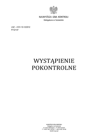 LSZ – 4101-10-12/2012 P/12/137 WYSTĄPIENIE POKONTROLNE 2 I. Dane identyfikacyjne kontroli Numer i tytuł kontroli Jednostka przeprowadzająca kontrolę Kontroler P/12/137 – Realizacja przepisów ustawy o ochronie zdrowia przed następstwami uŜywania tytoniu i wyrobów tytoniowych NajwyŜsza Izba Kontroli Delegatura w Szczecinie Robert Lewandowski, specjalista kontroli państwowej, upowaŜnienie do kontroli nr 82831 z dnia 19 września 2012 r. (dowód: akta kontroli str. 1-2) Jednostka kontrolowana Kierownik jednostki kontrolowanej Urząd Marszałkowski Województwa Zachodniopomorskiego w Szczecinie, 70-540 Szczecin, ul. Korsarzy 34 (dalej „Urząd”) Olgierd Geblewicz, Marszałek Województwa Zachodniopomorskiego (dowód: akta kontroli str. 3-4) II. Ocena kontrolowanej działalności Ocena ogólna Uzasadnienie oceny ogólnej NajwyŜsza Izba Kontroli ocenia pozytywnie1 działalność Urzędu w zakresie realizacji przepisów ustawy z dnia 9 listopada 1995 r. o ochronie zdrowia przed następstwami uŜywania tytoniu i wyrobów tytoniowych2 (dalej „ustawa antynikotynowa”). W działalności kontrolowanej jednostki w przedstawionym wyŜej zakresie nie stwierdzono nieprawidłowości. III. Opis ustalonego stanu faktycznego 1. Opis stanu faktycznego Oznakowanie obiektów i środków transportu Stosownie do dyspozycji art. 5 ust. 1a ustawy antynikotynowej, w poddanym oględzinom budynku siedziby Urzędu przy ul. Korsarzy 34 (Zamek KsiąŜąt Pomorskich), budynku administracyjnego przy ul. Piłsudskiego 40-42 w Szczecinie3 oraz w losowo wybranych środkach transportu – samochodzie osobowym marki Peugeot o nr rej. ZS 00992 i marki Mercedes Vito (bus) o nr rej. ZS 7418G umieszczono oznaczenia słowne i graficzne informujące o zakazie palenia. Oznaczenia te były widoczne dla osób wchodzących na teren ww. obiektów i do ww. środków transportu oraz znajdowały się przy wszystkich wejściach. (dowód: akta kontroli str. 5-6, 11) Ustalone nieprawidłowości W działalności kontrolowanej jednostki w przedstawionym wyŜej zakresie nie stwierdzono nieprawidłowości. NajwyŜsza Izba Kontroli stosuje 3-stopniową skalę ocen: pozytywna, pozytywna mimo stwierdzonych nieprawidłowości, negatywna. JeŜeli sformułowanie oceny ogólnej według proponowanej skali byłoby nadmiernie utrudnione, albo taka ocena nie dawałaby prawdziwego obrazu funkcjonowania kontrolowanej jednostki w zakresie objętym kontrolą, stosuje się ocenę opisową, bądź uzupełnia ocenę ogólną o dodatkowe objaśnienie 2 Dz. U. z 1996 r. Nr 10, poz. 55 ze zm. 3 Oględzinami objęto powierzchnie biurowe własne Urzędu o łącznej powierzchni 4.604,2 m2, stanowiące 29,3 % powierzchni biurowych Urzędu ogółem (wynajmowanych i własnych) oraz 58,9 % powierzchni biurowych własnych Urzędu. 1 3 2. Opis stanu faktycznego Ustalone nieprawidłowości Na terenie obiektów Urzędu nie zostały wyznaczone palarnie wyrobów tytoniowych. (dowód: akta kontroli str. 6) W działalności kontrolowanej jednostki w przedstawionym wyŜej zakresie nie stwierdzono nieprawidłowości. 3. Opis stanu faktycznego Wyznaczenie palarni na terenie wybranych obiektów Urzędu Przestrzeganie zakazu palenia na terenie wybranych obiektów Urzędu Przeprowadzone w dniu 20 września 2012 r. oględziny budynków przy ul. Korsarzy 34 i przy ul. Piłsudskiego 40-42 oraz pomieszczeń znajdujących się w nich4 wykazały, Ŝe przestrzegano zakazu palenia. (dowód: akta kontroli str. 6) Ustalone nieprawidłowości W działalności kontrolowanej jednostki w przedstawionym wyŜej zakresie nie stwierdzono nieprawidłowości. 4. Opis stanu faktycznego Obowiązki wynikające z ustawy antynikotynowej w świetle regulaminów obowiązujących w Urzędzie Zgodnie z treścią § 32 Regulaminu Pracy w Urzędzie5, w trosce o ochronę zdrowia pracowników, we wszystkich budynkach i pomieszczeniach Urzędu, zabroniono palenia tytoniu, szczególnie na stanowiskach pracy. (dowód: akta kontroli str. 9-10) Ustalone nieprawidłowości W działalności kontrolowanej jednostki w przedstawionym wyŜej zakresie nie stwierdzono nieprawidłowości. 5. Opis stanu faktycznego Skargi i wnioski dotyczące realizacji przepisów ustawy antynikotynowej W okresie objętym kontrolą do Urzędu nie wpłynęły skargi i wnioski dotyczące realizacji przepisów ustawy antynikotynowej lub kwestii z nią związanych. (dowód: akta kontroli str. 7) Ustalone nieprawidłowości W działalności kontrolowanej jednostki w przedstawionym wyŜej zakresie nie stwierdzono nieprawidłowości. 6. Opis stanu faktycznego Problemy w realizacji ustawy antynikotynowej W złoŜonych wyjaśnieniach Marszałek Województwa Zachodniopomorskiego stwierdził, Ŝe w Urzędzie nie zgłaszano problemów związanych z realizacją ustawy antynikotynowej i nie istnieje potrzeba wprowadzenia nowych rozwiązań prawnych i organizacyjnych. (dowód: akta kontroli str. 8, 12) Ustalone nieprawidłowości W działalności kontrolowanej jednostki w przedstawionym wyŜej zakresie nie stwierdzono nieprawidłowości. 7. Opis stanu faktycznego Kontrole przestrzegania przepisów ustawy antynikotynowej W okresie objętym kontrolą Urząd nie był kontrolowany w zakresie przestrzegania przepisów ustawy antynikotynowej przez inne organy kontroli, rewizji i inspekcji. Oględzinami objęto powierzchnie biurowe własne Urzędu o łącznej powierzchni 4.604,2 m2, stanowiące 29,3 % powierzchni biurowych Urzędu ogółem (wynajmowanych i własnych) oraz 58,9 % powierzchni biurowych własnych Urzędu. Oględzinom nie poddano powierzchni biurowych wynajmowanych usytuowanych przy pl. Hołdu Pruskiego 8, ul. Wyszyńskiego, ul. Starzyńskiego 1 i 3-4 w Szczecinie oraz własnych przy ul. Kuśnierskiej 12b, ul. Mickiewicza 41 w Szczecinie, ul. Monte Cassino 2 w Koszalinie. 5 wprowadzonego zarządzeniem nr 68a/2006 Marszałka Województwa Zachodniopomorskiego z dnia 17 lipca 2006 r. 4 4 (dowód: akta kontroli str. 7) Ustalone nieprawidłowoś