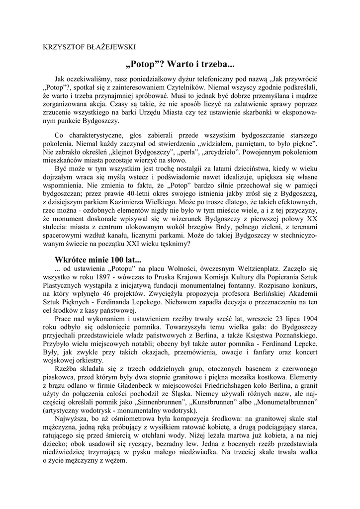 KRZYSZTOF BŁAśEJEWSKI „Potop”? Warto i trzeba... Jak oczekiwaliśmy, nasz poniedziałkowy dyŜur telefoniczny pod nazwą „Jak przywrócić „Potop”?, spotkał się z zainteresowaniem Czytelników. Niemal wszyscy zgodnie podkreślali, Ŝe warto i trzeba przynajmniej spróbować. Musi to jednak być dobrze przemyślana i mądrze zorganizowana akcja. Czasy są takie, Ŝe nie sposób liczyć na załatwienie sprawy poprzez zrzucenie wszystkiego na barki Urzędu Miasta czy teŜ ustawienie skarbonki w eksponowanym punkcie Bydgoszczy. Co charakterystyczne, głos zabierali przede wszystkim bydgoszczanie starszego pokolenia. Niemal kaŜdy zaczynał od stwierdzenia „widziałem, pamiętam, to było piękne”. Nie zabrakło określeń „klejnot Bydgoszczy”, „perła”, „arcydzieło”. Powojennym pokoleniom mieszkańców miasta pozostaje wierzyć na słowo. Być moŜe w tym wszystkim jest trochę nostalgii za latami dzieciństwa, kiedy w wieku dojrzałym wraca się myślą wstecz i podświadomie nawet idealizuje, upiększa się własne wspomnienia. Nie zmienia to faktu, Ŝe „Potop” bardzo silnie przechował się w pamięci bydgoszczan; przez prawie 40-letni okres swojego istnienia jakby zrósł się z Bydgoszczą, z dzisiejszym parkiem Kazimierza Wielkiego. MoŜe po trosze dlatego, Ŝe takich efektownych, rzec moŜna - ozdobnych elementów nigdy nie było w tym mieście wiele, a i z tej przyczyny, Ŝe monument doskonale wpisywał się w wizerunek Bydgoszczy z pierwszej połowy XX stulecia: miasta z centrum ulokowanym wokół brzegów Brdy, pełnego zieleni, z terenami spacerowymi wzdłuŜ kanału, licznymi parkami. MoŜe do takiej Bydgoszczy w stechnicyzowanym świecie na początku XXI wieku tęsknimy? Wkrótce minie 100 lat... ... od ustawienia „Potopu” na placu Wolności, ówczesnym Weltzienplatz. Zaczęło się wszystko w roku 1897 - wówczas to Pruska Krajowa Komisja Kultury dla Popierania Sztuk Plastycznych wystąpiła z inicjatywą fundacji monumentalnej fontanny. Rozpisano konkurs, na który wpłynęło 46 projektów. ZwycięŜyła propozycja profesora Berlińskiej Akademii Sztuk Pięknych - Ferdinanda Lepckego. Niebawem zapadła decyzja o przeznaczeniu na ten cel środków z kasy państwowej. Prace nad wykonaniem i ustawieniem rzeźby trwały sześć lat, wreszcie 23 lipca 1904 roku odbyło się odsłonięcie pomnika. Towarzyszyła temu wielka gala: do Bydgoszczy przyjechali przedstawiciele władz państwowych z Berlina, a takŜe Księstwa Poznańskiego. Przybyło wielu miejscowych notabli; obecny był takŜe autor pomnika - Ferdinand Lepcke. Były, jak zwykle przy takich okazjach, przemówienia, owacje i fanfary oraz koncert wojskowej orkiestry. Rzeźba składała się z trzech oddzielnych grup, otoczonych basenem z czerwonego piaskowca, przed którym były dwa stopnie granitowe i piękna mozaika kostkowa. Elementy z brązu odlano w firmie Gladenbeck w miejscowości Friedrichshagen koło Berlina, a granit uŜyty do połączenia całości pochodził ze Śląska. Niemcy uŜywali róŜnych nazw, ale najczęściej określali pomnik jako „Sinnenbrunnen”, „Kunstbrunnen” albo „Monumetalbrunnen” (artystyczny wodotrysk - monumentalny wodotrysk). NajwyŜsza, bo aŜ ośmiometrowa była kompozycja środkowa: na granitowej skale stał męŜczyzna, jedną ręką próbujący z wysiłkiem ratować kobietę, a drugą podciągający starca, ratującego się przed śmiercią w otchłani wody. NiŜej leŜała martwa juŜ kobieta, a na niej dziecko; obok usadowił się ryczący, bezradny lew. Jedna z bocznych rzeźb przedstawiała niedźwiedzicę trzymającą w pysku małego niedźwiadka. Na trzeciej skale trwała walka o Ŝycie męŜczyzny z węŜem. W cztery lata później „Potop”, zapewne dla lepszego urealistycznienia przedstawianej wizji, stał się fontanną. Wtedy teŜ całość została podświetlona. Tworzyło to szczególną scenerię, zwłaszcza w ciepłe wieczory. Bydgoszczanie rzeźbę zaakceptowali bez reszty. W dwudziestoleciu międzywojennym monument był ulubionym miejscem spotkań: przed nim kończyły się róŜnego rodzaju zawody sportowe, zjazdy i uroczystości, których uczestnicy pozowali do zdjęcia na tle fontanny. Ferdinand Lepcke pochodził z północnobawarskiej miejscowości Coburg, słynącej z zamków ksiąŜąt dynastii sasko-koburskie i pobytu Marcina Lutra. Swemu rodzinnemu miastu artysta podarował kopię głównej grupy „Potopu”, a jedna z bocznych części znalazła się w miejscowości Detloff. Kopię całości ustawiono takŜe w miejscowości Eisleben w Saksonii. Bydgoski „Potop” przetrwał dokładnie 38 i pół roku. Pod koniec 1942 r., gdy niemiecka machina wojenna coraz dotkliwiej odczuwała kryzys surowcowy, zapadła decyzja o przetopieniu rzeźby „na cele wojenne”. Rozbiórkę rozpoczęto 7 stycznia 1943 roku, prace przy jej niszczeniu trwały sześć dni. Pozostał tylko basen. Uzyskano 8870 kilogramów brązu, a granit wywieziono do składnicy miejskiej przy ulicy Karpackiej. Trzydzieści euro za godzinę... Idea odbudowy monumentalnej rzeźby-fontanny, wyraŜana tak często przez Czytelników „Expressu” podczas naszego milenijnego plebiscytu „Bydgoszczy co bydgoskie”, nie jest pomysłem nowym. Z pewnością wielu mieszkańców miasta myślało o tym przez wszystkie powojenne lata. Długo nie było jednak po temu sprzyjającego klimatu. Obowiązywało widzenie „Potopu” jako obcego, niemieckiego, a tym samym wrogiego elementu, w dodatku pozbawionego dobrego smaku artystycznego. Marian Turwid np. tak pisał o rzeźbie-fontannie: „Obsypana łaskami Bydgoszcz miała być i architekturą swą, i atmosferą przeciwstawiona upartej polskości Poznania. Nie pomogły szkoły jak koszary - i koszary jak więzienia. Ani nawet pompatyczne i banalne pomniczyska z obfitej kolekcji pruskich Edel-kitschów, z największym z nich „Potopem” na czele, w którym to monumencie dał prof. Lepcke z Berlina imponują