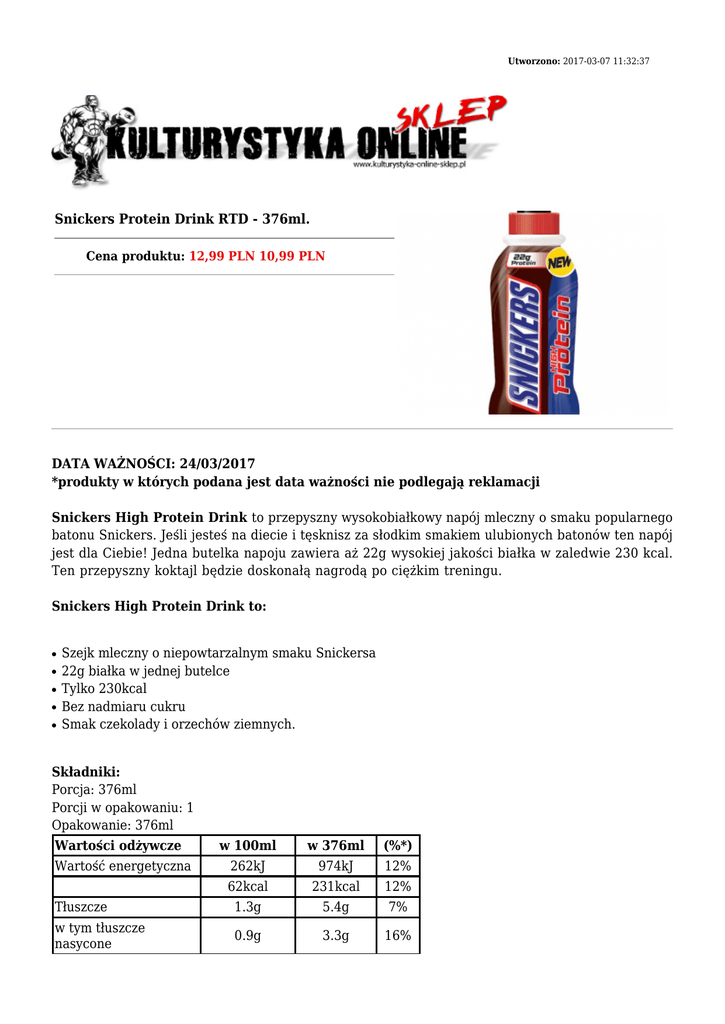 Utworzono: 2017-03-07 11:32:37 Snickers Protein Drink RTD - 376ml. Cena produktu: 12,99 PLN 10,99 PLN DATA WAŻNOŚCI: 24/03/2017 *produkty w których podana jest data ważności nie podlegają reklamacji Snickers High Protein Drink to przepyszny wysokobiałkowy napój mleczny o smaku popularnego batonu Snickers. Jeśli jesteś na diecie i tęsknisz za słodkim smakiem ulubionych batonów ten napój jest dla Ciebie! Jedna butelka napoju zawiera aż 22g wysokiej jakości białka w zaledwie 230 kcal. Ten przepyszny koktajl będzie doskonałą nagrodą po ciężkim treningu. Snickers High Protein Drink to: ● ● ● ● ● Szejk mleczny o niepowtarzalnym smaku Snickersa 22g białka w jednej butelce Tylko 230kcal Bez nadmiaru cukru Smak czekolady i orzechów ziemnych. Składniki: Porcja: 376ml Porcji w opakowaniu: 1 Opakowanie: 376ml Wartości odżywcze w 100ml w 376ml (%*) 262kJ 974kJ 12% 62kcal 231kcal 12% Tłuszcze 1.3g 5.4g 7% w tym tłuszcze nasycone 0.9g 3.3g 16% Wartość energetyczna Węglowodany 6.5g 22.8g 9% w tym cukry 6.5g 22.7g 27% Białko 5.9g 22g 4% Sól 0.3g 1.46g 20% *Referencyjna wartość spożycia dla przeciętnej osoby dorosłej (8400kJ/2000kcal) Suplementy diety nie mogą być stosowane jako substytut zróżnicowanej diety. Pamiętaj, że tylko zdrowy tryb życia i zrównoważony sposób odżywiania zapewniają prawidłowe funkcjonowanie organizmu i zachowanie dobrej kondycji. Dawkowanie w dzień treningowy: Stosować według uznania jako uzupełnienie białka w diecie. Dawkowanie w dzień nietreningowy: Stosować według uznania jako deser lub przekąskę. Nie przekraczać zalecanej porcji do spożycia w ciągu dnia. Produkt nie może być stosowany przez osoby uczulone na którykolwiek z jego składników. Przechowywać w miejscu niedostępnym dla małych dzieci. Przechowywać w miejscu suchym w temperaturze pokojowej w szczelnie zamkniętych opakowaniach. Adres: http://www.ko.sklep.pl/ Telefon: kom. 782 010 880 Email: [email protected]