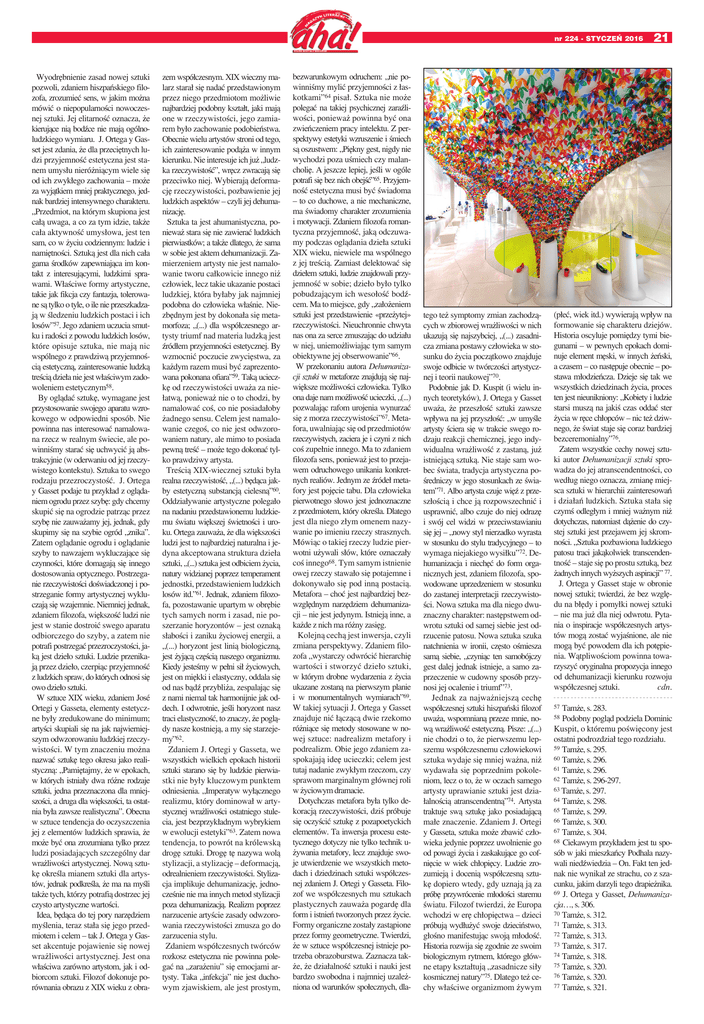 nr 224 - STYCZEŃ 2016 Wyodrębnienie zasad nowej sztuki pozwoli, zdaniem hiszpańskiego filozofa, zrozumieć sens, w jakim można mówić o niepopularności nowoczesnej sztuki. Jej elitarność oznacza, że kierujące nią bodźce nie mają ogólnoludzkiego wymiaru. J. Ortega y Gasset jest zdania, że dla przeciętnych ludzi przyjemność estetyczna jest stanem umysłu nieróżniącym wiele się od ich zwykłego zachowania – może za wyjątkiem mniej praktycznego, jednak bardziej intensywnego charakteru. „Przedmiot, na którym skupiona jest całą uwaga, a co za tym idzie, także cała aktywność umysłowa, jest ten sam, co w życiu codziennym: ludzie i namiętności. Sztuką jest dla nich cała gama środków zapewniająca im kontakt z interesującymi, ludzkimi sprawami. Właściwe formy artystyczne, takie jak fikcja czy fantazja, tolerowane są tylko o tyle, o ile nie przeszkadzają w śledzeniu ludzkich postaci i ich losów”57. Jego zdaniem uczucia smutku i radości z powodu ludzkich losów, które opisuje sztuka, nie mają nic wspólnego z prawdziwą przyjemnością estetyczną, zainteresowanie ludzką treścią dzieła nie jest właściwym zadowoleniem estetycznym58. By oglądać sztukę, wymagane jest przystosowanie swojego aparatu wzrokowego w odpowiedni sposób. Nie powinna nas interesować namalowana rzecz w realnym świecie, ale powinniśmy starać się uchwycić ją abstrakcyjnie (w oderwaniu od jej rzeczywistego kontekstu). Sztuka to swego rodzaju przezroczystość. J. Ortega y Gasset podaje tu przykład z oglądaniem ogrodu przez szybę: gdy chcemy skupić się na ogrodzie patrząc przez szybę nie zauważamy jej, jednak, gdy skupimy się na szybie ogród „znika”. Zatem oglądanie ogrodu i oglądanie szyby to nawzajem wykluczające się czynności, które domagają się innego dostosowania optycznego. Postrzeganie rzeczywistości doświadczonej i postrzeganie formy artystycznej wykluczają się wzajemnie. Niemniej jednak, zdaniem filozofa, większość ludzi nie jest w stanie dostroić swego aparatu odbiorczego do szyby, a zatem nie potrafi postrzegać przezroczystości, jaką jest dzieło sztuki. Ludzie przenikają przez dzieło, czerpiąc przyjemność z ludzkich spraw, do których odnosi się owo dzieło sztuki. W sztuce XIX wieku, zdaniem José Ortegi y Gasseta, elementy estetyczne były zredukowane do minimum; artyści skupiali się na jak najwierniejszym odwzorowaniu ludzkiej rzeczywistości. W tym znaczeniu można nazwać sztukę tego okresu jako realistyczną: „Pamiętajmy, że w epokach, w których istniały dwa różne rodzaje sztuki, jedna przeznaczona dla mniejszości, a druga dla większości, ta ostatnia była zawsze realistyczna”. Obecna w sztuce tendencja do oczyszczenia jej z elementów ludzkich sprawia, że może być ona zrozumiana tylko przez ludzi posiadających szczególny dar wrażliwości artystycznej. Nową sztukę określa mianem sztuki dla artystów, jednak podkreśla, że ma na myśli także tych, którzy potrafią dostrzec jej czysto artystyczne wartości. Idea, będąca do tej pory narzędziem myślenia, teraz stała się jego przedmiotem i celem – tak J. Ortega y Gasset akcentuje pojawienie się nowej wrażliwości artystycznej. Jest ona właściwa zarówno artystom, jak i odbiorcom sztuki. Filozof dokonuje porównania obrazu z XIX wieku z obra- zem współczesnym. XIX wieczny malarz starał się nadać przedstawionym przez niego przedmiotom możliwie najbardziej podobny kształt, jaki mają one w rzeczywistości, jego zamiarem było zachowanie podobieństwa. Obecnie wielu artystów stroni od tego, ich zainteresowanie podąża w innym kierunku. Nie interesuje ich już „ludzka rzeczywistość”, wręcz zwracają się przeciwko niej. Wybierają deformację rzeczywistości, pozbawienie jej ludzkich aspektów – czyli jej dehumanizację. Sztuka ta jest ahumanistyczna, ponieważ stara się nie zawierać ludzkich pierwiastków; a także dlatego, że sama w sobie jest aktem dehumanizacji. Zamierzeniem artysty nie jest namalowanie tworu całkowicie innego niż człowiek, lecz takie ukazanie postaci ludzkiej, która byłaby jak najmniej podobna do człowieka właśnie. Niezbędnym jest by dokonała się metamorfoza; „(...) dla współczesnego artysty triumf nad materia ludzką jest źródłem przyjemności estetycznej. By wzmocnić poczucie zwycięstwa, za każdym razem musi być zaprezentowana pokonana ofiara”59. Taką ucieczkę od rzeczywistości uważa za niełatwą, ponieważ nie o to chodzi, by namalować coś, co nie posiadałoby żadnego sensu. Celem jest namalowanie czegoś, co nie jest odwzorowaniem natury, ale mimo to posiada pewną treść – może tego dokonać tylko prawdziwy artysta. Treścią XIX-wiecznej sztuki była realna rzeczywistość, „(...) będąca jakby estetyczną substancją cielesną”60. Oddziaływanie artystyczne polegało na nadaniu przedstawionemu ludzkiemu światu większej świetności i uroku. Ortega zauważa, że dla większości ludzi jest to najbardziej naturalna i jedyna akceptowana struktura dzieła sztuki, „(...) sztuka jest odbiciem życia, natury widzianej poprzez temperament jednostki, przedstawieniem ludzkich losów itd.”61. Jednak, zdaniem filozofa, pozostawanie upartym w obrębie tych samych norm i zasad, nie poszerzanie horyzontów – jest oznaką słabości i zaniku życiowej energii, a „(...) horyzont jest linią biologiczną, jest żyjącą częścią naszego organizmu. Kiedy jesteśmy w pełni sił życiowych, jest on miękki i elastyczny, oddala się od nas bądź przybliża, zespalając się z nami niemal tak harmonijnie jak oddech. I odwrotnie, jeśli horyzont nasz traci elastyczność, to znaczy, że poglądy nasze kostnieją, a my się starzejemy”62. Zdaniem J. Ortegi y Gasseta, we wszystkich wielkich epokach historii sztuki starano się by ludzkie pierwiastki nie były kluczowym punktem odniesienia. „Imperatyw wyłącznego realizmu, który dominował w art