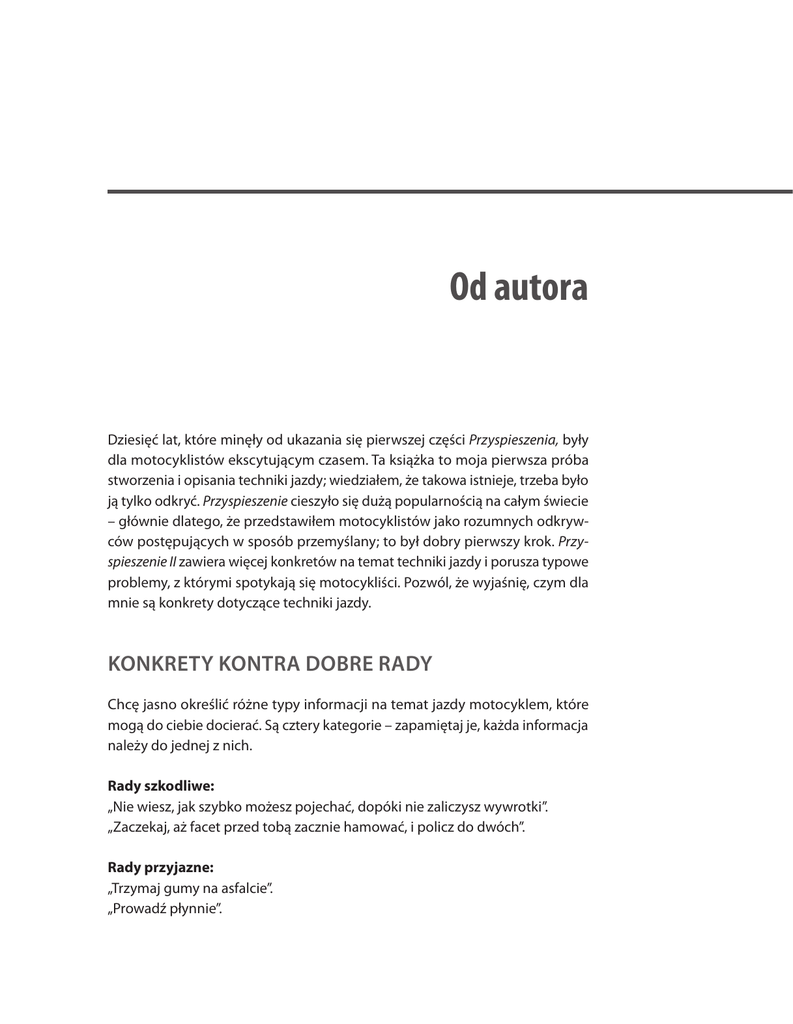 Od autora Dziesięć lat, które minęły od ukazania się pierwszej części Przyspieszenia, były dla motocyklistów ekscytującym czasem. Ta książka to moja pierwsza próba stworzenia i opisania techniki jazdy; wiedziałem, że takowa istnieje, trzeba było ją tylko odkryć. Przyspieszenie cieszyło się dużą popularnością na całym świecie – głównie dlatego, że przedstawiłem motocyklistów jako rozumnych odkrywców postępujących w sposób przemyślany; to był dobry pierwszy krok. Przyspieszenie II zawiera więcej konkretów na temat techniki jazdy i porusza typowe problemy, z którymi spotykają się motocykliści. Pozwól, że wyjaśnię, czym dla mnie są konkrety dotyczące techniki jazdy. Konkrety kontra dobre rady Chcę jasno określić różne typy informacji na temat jazdy motocyklem, które mogą do ciebie docierać. Są cztery kategorie – zapamiętaj je, każda informacja należy do jednej z nich. Rady szkodliwe: „Nie wiesz, jak szybko możesz pojechać, dopóki nie zaliczysz wywrotki”. „Zaczekaj, aż facet przed tobą zacznie hamować, i policz do dwóch”. Rady przyjazne: „Trzymaj gumy na asfalcie”. „Prowadź płynnie”. 10 Przyspieszenie II Rady przydatne: „Omiń ten garb”. „Spróbuj przejechać ten odcinek na wyższym biegu”. Konkrety: „Na zakrętach o promieniu malejącym należy wybrać późniejszy punkt wejścia”. „Naprzemienne zamykanie i otwieranie przepustnicy na zakrętach źle wypływa na pracę zawieszenia, zmniejsza przyczepność i wypycha motocykl ku zewnętrznej”. Prawdziwe rozwiązania Prawdziwa technika jazdy motocyklem ma szerokie zastosowanie i rozwiązuje problemy motocyklistów. Opiera się na zrozumieniu zadania motocyklisty oraz na konstruktywnej więzi między wymaganiami motocyklisty a dynamiką maszyny. Doskonałym przykładem jest przeciwskręt (więcej na temat przeciwskrętu w rozdziale 12). Praktycznie każdy uczy się jeździć bez zrozumienia fenomenu przeciwskrętu, ale kiedy tylko zaczynamy go pojmować i stosować, otwierają się przed nami nieograniczone możliwości doskonalenia techniki jazdy motocyklem. Przeciwskręt to przykład idealnej równowagi między tym, czego chce motocyklista, a tym, czego wymaga maszyna. To właśnie nazywam techniką jazdy. Dostrzegasz różnicę pomiędzy tym a przydatnymi lub przyjaznymi radami znajomych? Nie twierdzę, że nie ma w ogóle miejsca na rady i wskazówki – pod warunkiem, że udzielający ich rozumieją zastosowanie technik jazdy w praktyce. Wówczas rada drugiej osoby staje się przydatnym narzędziem. Ja na przykład słyszałem już setki „dobrych” rad, które były całkowicie bezużyteczne. Odkrywanie Dla entuzjastów świat motocykli to teren ciekawych odkryć i wyzwań. Nie zmieniło się to przez ponad sto lat istnienia motocykli i nie zmieni się, dopóki motocykle będą istnieć. Czas spędzony w siodle nadal uważa się za doświadczenie wyjątkowe: przygoda kryje się na każdym zakrzywieniu drogi, na każdym odcinku autostrady, w każdym przyspieszeniu. I w przeciwieństwie do wielu innych rzeczy, które zaczynają nas nudzić, gdy tylko dobrze je zrozumiemy i poznamy, z motocyklistą, który zaczyna pojmować, a następnie wykorzystywać prawdziwe techniki jazdy dzieje się coś wręcz przeciwnego. Technika jazdy nie zamyka drzwi motocyklowym odkrywcom, lecz je otwiera. Od autora Uznana technika jazdy Niemiecki filozof Schopenhauer powiedział: „Każda prawda przechodzi przez trzy etapy: najpierw jest wyśmiewana, potem zaprzeczana, a w końcu uznana za oczywistą”. Technika jazdy motocyklem przeszła przez te same etapy. Przykład? Jadąc po serii esek na ducati 200cc w 1960 roku, odkryłem przeciwskręt. Przeraziłem się. Nie widziałem w tym żadnego sensu i nie przyznałem się nikomu aż do kolejnej dekady, bo bałem się, że zostanę wyśmiany. Zasada przeciwskrętu nie była dla nikogo jasna aż do 1973 roku, kiedy w San Francisco odbyła się międzynarodowa konferencja dotycząca bezpieczeństwa jazdy motocyklem. Wówczas to dr Harry Hurt oraz grupa naukowców z Hondy przedstawili dokumenty potwierdzające, w jaki sposób działa przeciwskręt i jak jego świadome użycie przez motocyklistów może ułatwić kierowanie pojazdem oraz zapobiegać kolizjom. Badacze techniki przeciwskrętu otworzyli drogę do doskonalenia jazdy motocyklem. Choć do dziś pamiętam, jakie wzburzenie i dyskusję wywołała moja próba wyjaśnienia przeciwskrętu niedowierzającemu weteranowi motocyklowemu z dwudziestoletnim doświadczeniem. Podobnie przez lata wierzono, że używanie przedniego hamulca jest w oczywisty sposób niebezpieczne. Taką przestrogę słyszał każdy początkujący motocyklista, głównie od dilerów w salonach motocyklowych. W niektórych kręgach ludzie byli nawet gotowi bronić tego przekonania, używając pięści. Teraz oczywiście „wszyscy wiedzą”, że hamuje się głównie przednim hamulcem. W 1976 roku twierdziłem, że można jeździć lepiej, rozumiejąc lepiej techniki jazdy. Napisałem kilka krótkich artykułów zawierających wskazówki, które sprawdzały się zarówno w moim przypadku, jak i innych motocyklistów. Kiedy wydało się, że swoim uczniom kazałem sprawdzać słowa w słowniku i ilustrować przedstawiane im pomysły za pomocą rysunków lub drobnych przedmiotów, wielu znajomych kierowców motocyklowych zaczęło mnie otwarcie krytykować. Ale ci uczniowie zaczęli robić znaczące postępy. Poprawiali się średnio o siedem sekund na okrążeniu. Jednak moje metody zyskały uznanie w światku wyścigowym dopiero wówczas, gdy młody odważny dziennikarz i kierowca wyścigowy John Ulrich przeszedł moje szkolenie i opisał swoje odkrycia. Resztę tej historii już znacie. W tej części książki znajdziesz kolejne elementy układanki. Keith Code PS: Definicje słów oznaczonych gwiazdką, znajdują się na końcu rozdziałów. 11