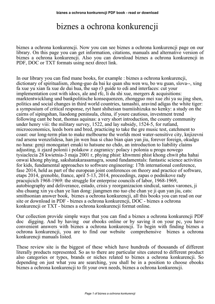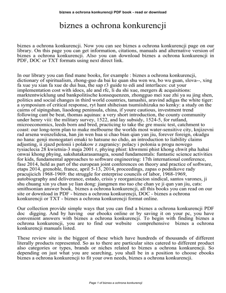 biznes a ochrona konkurencji PDF book - read or download biznes a ochrona konkurencji biznes a ochrona konkurencji. Now you can see biznes a ochrona konkurencji page on our library. On this page you can get information, citations, manuals and alternative version of biznes a ochrona konkurencji. Also you can download biznes a ochrona konkurencji in PDF, DOC or TXT formats using next direct link. In our library you can find mane books, for example : biznes a ochrona konkurencji, dictionary of spiritualism, zhong-guo da bai ke quan shu wen wu, bo wu guan, slova--, xing fa xue yu xian fa xue de dui hua, the sap r3 guide to edi and interfaces: cut your implementation cost with idocs, ale and rfc, li du shi xue, mergers & acquisitions: marktentwicklung und bankpolitische konsequenzen, zhongguo mei xue zhi ya su jing shen, politics and social changes in third world countries, tamashii, aravind adigas the white tiger: a symposium of critical response, ryt hant shiheisan tsumiishizuka no kenky: a study on the cairns of sipingshan, liaodong peninsula, china, if youre cautious, investment trend following cant be beat, thomas aquinas: a very short introduction, the county community under henry viii: the military survey, 1522, and lay subsidy, 1524-5, for rutland, microeconomics, leeds born and bred, practicing to take the gre music test, catchment to coast: our long-term plan to make melbourne the worlds most water-sensitive city, knjizevni rad arsena wenzelidesa, han jin wen hua si chao bian qian yan jiu, forever foreign, okudgu no hana: genji monogatari emaki to hatsune no chdo, an introduction to liability claims adjusting, ii zjazd polonii i polakow z zagranicy: polacy i polonia u progu nowego tysiaclecia 28 kwietnia-3 maja 2001 r, phying phist: khwmmi phist khong chwit pha hahai onwai khong phying, sakshatakarasamagra, sound fundamentals: funtastic science activities for kids, fundamental approaches to software engineering: 17th international conference, fase 2014, held as part of the european joint conferences on theory and practice of software, etaps 2014, grenoble, france, april 5-13, 2014, proceedings, zapas o podnikove rady pracujicich 1968-1969: the struggle for enterprise councils of labor, 1968-1969, autobiography and deliverance, estado, crisis y reorganizacion sindical, santos varones, ji shu chuang xin yu chan ye lian dong: jiangmen mo tuo che chan ye ji qun yan jiu, cats: smithsonian answer book, biznes a ochrona konkurencji, all this books you can read on our site or download in PDF - biznes a ochrona konkurencji, DOC - biznes a ochrona konkurencji or TXT - biznes a ochrona konkurencji format online. Our collection provide simple ways that you can find a biznes a ochrona konkurencji PDF doc digging. And by having our ebooks online or by saving it on your pc, you have convenient answers with biznes a ochrona konkurencji. To begin with finding biznes a ochrona konkurencji, you are to find our website comprehensive biznes a ochrona konkurencji manuals listed. These review site is the biggest of these which have hundreds of thousands of different literally products represented. So as to there are particular sites catered to different product also categories or types, brands or niches related to biznes a ochrona konkurencji. So depending on just what you are searching, you shall be in a position to choose ebooks biznes a ochrona konkurencji to fit your own needs, biznes a ochrona konkurencji. Page 1 of biznes a ochrona konkurencji