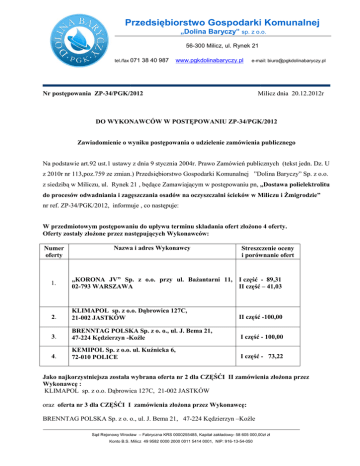 Przedsi biorstwo Gospodarki Komunalnej Przedsiębiorstwo „Dolina Baryczy” sp. z o.o. 56-300 Milicz, ul. Rynek 21 tel./fax 071 38 40 987 www.pgkdolinabaryczy.pl e-mail: mail: [email protected] Nr postępowania ZP-34/PGK/2012 2012 Milicz dnia 20.12.2012r DO WYKONAWCÓW W POSTĘPOWANIU ZP-34/PGK PGK/2012 Zawiadomienie o wyniku postępowania post powania o udzielenie zamówienia publicznego Na podstawie art.92 ust.1 ustawy z dnia 9 stycznia 2004r. Prawo Zamówień Zamówie publicznych (tekst jedn. Dz. U z 2010r nr 113,poz.759 ze zmian.) Przedsiębiorstwo biorstwo Gospodarki Komunalnej ”Dolina Baryczy” Sp. z o.o. z siedzibą w Miliczu, ul. Rynek 21 , będące b Zamawiającym w postępowaniu pn, „Dostawa polielektrolitu do procesów odwadniania i zagęszczania zagę osadów na oczyszczalni ścieków cieków w Miliczu i Żmigrodzie” nr ref. ZP-34/PGK/2012, 2012, informuje , co następuje: nast W przedmiotowym postępowaniu powaniu do upływu terminu składania ofert zło złożono żono 4 oferty. Oferty zostały złożone one przez nast następujących Wykonawców: Numer oferty Nazwa i adres Wykonawcy Streszczenie oceny i porównanie ofert 1. „KORONA JV” Sp. z o.o. przy ul. Bażantarni Ba 11, I część ęść - 89,31 02-793 793 WARSZAWA II część ęść – 41,03 2. KLIMAPOL sp. z o.o. Dąbrowica D 127C, 21-002 JASTKÓW II część ęść -100,00 3. BRENNTAG POLSKA Sp. z o. o., ul. J. Bema 21, 47-224 Kędzierzyn -Ko Koźle I część ęść - 100,00 4. KEMIPOL Sp. z o.o. ul. Kuźnicka Ku 6, 72-010 POLICE I część ęść - 73,22 Jako najkorzystniejsza została wybrana oferta nr 2 dla CZĘŚĆII II zamówienia złożona przez Wykonawcę : KLIMAPOL sp. z o.o. Dąbrowica browica 127C, 21 21-002 JASTKÓW oraz oferta nr 3 dla CZĘŚĆI ĘŚĆI I zamówienia złożona przez Wykonawcę: BRENNTAG POLSKA Sp. z o. o., ul. J. Bema 21, 47-224 47 Kędzierzyn –Koźle Sąd d Rejonowy Wrocław – Fabryczna KRS 0000255485, Kapitał zakładowy- 58 605 000,00zł 00,00zł zł Konto B.S. Milicz 49 9582 0000 2000 0011 5414 0001, NIP: 916-13-54-050 Uzasadnienie wyboru: Wykonawcy spełniają wszystkie warunki udziału w postępowaniu określone w SIWZ. Oferty złożone przez ww. Wykonawców zostały sporządzone prawidłowo i nie podlegają odrzuceniu. Wybrane oferty zawierają najniższą cenę wykonania zamówienia spośród ważnych ofert, a cena była jedynym przyjętym przez Zamawiającego kryterium oceny ofert. Cena ofert mieści się w kwocie jaką Zamawiający zamierzał przeznaczyć na sfinansowanie zamówienia. Prezes Zarządu /-/Zbigniew Węgrzyn Sąd Rejonowy Wrocław – Fabryczna KRS 0000255485, Kapitał zakładowy- 58 605 000,00zł zł Konto B.S. Milicz 49 9582 0000 2000 0011 5414 0001, NIP: 916-13-54-050