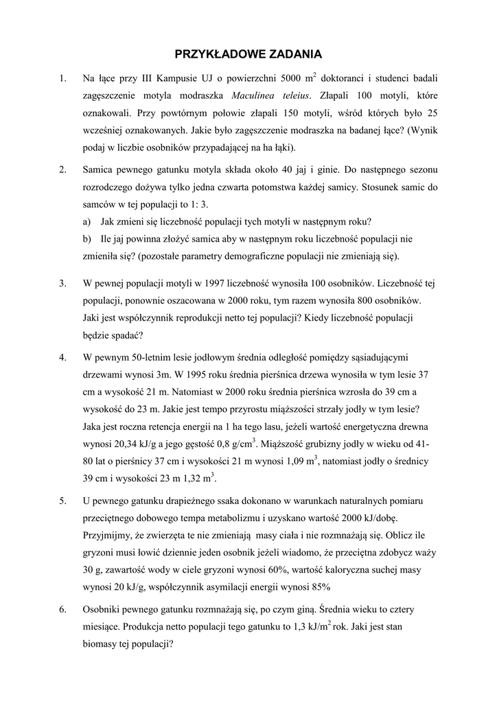 PRZYKŁADOWE ZADANIA 1. Na łące przy III Kampusie UJ o powierzchni 5000 m2 doktoranci i studenci badali zagęszczenie motyla modraszka Maculinea teleius. Złapali 100 motyli, które oznakowali. Przy powtórnym połowie złapali 150 motyli, wśród których było 25 wcześniej oznakowanych. Jakie było zagęszczenie modraszka na badanej łące? (Wynik podaj w liczbie osobników przypadającej na ha łąki). 2. Samica pewnego gatunku motyla składa około 40 jaj i ginie. Do następnego sezonu rozrodczego dożywa tylko jedna czwarta potomstwa każdej samicy. Stosunek samic do samców w tej populacji to 1: 3. a) Jak zmieni się liczebność populacji tych motyli w następnym roku? b) Ile jaj powinna złożyć samica aby w następnym roku liczebność populacji nie zmieniła się? (pozostałe parametry demograficzne populacji nie zmieniają się). 3. W pewnej populacji motyli w 1997 liczebność wynosiła 100 osobników. Liczebność tej populacji, ponownie oszacowana w 2000 roku, tym razem wynosiła 800 osobników. Jaki jest współczynnik reprodukcji netto tej populacji? Kiedy liczebność populacji będzie spadać? 4. W pewnym 50-letnim lesie jodłowym średnia odległość pomiędzy sąsiadującymi drzewami wynosi 3m. W 1995 roku średnia pierśnica drzewa wynosiła w tym lesie 37 cm a wysokość 21 m. Natomiast w 2000 roku średnia pierśnica wzrosła do 39 cm a wysokość do 23 m. Jakie jest tempo przyrostu miąższości strzały jodły w tym lesie? Jaka jest roczna retencja energii na 1 ha tego lasu, jeżeli wartość energetyczna drewna wynosi 20,34 kJ/g a jego gęstość 0,8 g/cm3. Miąższość grubizny jodły w wieku od 4180 lat o pierśnicy 37 cm i wysokości 21 m wynosi 1,09 m3, natomiast jodły o średnicy 39 cm i wysokości 23 m 1,32 m3. 5. U pewnego gatunku drapieżnego ssaka dokonano w warunkach naturalnych pomiaru przeciętnego dobowego tempa metabolizmu i uzyskano wartość 2000 kJ/dobę. Przyjmijmy, że zwierzęta te nie zmieniają masy ciała i nie rozmnażają się. Oblicz ile gryzoni musi łowić dziennie jeden osobnik jeżeli wiadomo, że przeciętna zdobycz waży 30 g, zawartość wody w ciele gryzoni wynosi 60%, wartość kaloryczna suchej masy wynosi 20 kJ/g, współczynnik asymilacji energii wynosi 85% 6. Osobniki pewnego gatunku rozmnażają się, po czym giną. Średnia wieku to cztery miesiące. Produkcja netto populacji tego gatunku to 1,3 kJ/m2 rok. Jaki jest stan biomasy tej populacji?