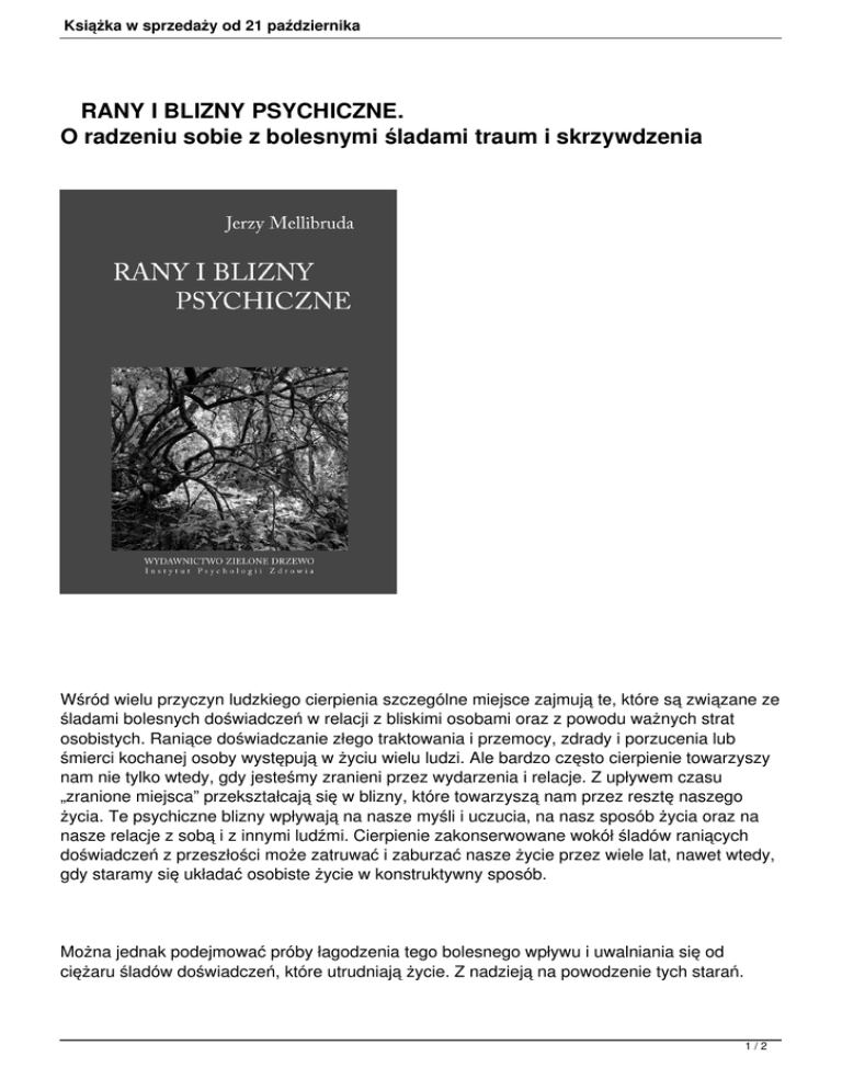 Książka w sprzedaży od 21 października RANY I BLIZNY PSYCHICZNE. O radzeniu sobie z bolesnymi śladami traum i skrzywdzenia Wśród wielu przyczyn ludzkiego cierpienia szczególne miejsce zajmują te, które są związane ze śladami bolesnych doświadczeń w relacji z bliskimi osobami oraz z powodu ważnych strat osobistych. Raniące doświadczanie złego traktowania i przemocy, zdrady i porzucenia lub śmierci kochanej osoby występują w życiu wielu ludzi. Ale bardzo często cierpienie towarzyszy nam nie tylko wtedy, gdy jesteśmy zranieni przez wydarzenia i relacje. Z upływem czasu „zranione miejsca” przekształcają się w blizny, które towarzyszą nam przez resztę naszego życia. Te psychiczne blizny wpływają na nasze myśli i uczucia, na nasz sposób życia oraz na nasze relacje z sobą i z innymi ludźmi. Cierpienie zakonserwowane wokół śladów raniących doświadczeń z przeszłości może zatruwać i zaburzać nasze życie przez wiele lat, nawet wtedy, gdy staramy się układać osobiste życie w konstruktywny sposób. Można jednak podejmować próby łagodzenia tego bolesnego wpływu i uwalniania się od ciężaru śladów doświadczeń, które utrudniają życie. Z nadzieją na powodzenie tych starań. 1/2 Książka w sprzedaży od 21 października Można to robić samemu i można korzystać z pomocy innych, którzy są przygotowani do wspierania naszych poszukiwań potrzebnych do uwalniania się spod wpływu śladów złej przeszłości. RANY I BLIZNY PSYCHICZNE, książka Jerzego Mellibrudy, pokazuje takie możliwości i pomaga w lepszym zrozumieniu przyczyn cierpień związanych z obecnością tych śladów w naszej psychice i w naszym życiu. 2/2
