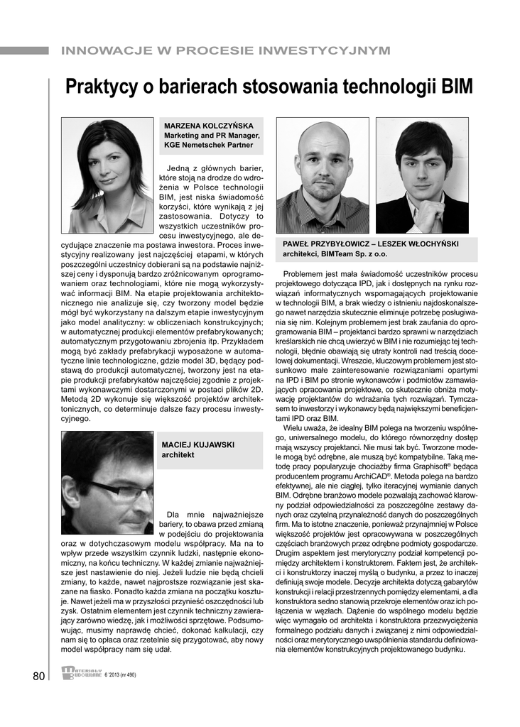 INNOWACJE W PROCESIE INWESTYCYJNYM Praktycy o barierach stosowania technologii BIM MARZENA KOLCZYŃSKA Marketing and PR Manager, KGE Nemetschek Partner Jed ną z głów nych ba rier, które stoją na drodze do wdroże nia w Pol sce technologii BIM, jest niska świadomość korzyści, które wynikają z jej za sto so wa nia. Do ty czy to wszystkich uczestników procesu inwestycyjnego, ale decydujące znaczenie ma postawa inwestora. Proces inwestycyjny realizowany jest najczęściej etapami, w których poszczególni uczestnicy dobierani są na podstawie najniższej ceny i dysponują bardzo zróżnicowanym oprogramowaniem oraz technologiami, które nie mogą wykorzystywać informacji BIM. Na etapie projektowania architektonicznego nie analizuje się, czy tworzony model będzie mógł być wykorzystany na dalszym etapie inwestycyjnym jako model analityczny: w obliczeniach konstrukcyjnych; w automatycznej produkcji elementów prefabrykowanych; automatycznym przygotowaniu zbrojenia itp. Przykładem mogą być zakłady prefabrykacji wyposażone w automatyczne linie technologiczne, gdzie model 3D, będący podstawą do produkcji automatycznej, tworzony jest na etapie produkcji prefabrykatów najczęściej zgodnie z projektami wykonawczymi dostarczonymi w postaci plików 2D. Metodą 2D wykonuje się większość projektów architektonicznych, co determinuje dalsze fazy procesu inwestycyjnego. MACIEJ KUJAWSKI architekt Dla mnie najważniejsze bariery, to obawa przed zmianą w podejściu do projektowania oraz w dotychczasowym modelu współpracy. Ma na to wpływ przede wszystkim czynnik ludzki, następnie ekonomiczny, na końcu techniczny. W każdej zmianie najważniejsze jest nastawienie do niej. Jeżeli ludzie nie będą chcieli zmiany, to każde, nawet najprostsze rozwiązanie jest skazane na fiasko. Ponadto każda zmiana na początku kosztuje. Nawet jeżeli ma w przyszłości przynieść oszczędności lub zysk. Ostatnim elementem jest czynnik techniczny zawierający zarówno wiedzę, jak i możliwości sprzętowe. Podsumowując, musimy naprawdę chcieć, dokonać kalkulacji, czy nam się to opłaca oraz rzetelnie się przygotować, aby nowy model współpracy nam się udał. 80 6 ’2013 (nr 490) PAWEŁ PRZYBYŁOWICZ – LESZEK WŁOCHYŃSKI architekci, BIMTeam Sp. z o.o. Problemem jest mała świadomość uczestników procesu projektowego dotycząca IPD, jak i dostępnych na rynku rozwiązań informatycznych wspomagających projektowanie w technologii BIM, a brak wiedzy o istnieniu najdoskonalszego nawet narzędzia skutecznie eliminuje potrzebę posługiwania się nim. Kolejnym problemem jest brak zaufania do oprogramowania BIM – projektanci bardzo sprawni w narzędziach kreślarskich nie chcą uwierzyć w BIM i nie rozumiejąc tej technologii, błędnie obawiają się utraty kontroli nad treścią docelowej dokumentacji. Wreszcie, kluczowym problemem jest stosunkowo małe zainteresowanie rozwiązaniami opartymi na IPD i BIM po stronie wykonawców i podmiotów zamawiających opracowania projektowe, co skutecznie obniża motywację projektantów do wdrażania tych rozwiązań. Tymczasem to inwestorzy i wykonawcy będą największymi beneficjentami IPD oraz BIM. Wielu uważa, że idealny BIM polega na tworzeniu wspólnego, uniwersalnego modelu, do którego równorzędny dostęp mają wszyscy projektanci. Nie musi tak być. Tworzone modele mogą być odrębne, ale muszą być kompatybilne. Taką metodę pracy popularyzuje chociażby firma Graphisoft® będąca producentem programu ArchiCAD®. Metoda polega na bardzo efektywnej, ale nie ciągłej, tylko iteracyjnej wymianie danych BIM. Odrębne branżowo modele pozwalają zachować klarowny podział odpowiedzialności za poszczególne zestawy danych oraz czytelną przynależność danych do poszczególnych firm. Ma to istotne znaczenie, ponieważ przynajmniej w Polsce większość projektów jest opracowywana w poszczególnych częściach branżowych przez odrębne podmioty gospodarcze. Drugim aspektem jest merytoryczny podział kompetencji pomiędzy architektem i konstruktorem. Faktem jest, że architekci i konstruktorzy inaczej myślą o budynku, a przez to inaczej definiują swoje modele. Decyzje architekta dotyczą gabarytów konstrukcji i relacji przestrzennych pomiędzy elementami, a dla konstruktora sedno stanowią przekroje elementów oraz ich połączenia w węzłach. Dążenie do wspólnego modelu będzie więc wymagało od architekta i konstruktora przezwyciężenia formalnego podziału danych i związanej z nimi odpowiedzialności oraz merytorycznego uwspólnienia standardu definiowania elementów konstrukcyjnych projektowanego budynku.