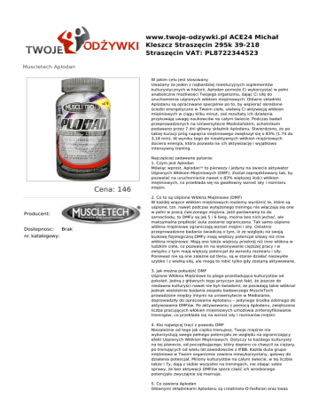 www.twoje-odzywki.pl ACE24 Michał Kleszcz Straszęcin 295k 39-218 Straszęcin VAT: PL8722344523 Muscletech Aplodan W jakim celu jest stosowany Uważany za jeden z najbardziej rewolucyjnych suplementów kulturystycznych w historii, Aplodan pomoże Ci wykorzystać w pełni anaboliczne możliwości Twojego organizmu, dając Ci siłę do uruchomienia uśpionych włókien mięśniowych. Główne składniki Aplodanu są opracowane specjalnie po to, by wspierać określone ścieżki energetyczne w Twoim ciele, ułatwią Ci aktywację włókien mięśniowych w ciągu kilku minut, zaś rezultaty ich działania przykuwają uwagę naukowców na całym świecie. Podczas badań przeprowadzonych na Uniwersytecie Mediolańskim, ochotnikom podawano przez 7 dni główny składnik Aplodanu. Stwierdzono, że po takiej kuracji próg napięcia mięśniowego zwiększył się o 83% (1.74 do 3.18 min). W wyniku tego do nieaktywnych włókien mięśniowych dociera energia, która pozwala na ich aktywizację i wyjątkowo intensywny trening. Cena: 146 Producent: Dostepnosc: nr. katalogowy: Brak Najczęściej zadawane pytania: 1. Czym jest Aplodan Mówiąc wprost, Aplodan to pierwszy i jedyny na świecie aktywator Uśpionych Włókien Mięśniowych (DMF). Został zaprojektowany tak, by pozwalać na uruchomienie nawet o 83% większej ilości włókien mięśniowych, co przekłada się na gwałtowny wzrost siły i rozmiaru mięśni. 2. Co to są Uśpione Włókna Mięśniowe (DMF) W każdej wiązce włókien mięśniowych możemy wyróżnić te, które są uśpione, tzn. nawet podczas wytężonego treningu nie włączają się one w pełni w pracę ćwiczonego mięśnia. Jeśli porównamy to do samochodu, to DMFy są jak 5 i 6 bieg, można bez nich jechać, ale maksymalna prędkość auta zostanie ograniczona. Tak samo uśpione włókna mięśniowe ograniczają wzrost mięśni i siły. Ostatnio przeprowadzone badania świadczą o tym, iż ze względu na swoją budowę fizjologiczną DMFy mają większy potencjał siłowy niż inne włókna mięśniowe. Mają one także większy przekrój niż inne włókna w ludzkim ciele, co pozwala im na wykonywanie cięższej pracy i w związku z tym mają większy potencjał do wzrostu rozmiaru i siły. Ponieważ nie są one zależne od tlenu, są w stanie działać niezwykle szybko i z wielką siłą, ale mogą to robić tylko gdy zostaną aktywowane. 3. Jak można pobudzić DMF Uśpione Włókna Mięśniowe to plaga prześladująca kulturystów od pokoleń. Jedną z głównych tego przyczyn jest fakt, że jeszcze do niedawna kulturyści nawet nie byli świadomi, że posiadają takie włókna! Jednak wieloletnie badania zespołu badawczego MuscleTech prowadzone między innymi na uniwersytecie w Mediolanie, doprowadziły do opracowania Aplodanu – jedynego środka zdolnego do aktywowania DMFów. Po aktywowaniu z pomocą Aplodanu, zwiększona liczba pracujących włókien mięśniowych umożliwia zintensyfikowanie treningów, co przekłada się na wzrost siły i rozmiarów mięśni. 4. Kto najwięcej traci z powodu DMF Niezależnie od tego jak ciężko trenujesz, Twoje mięśnie nie wykorzystują swego pełnego potencjału ze względu na ograniczający efekt Uśpionych Włókien Mięśniowych. Dotyczy to każdego kulturysty na tej planecie, od początkującego, który dopiero co chwycił za ciężary, po trenujących od wielu lat zawodowców z IFBB. Każda duża grupa mięśniowa w Twoim organizmie zawiera niewykorzystany, gotowy do działania potencjał. Miliony kulturystów na całym świecie, w tej liczbie także i Ty, dają z siebie wszystko na treningach, nie zdając sobie sprawy, że bez aktywacji DMFów spora część ich wrodzonego potencjału zwyczajnie się marnuje. 5. Co zawiera Aplodan Głównymi składnikami Aplodanu są creatinolo-O-fosforan oraz kwas liponowy. Taka mieszanka składników jest w stanie pobudzić Uśpione Włókna mięśniowe do działania, co pozwala na używanie o 83% większej ilości włókien mięśniowych w czasie treningu. To się nazywa: uwolnić swój potencjał! 6. Co sprawia, że Aplodan jest taki przełomowy Aplodan nie byłby kompletny bez systemu szybkiego dostarczania powyższych związków do organizmu. Dlatego też wyposażyli Aplodan w technologię szybkiego uwalniania. Ta niezwykle zaawansowana technologia zapewnia szybki transport składników aktywnych Aplodan do mięśni, gdzie efekt ich działania jest najbardziej widoczny. 7. Jak działa Aplodan Gdy tylko przyjmiesz Aplodan, jego składniki zostaną uwolnione do organizmu dzięki technologii szybkiego rozprzestrzeniania i natychmiast zaczną otaczać tkankę mięśni szkieletowych, w tym DMF, które do tej pory nie były w pełni aktywowane. Następnie Aplodan przedostaje się przez błony komórek mięśni szkieletowych i dostaje się w głąb włókien mięśniowych. Zaczyna uruchamiać określone ścieżki energetyczne w Twoim organizmie, ułatwiając tym samym aktywację DMFów. Dzięki dostarczonej przez suplement mocy, mięśnie te bardziej udzielają się podczas intensywnego treningu, pozwalając na pracę z większymi ciężarami i przyczyniając się do zwiększenia suchej masy mięśniowej! 8. Jakich rezultatów mogę oczekiwać po Aplodan Testy kliniczne udowodniły, że Aplodan pozwala na uruchomienie do 83% większej ilości włókien mięśniowych, co pozwala wyrwać się z zastoju i pobić swoje rekordy. Nawet Jay Cutler, triumfator zawodów Mr. Oympia 2006, zarzeka się, że to potęga zawarta w Apodanie pomogła mu sięgnąć po to najwyższe trofeum w kulturystycznym świecie. „ Będąc częścią mojego programu suplementacji, Aplodan pomógł mi dobudować kilogramy twardych jak skała mięśni i zdecydowanie miał swój udział w moim triumfie na Mr. Olympia 2006. Nie tylko zwyciężyłem w tych zawodach, ale też uczyniłem to będąc w życiowej formie, co też jest zasługą Aplodanu”. Jeśli taka gwiazda jak Jay Cutler może zwiększyć masę mi
