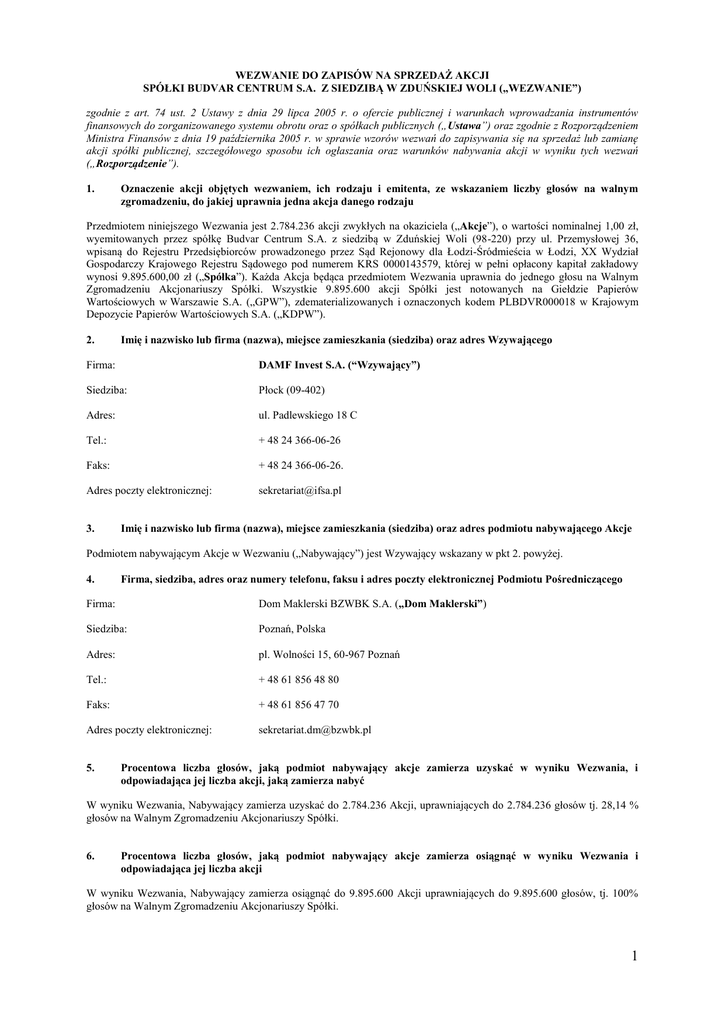 WEZWANIE DO ZAPISÓW NA SPRZEDAŻ AKCJI SPÓŁKI BUDVAR CENTRUM S.A. Z SIEDZIBĄ W ZDUŃSKIEJ WOLI („WEZWANIE”) zgodnie z art. 74 ust. 2 Ustawy z dnia 29 lipca 2005 r. o ofercie publicznej i warunkach wprowadzania instrumentów finansowych do zorganizowanego systemu obrotu oraz o spółkach publicznych („Ustawa”) oraz zgodnie z Rozporządzeniem Ministra Finansów z dnia 19 października 2005 r. w sprawie wzorów wezwań do zapisywania się na sprzedaż lub zamianę akcji spółki publicznej, szczegółowego sposobu ich ogłaszania oraz warunków nabywania akcji w wyniku tych wezwań („Rozporządzenie”). 1. Oznaczenie akcji objętych wezwaniem, ich rodzaju i emitenta, ze wskazaniem liczby głosów na walnym zgromadzeniu, do jakiej uprawnia jedna akcja danego rodzaju Przedmiotem niniejszego Wezwania jest 2.784.236 akcji zwykłych na okaziciela („Akcje”), o wartości nominalnej 1,00 zł, wyemitowanych przez spółkę Budvar Centrum S.A. z siedzibą w Zduńskiej Woli (98-220) przy ul. Przemysłowej 36, wpisaną do Rejestru Przedsiębiorców prowadzonego przez Sąd Rejonowy dla Łodzi-Śródmieścia w Łodzi, XX Wydział Gospodarczy Krajowego Rejestru Sądowego pod numerem KRS 0000143579, której w pełni opłacony kapitał zakładowy wynosi 9.895.600,00 zł („Spółka”). Każda Akcja będąca przedmiotem Wezwania uprawnia do jednego głosu na Walnym Zgromadzeniu Akcjonariuszy Spółki. Wszystkie 9.895.600 akcji Spółki jest notowanych na Giełdzie Papierów Wartościowych w Warszawie S.A. („GPW”), zdematerializowanych i oznaczonych kodem PLBDVR000018 w Krajowym Depozycie Papierów Wartościowych S.A. („KDPW”). 2. Imię i nazwisko lub firma (nazwa), miejsce zamieszkania (siedziba) oraz adres Wzywającego Firma: DAMF Invest S.A. (“Wzywający”) Siedziba: Płock (09-402) Adres: ul. Padlewskiego 18 C Tel.: + 48 24 366-06-26 Faks: + 48 24 366-06-26. Adres poczty elektronicznej: [email protected] 3. Imię i nazwisko lub firma (nazwa), miejsce zamieszkania (siedziba) oraz adres podmiotu nabywającego Akcje Podmiotem nabywającym Akcje w Wezwaniu („Nabywający”) jest Wzywający wskazany w pkt 2. powyżej. 4. Firma, siedziba, adres oraz numery telefonu, faksu i adres poczty elektronicznej Podmiotu Pośredniczącego Firma: Dom Maklerski BZWBK S.A. („Dom Maklerski”) Siedziba: Poznań, Polska Adres: pl. Wolności 15, 60-967 Poznań Tel.: + 48 61 856 48 80 Faks: + 48 61 856 47 70 Adres poczty elektronicznej: [email protected] 5. Procentowa liczba głosów, jaką podmiot nabywający akcje zamierza uzyskać w wyniku Wezwania, i odpowiadająca jej liczba akcji, jaką zamierza nabyć W wyniku Wezwania, Nabywający zamierza uzyskać do 2.784.236 Akcji, uprawniających do 2.784.236 głosów tj. 28,14 % głosów na Walnym Zgromadzeniu Akcjonariuszy Spółki. 6. Procentowa liczba głosów, jaką podmiot nabywający akcje zamierza osiągnąć w wyniku Wezwania i odpowiadająca jej liczba akcji W wyniku Wezwania, Nabywający zamierza osiągnąć do 9.895.600 Akcji uprawniających do 9.895.600 głosów, tj. 100% głosów na Walnym Zgromadzeniu Akcjonariuszy Spółki. 1 7. Określenie proporcji, w jakich nastąpi nabycie akcji przez każdy z podmiotów nabywających akcje – jeżeli akcje zamierza nabywać więcej niż jeden podmiot Nie dotyczy, Akcje będzie nabywać tylko Nabywający. 8. Cena, po której nabywane będą akcje objęte Wezwaniem Akcje objęte Wezwaniem zostaną nabyte po cenie 2,09 zł (słownie: dwa złote 09/100) każda („Cena Akcji w Wezwaniu”). 9. Cena, od której zgodnie z art. 79 ust. 1, 2 i 3 Ustawy nie może być niższa cena określona w punkcie 8 powyżej, ze wskazaniem podstawy ustalenia tej ceny Cena wskazana w punkcie 8 nie jest niższa niż minimalna cena określona zgodnie z art. 79 ust. 1, 2 i 3 Ustawy. Średnia cena rynkowa Akcji Spółki z okresu ostatnich 3 (trzech) miesięcy poprzedzających ogłoszenie Wezwania, w czasie których dokonywany był obrót Akcjami Spółki na rynku głównym GPW, obliczona zgodnie z art. 79 ust. 7 Ustawy, od której nie może być niższa Cena Akcji w Wezwaniu, wynosi 2,02 zł (słownie: dwa złote 02/100). Średnia cena rynkowa Akcji Spółki z okresu ostatnich 6 (sześciu) miesięcy poprzedzających ogłoszenie Wezwania, w czasie których dokonywany był obrót Akcjami Spółki na rynku głównym GPW, obliczona zgodnie z art. 79 ust. 7 Ustawy, od której nie może być niższa Cena Akcji w Wezwaniu, wynosi 1,79 zł (słownie: jeden złoty 79/100). W okresie 12 (dwunastu) miesięcy poprzedzających Wezwanie Wzywający, ani żaden członek grupy kapitałowej podmiotów dominujących wobec Wzywającego nie nabywał Akcji Spółki po cenie wyższej niż Cena Akcji w Wezwaniu. Wzywający w okresie 12 (dwunastu) miesięcy poprzedzających Wezwanie nabywał przez swoje podmioty zależne akcje Spółki po maksymalnej cenie 2,08 zł (dwa złote 08/100) za każdą akcję. Wzywający ani jego podmioty dominujące i zależne nie są ani nie byli stronami umowy, o której mowa w art. 87 ust. 1 punkt 5 Ustawy. 10. Termin przeprowadzenia wezwania, w tym termin przyjmowania zapisów na akcje objęte wezwaniem, ze wskazaniem, czy i przy spełnieniu jakich warunków nastąpi skrócenie lub przedłużenie terminu przyjmowania zapisów Data ogłoszenia wezwania: 16.05.2014 r. Data rozpoczęcia zapisów: 05.06.2014 r. Data zakończenia zapisów: 04.07.2014 r. Okres przyjmowania zapisów nie może ulec skróceniu. Okres przyjmowania zapisów może zostać przedłużony do 70 (siedemdziesięciu) dni, o ile Wzywający uzna, kierując się wyłącznie własną oceną, że jest to konieczne do osiągnięcia celu Wezwania. 11. Wskazanie podmiotu dominującego wobec Wzywającego Podmiotami dominującymi wobec Wzywającego w rozumieniu Ustawy są Pan Mariusz Patrowicz,z Pan Damian Patrowicz oraz spółka IFEA Sp. z o.o. w organizacji z siedzibą w Płocku. Pan Mariusz Patrowicz jako podmiot osobiście uprawniony do powoływania, za