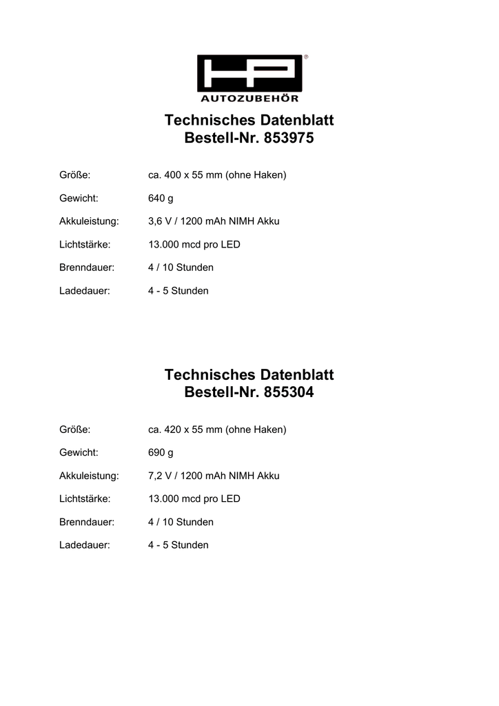 Technisches Datenblatt Bestell-Nr. 853975 Größe: ca. 400 x 55 mm (ohne Haken) Gewicht: 640 g Akkuleistung: 3,6 V / 1200 mAh NIMH Akku Lichtstärke: 13.000 mcd pro LED Brenndauer: 4 / 10 Stunden Ladedauer: 4 - 5 Stunden Technisches Datenblatt Bestell-Nr. 855304 Größe: ca. 420 x 55 mm (ohne Haken) Gewicht: 690 g Akkuleistung: 7,2 V / 1200 mAh NIMH Akku Lichtstärke: 13.000 mcd pro LED Brenndauer: 4 / 10 Stunden Ladedauer: 4 - 5 Stunden